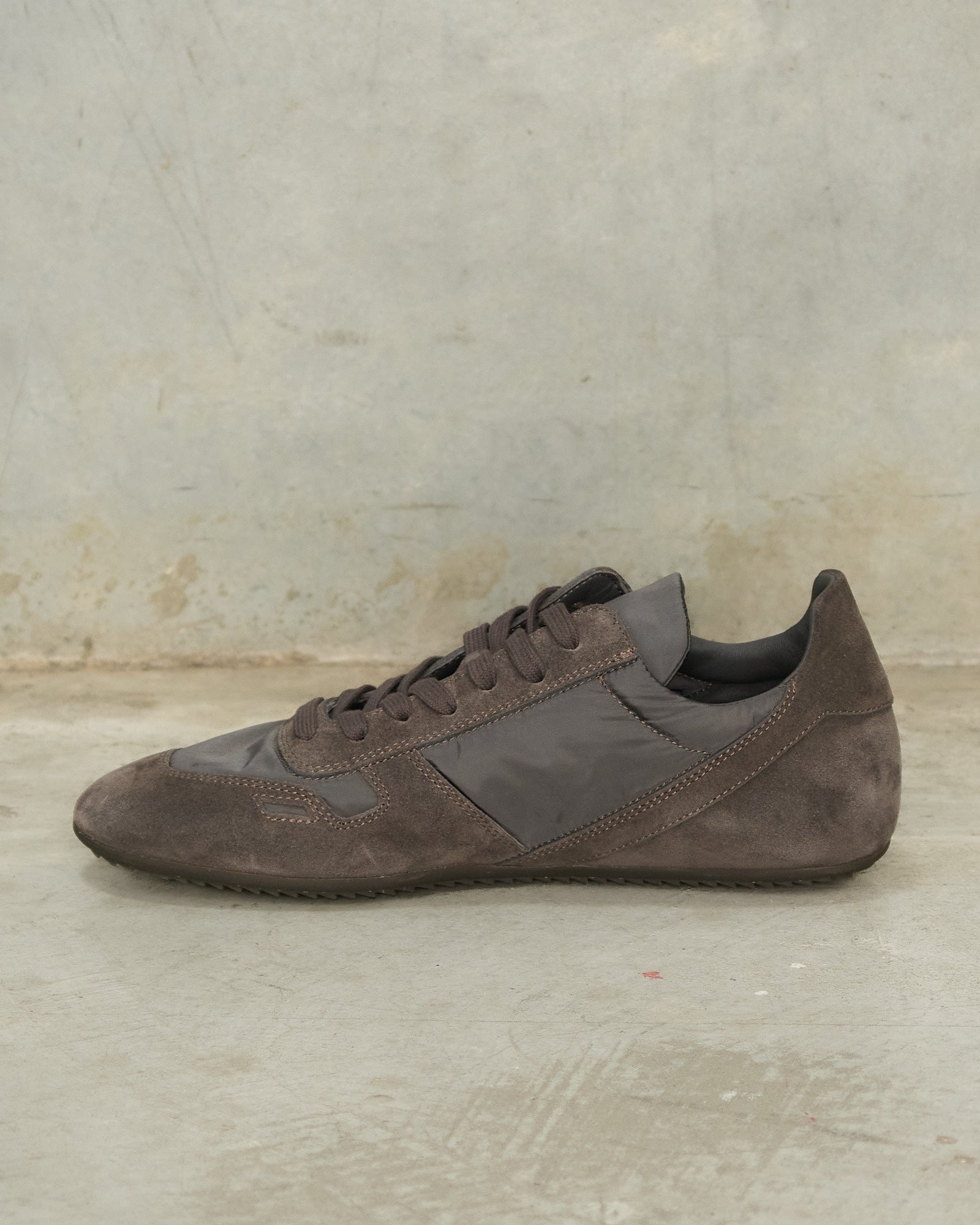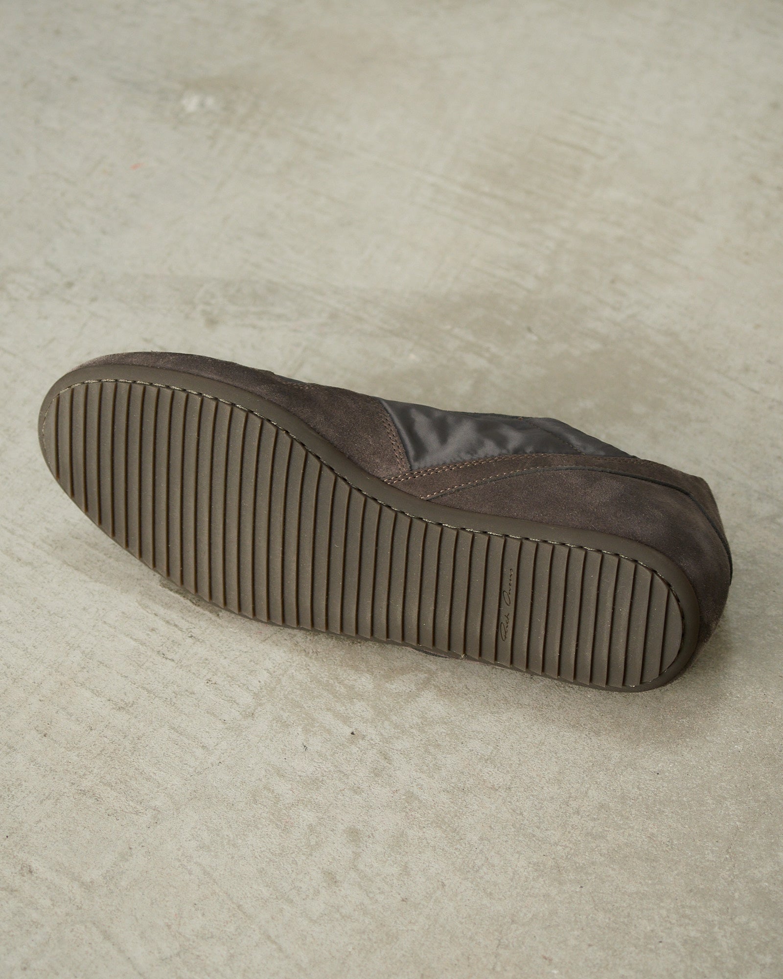 Minimal sneakers by Rick Owens in dark dust. Rick Owens' take on the flat sneaker silhouette, styled with panels of nylon and calf leather suede.