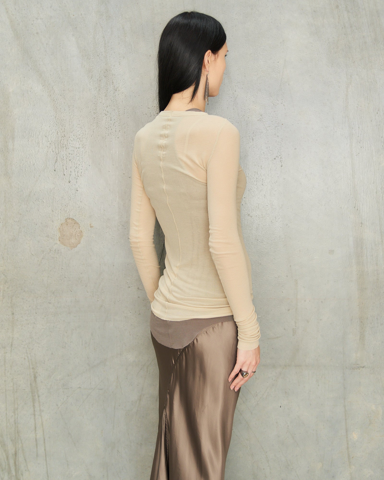 Ribbed long sleeve top by Rick Owens in sand. A sultry silhouette in fine ribbed knit, dyed in a light beige hue. Long, slender sleeves and a soft scoop neckline trace the collarbones with understated elegance.