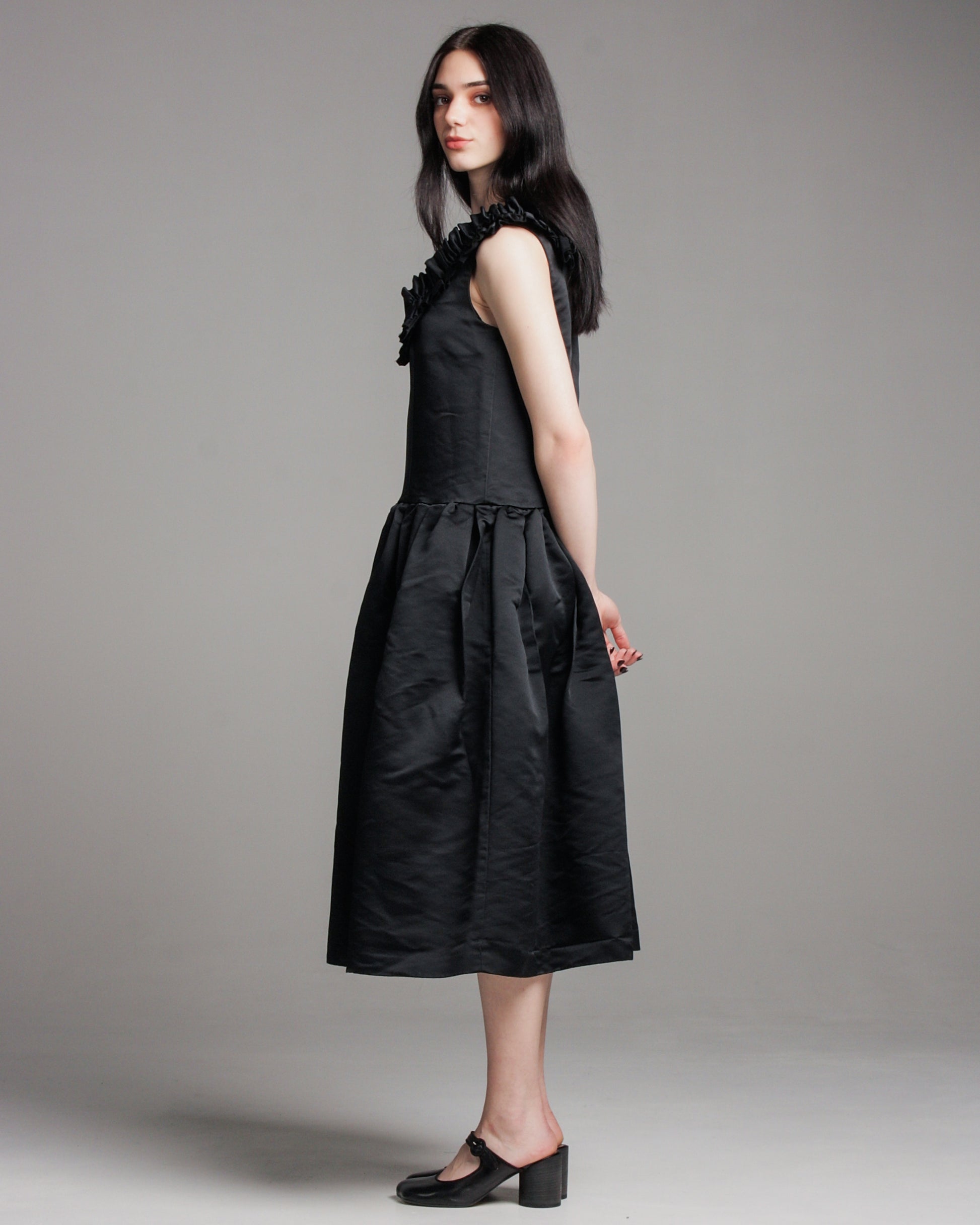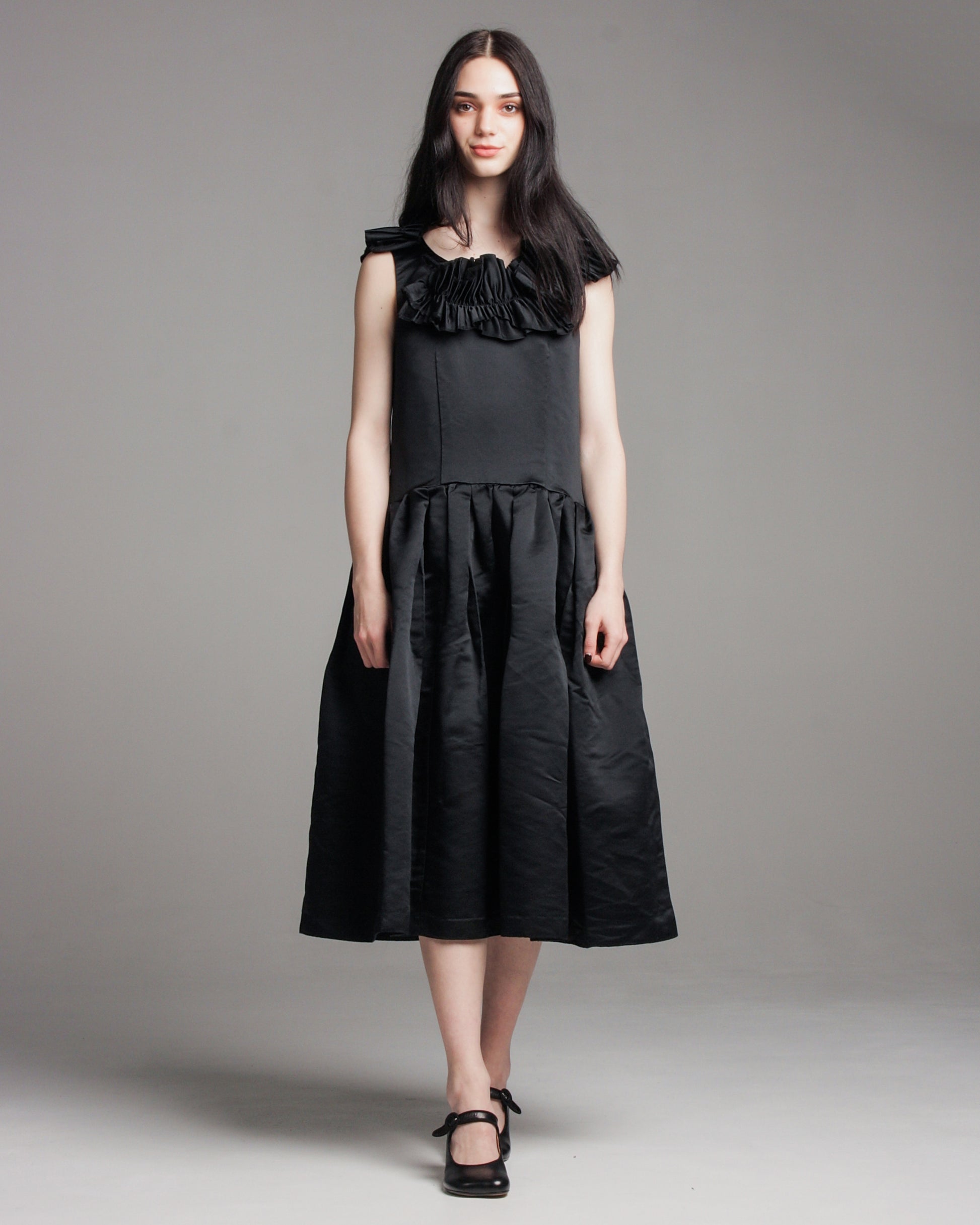 Ruffle dress by Comme des Garçons Comme des Garçons. Satined pinafore style with elaborate ruffle appliqué coiling across the scooped neckline. Defined gathering at the waist opens up to a voluminous A-line skirt. Romantic and enchanting, elevated by modern fabrication.