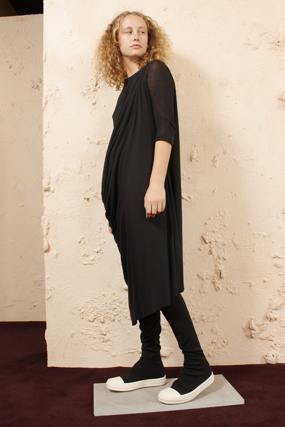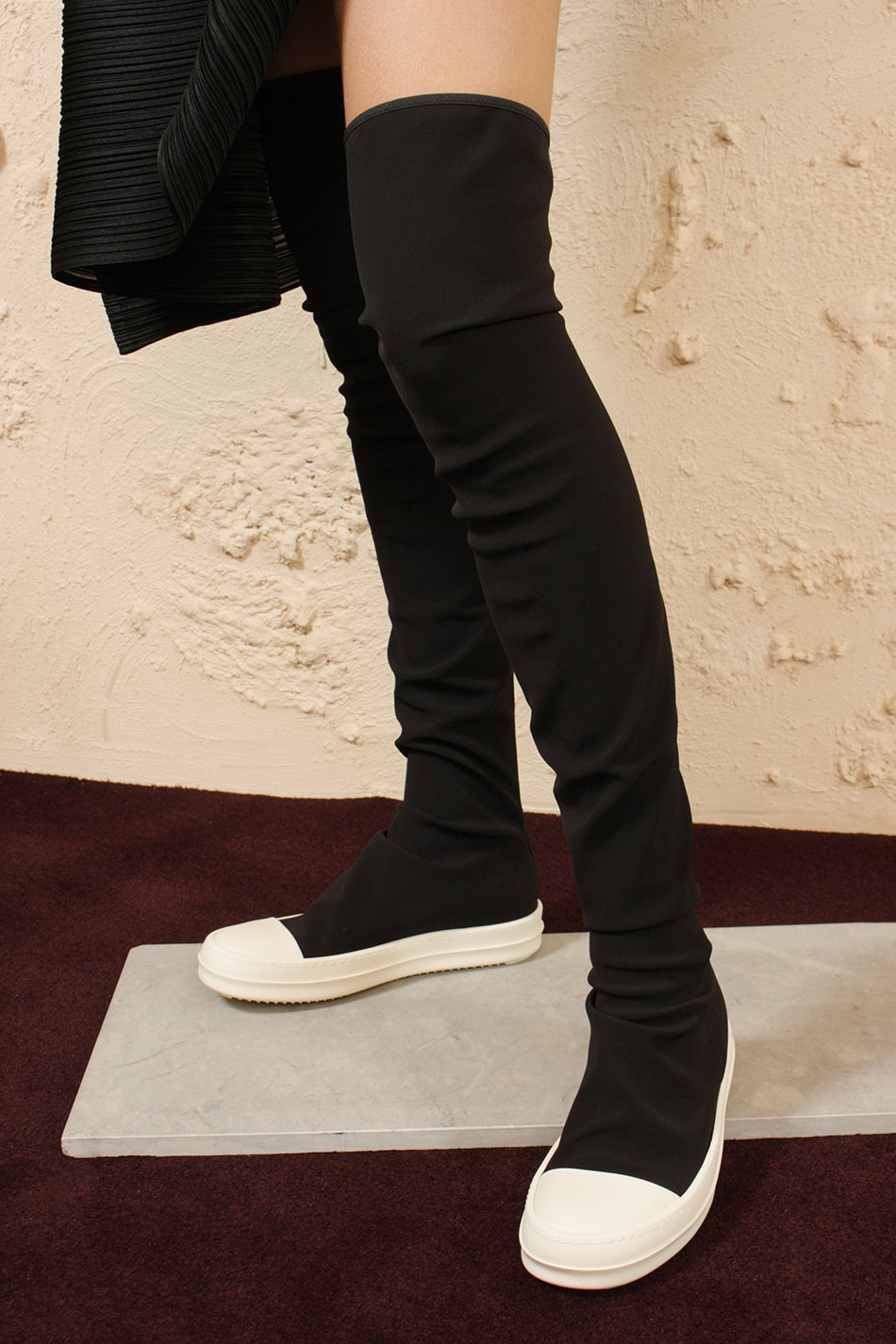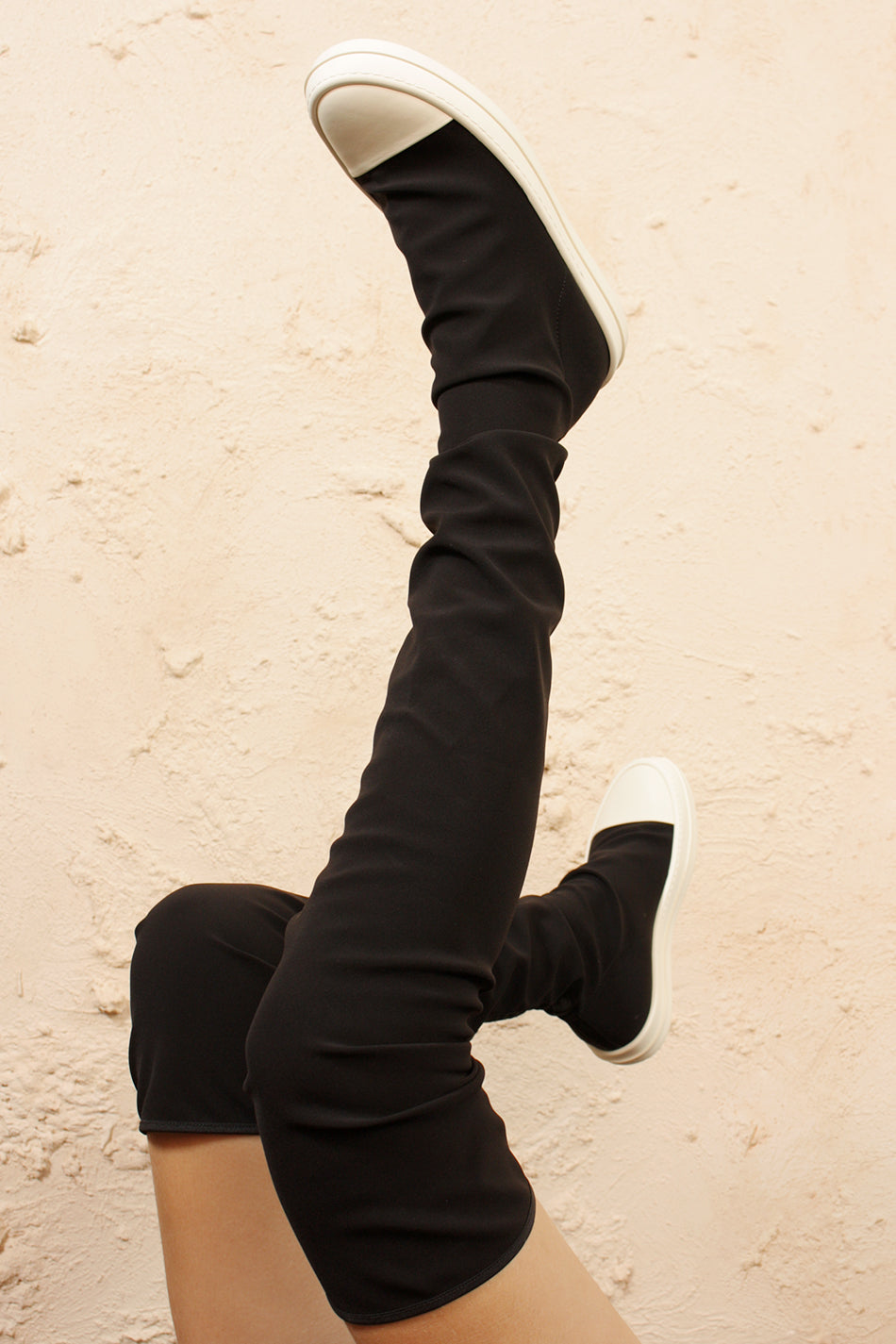 Iconic thigh-high stocking sneaker by DRKSHDW Rick Owens. Crafted from a smooth stretch fabric with milk white rubber sole and leather toe-cap.