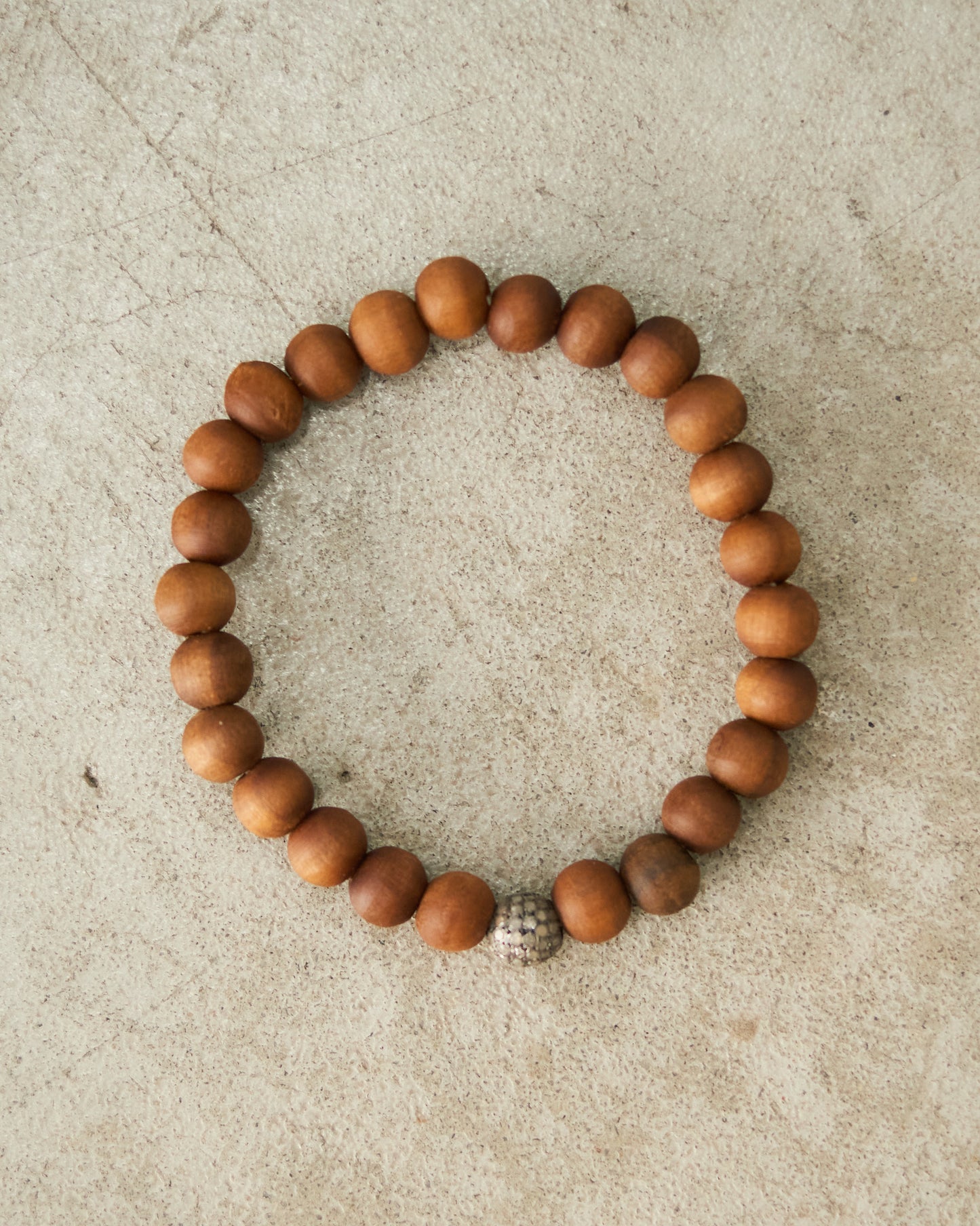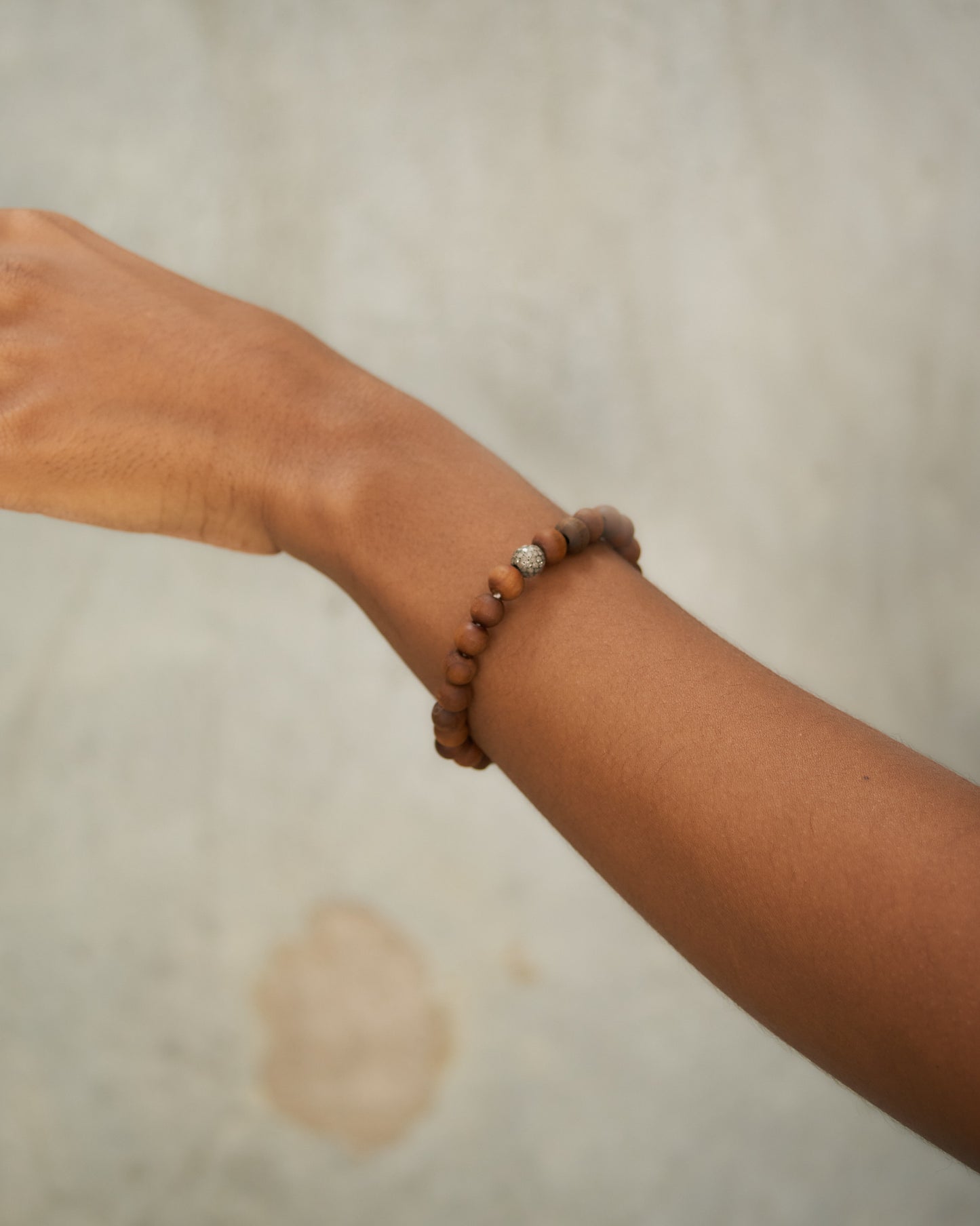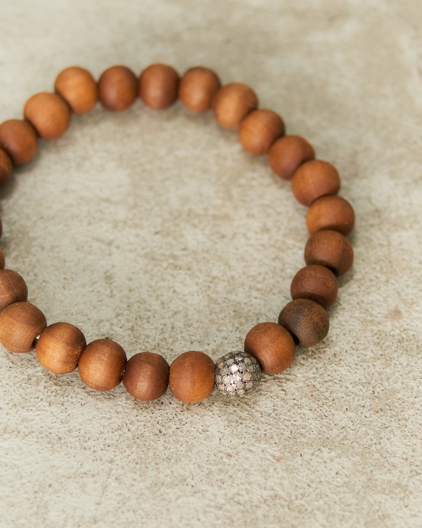 Globus brown bead bracelet by Rosa Maria. Spherical wooden bead bracelet, highlighted with a single sterling silver bead encrusted with seventy-six cut diamonds. A balance of natural texture and luxury detail.