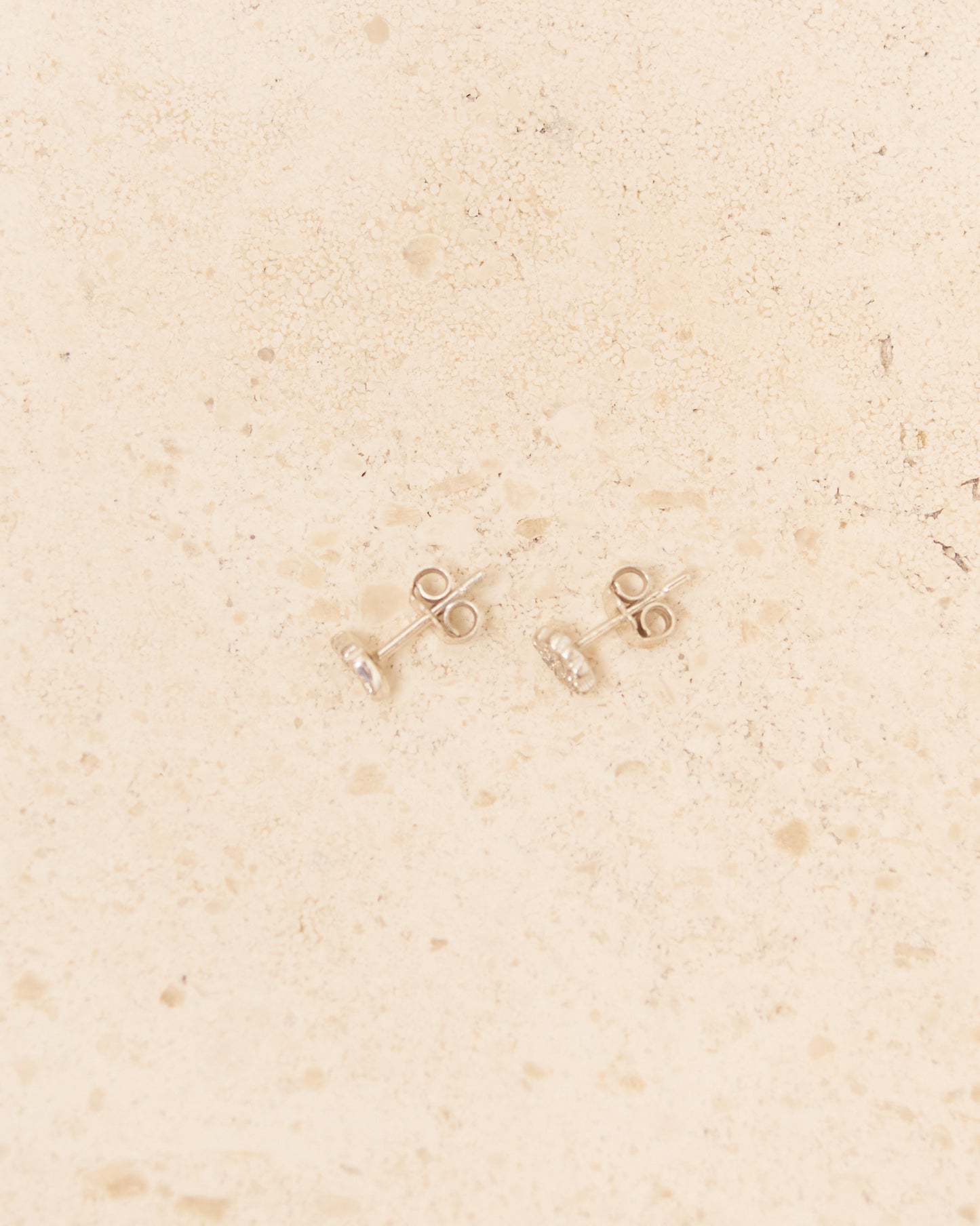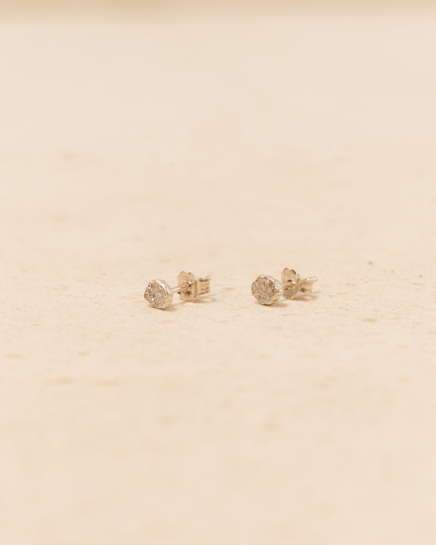 Bo Shiran earrings by Rosa Maria with cut diamonds. Delicate sterling silver studs with shallow plates contaning a cluster of brilliant cut diamonds. Fastened simply with butterfly backs.