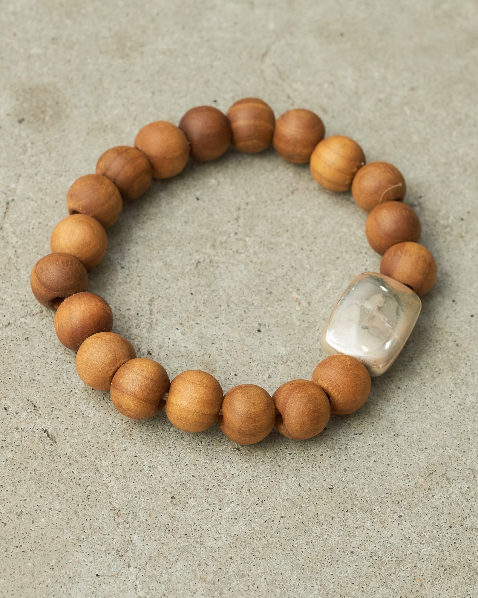 Oak beaded bracelet by Rosa Maria. Spherical wooden beads on a stretch cord, punctuated by a single sterling silver bead, combining natural texture with a touch of refined detail.