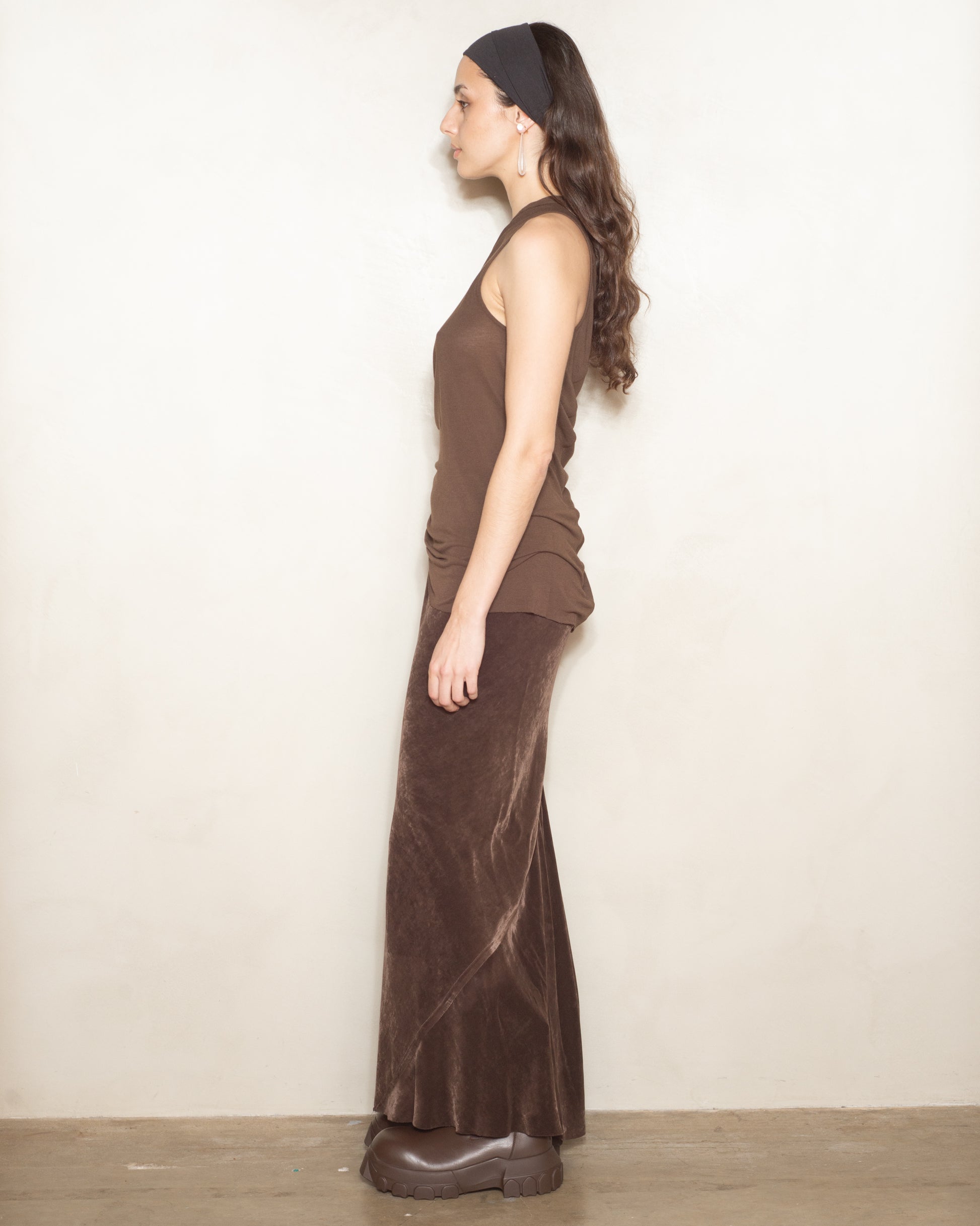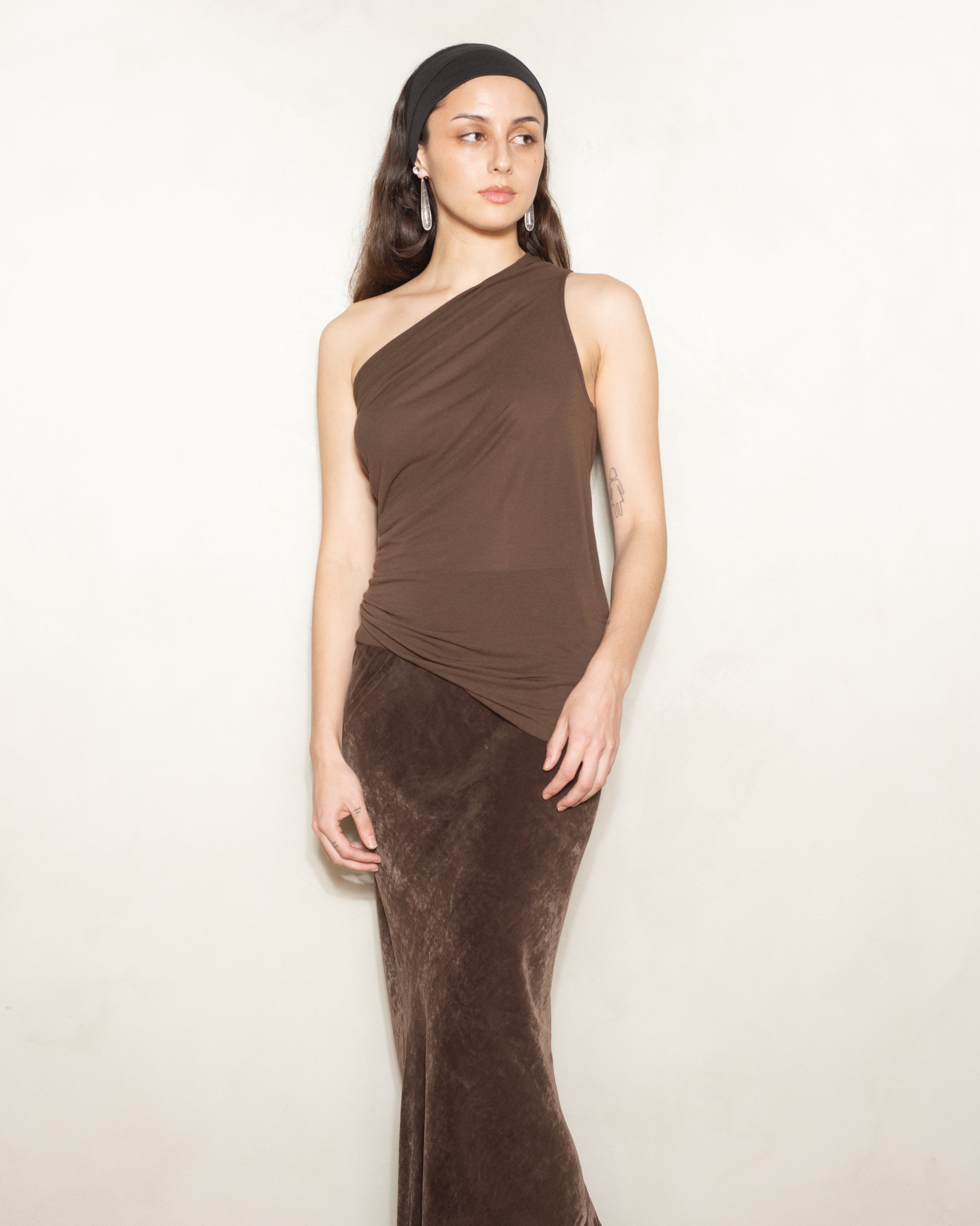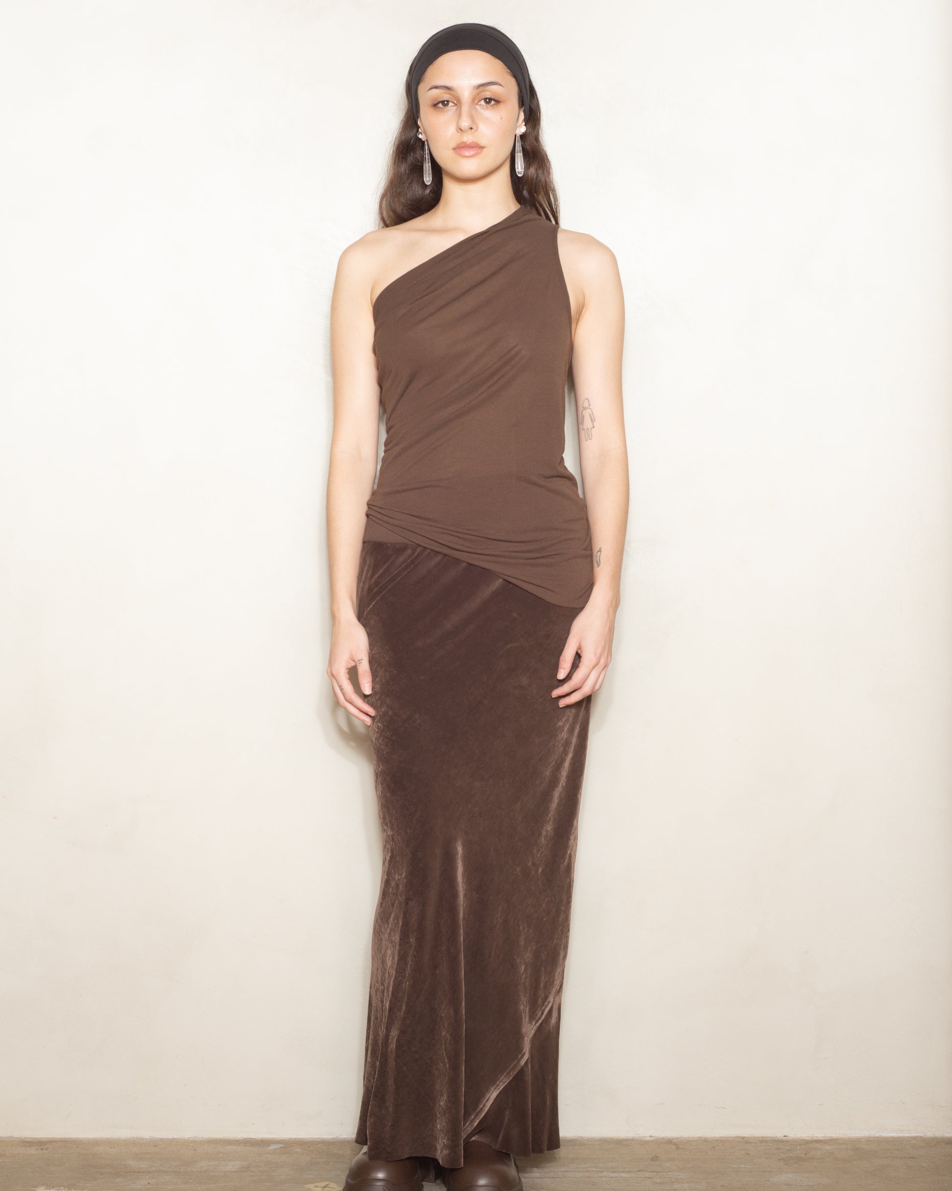 The Athena top by Rick Owens in brown. Sweeping over the left shoulder in a bias cut blend of viscose and silk to sensuously embrace the body with poetic draping and flair. Match with the tonal velvet skirt for an artfully composed look.