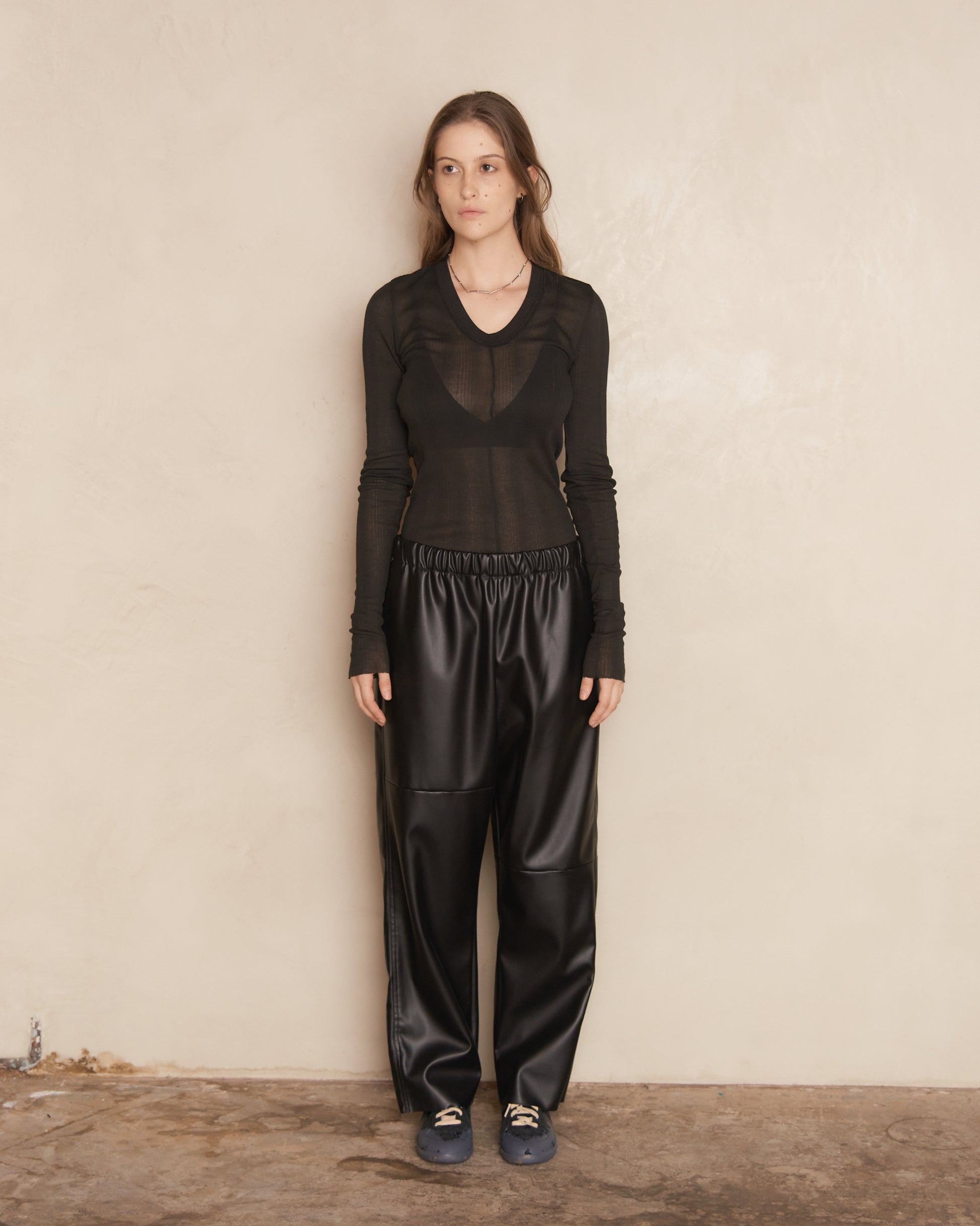 Easy trousers by MM6 Maison Margiela. Relaxed straight leg pants with leather-look polyurethane coating. Lightweight fabrication and easy to wear with elastic waistband, detailed by asymmetric panelling and raw cut hems. A staple MM6 piece that is versatile, stylish and subversive all at once.