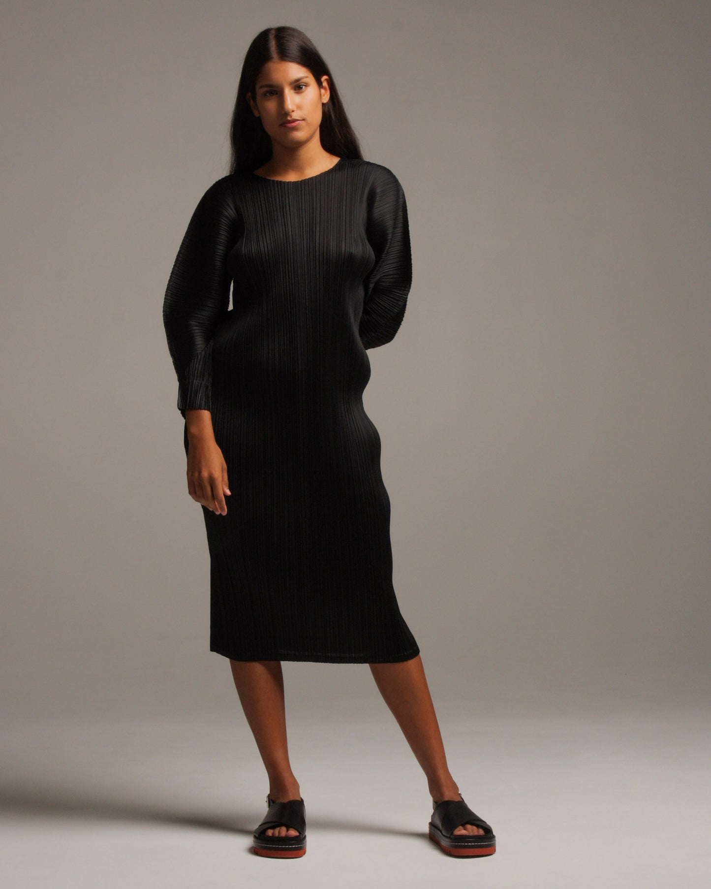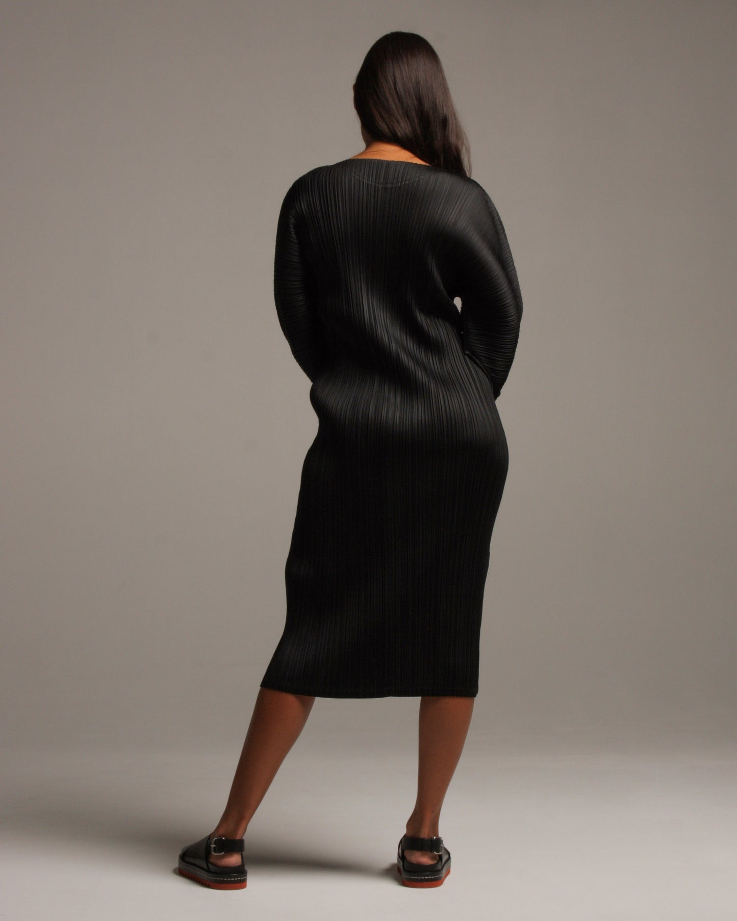 Sculpted sleeve dress by Pleats Please Issey Miyake in black. Mid length dress with round neck, finished in trademark pleated fabric. Exaggerated dolman sleeves finish with angular cuffs to create a powerfully modern shape.