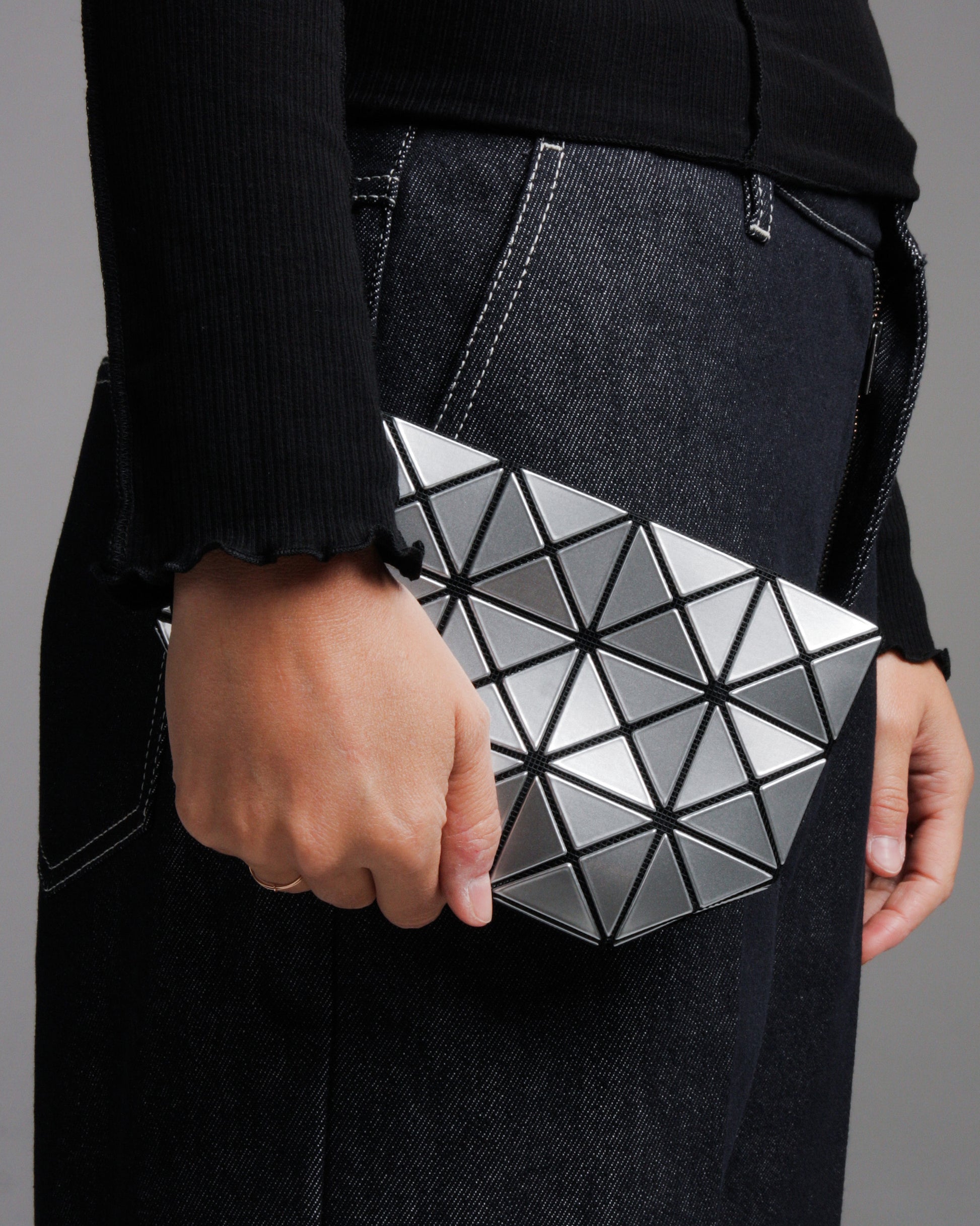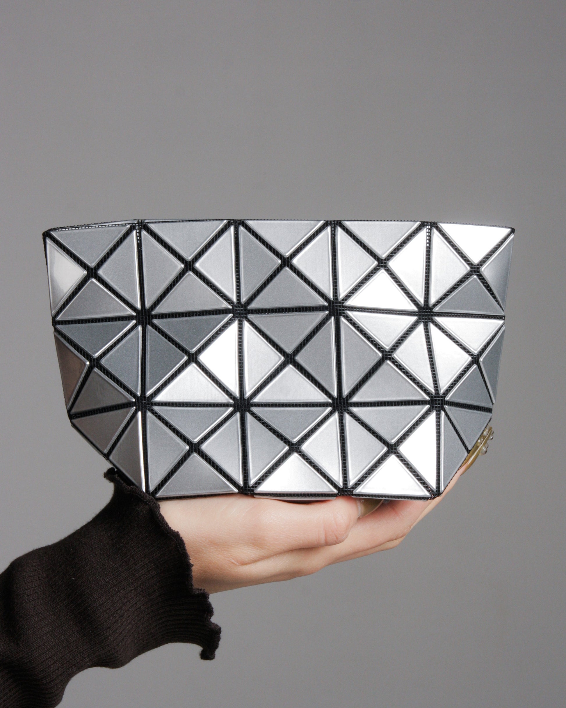 Prism pouch bay Bao Bao Issey Miyake in silver. Pleasing prism shape with geometric tiling in a metallic resin coating. Smooth zipped closure with interior nylon lining, the perfect travel size for cosmetics or stationery.
