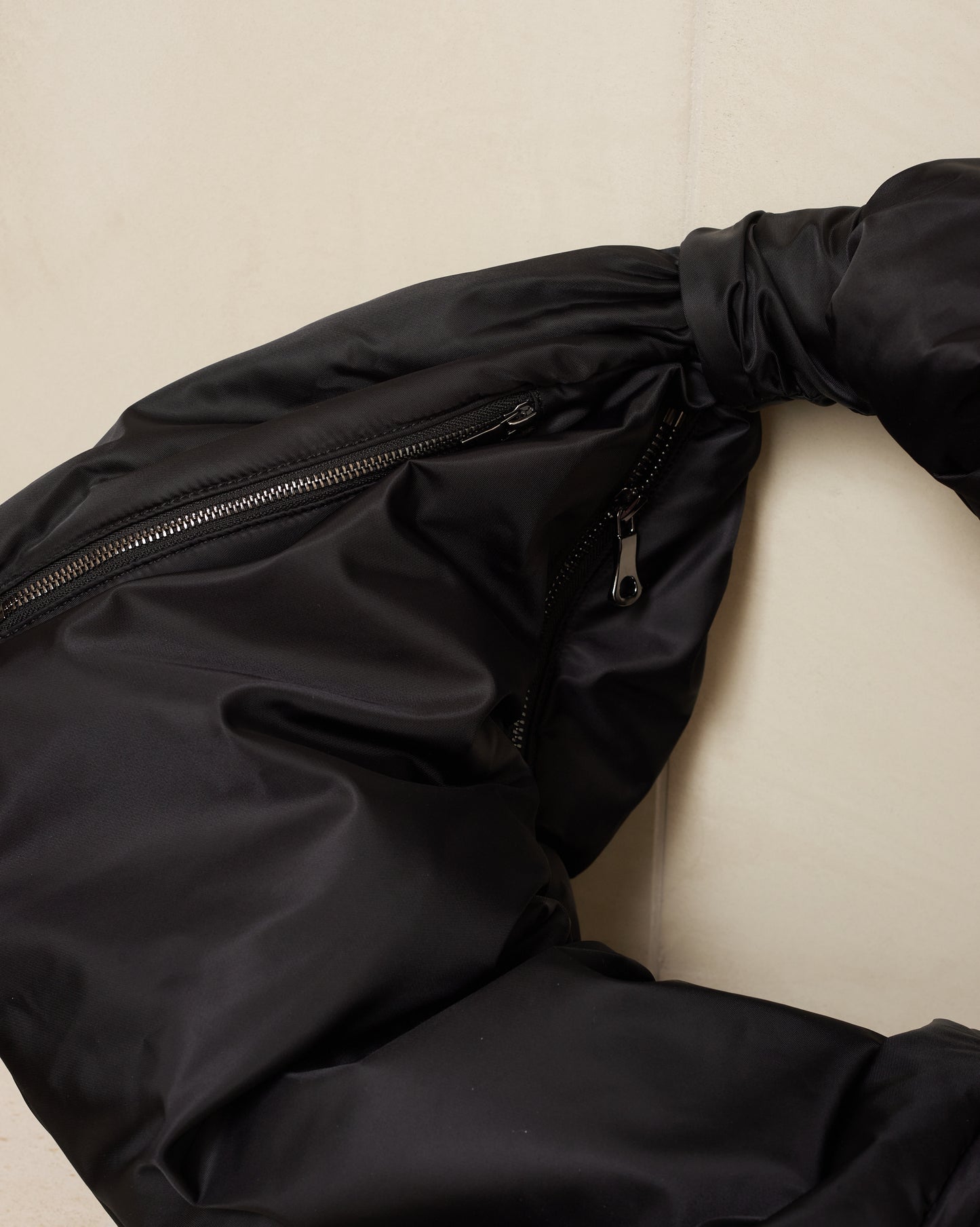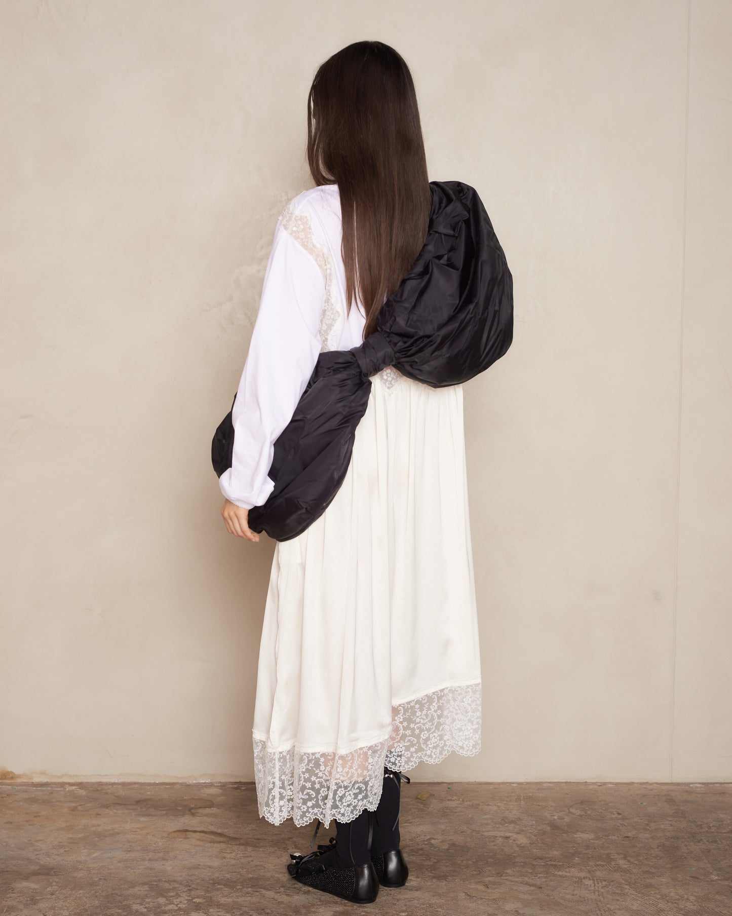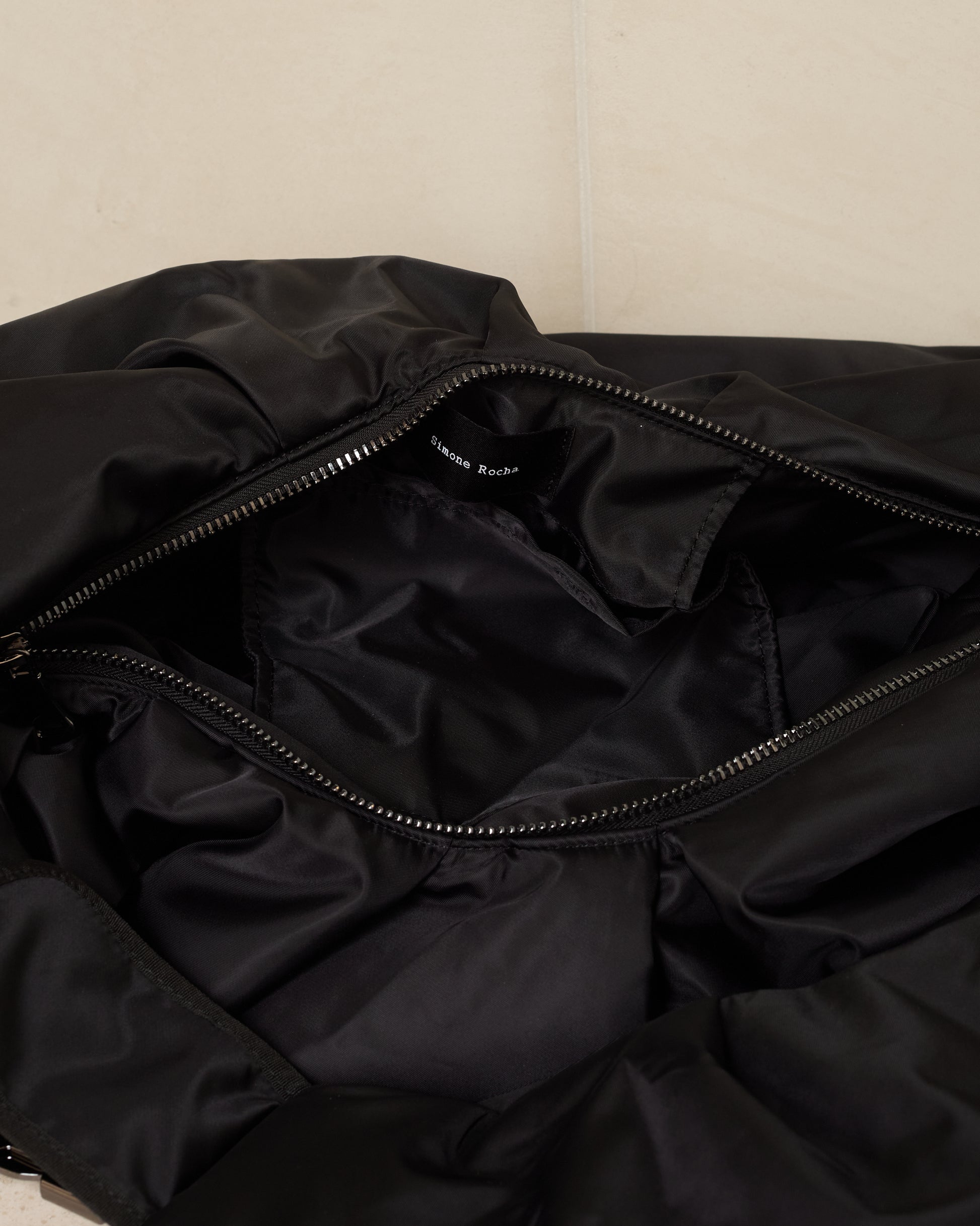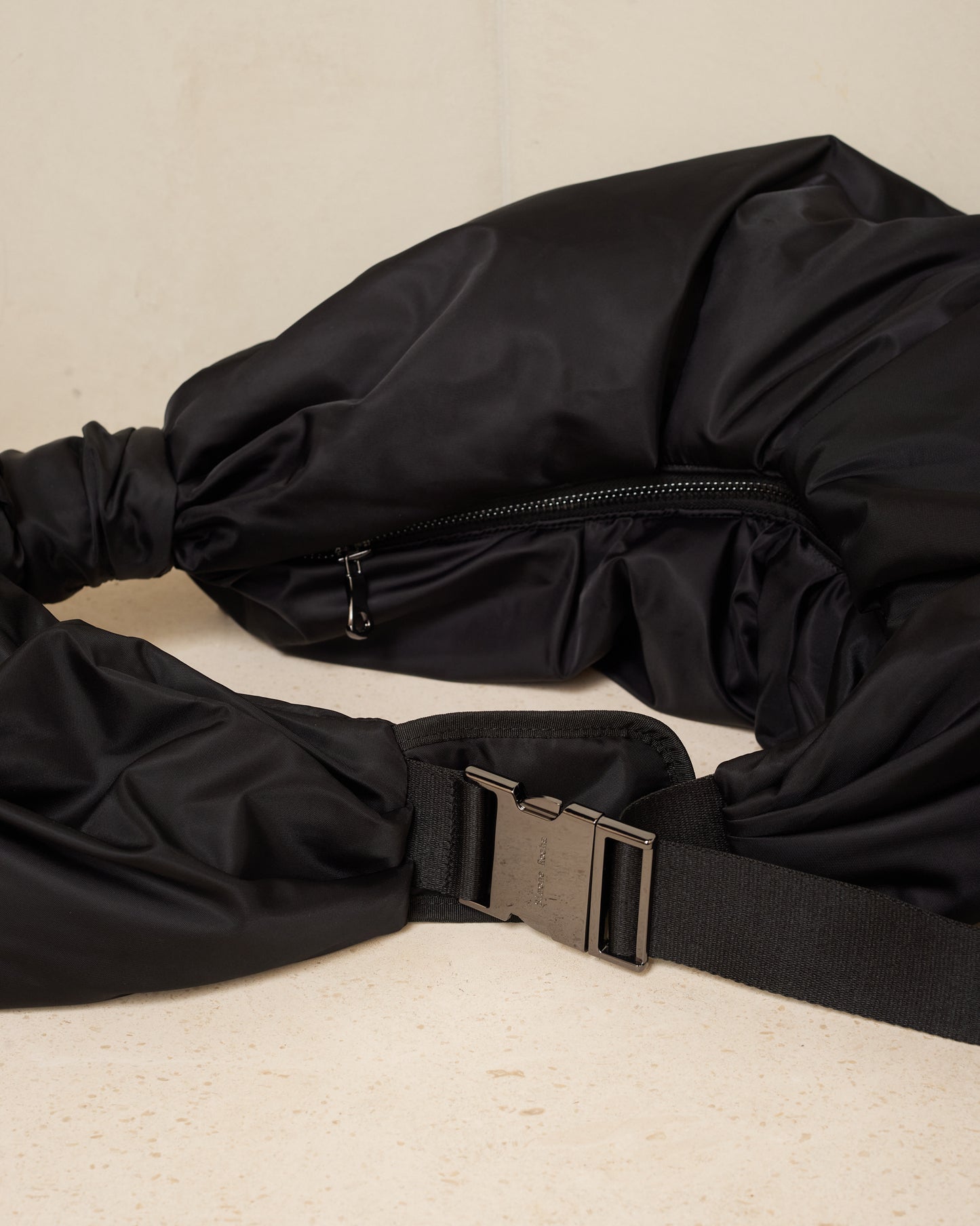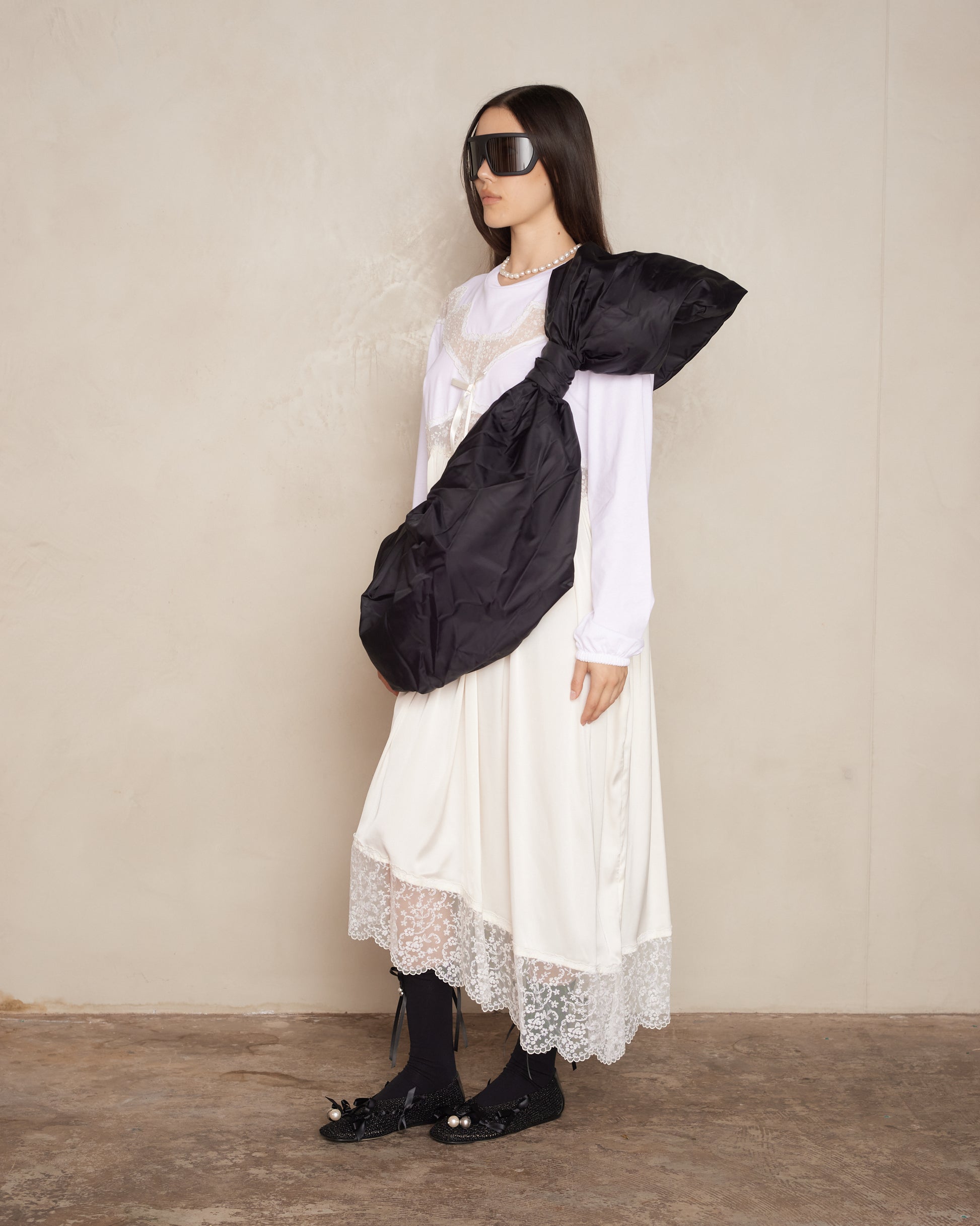 Big bow crossbody bag by Simone Rocha. Oversize crossbody bag in classic black technical nylon. Featuring two separate pockets with zipped closure and an adjustable buckle strap. A whimsically inventive accessory that wears crossbody to give the effect of an enormous bow engulfing the body.