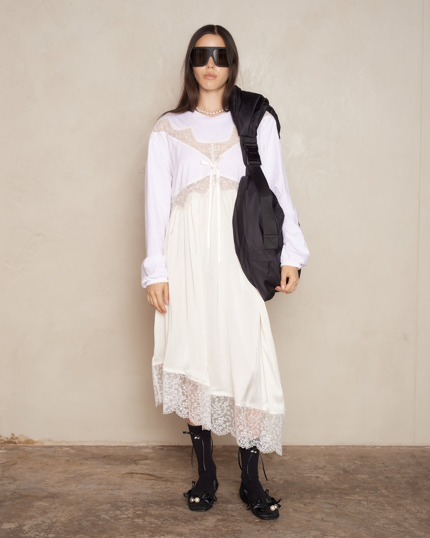 Pictured with Shield Sunglasses by Rick Owens, Baroque Pearl Collar by Sophie Buhai, White Patchwork T-Shirt Dress and Black Pearl Crochet Double Bow Ballerina by Simone Rocha.