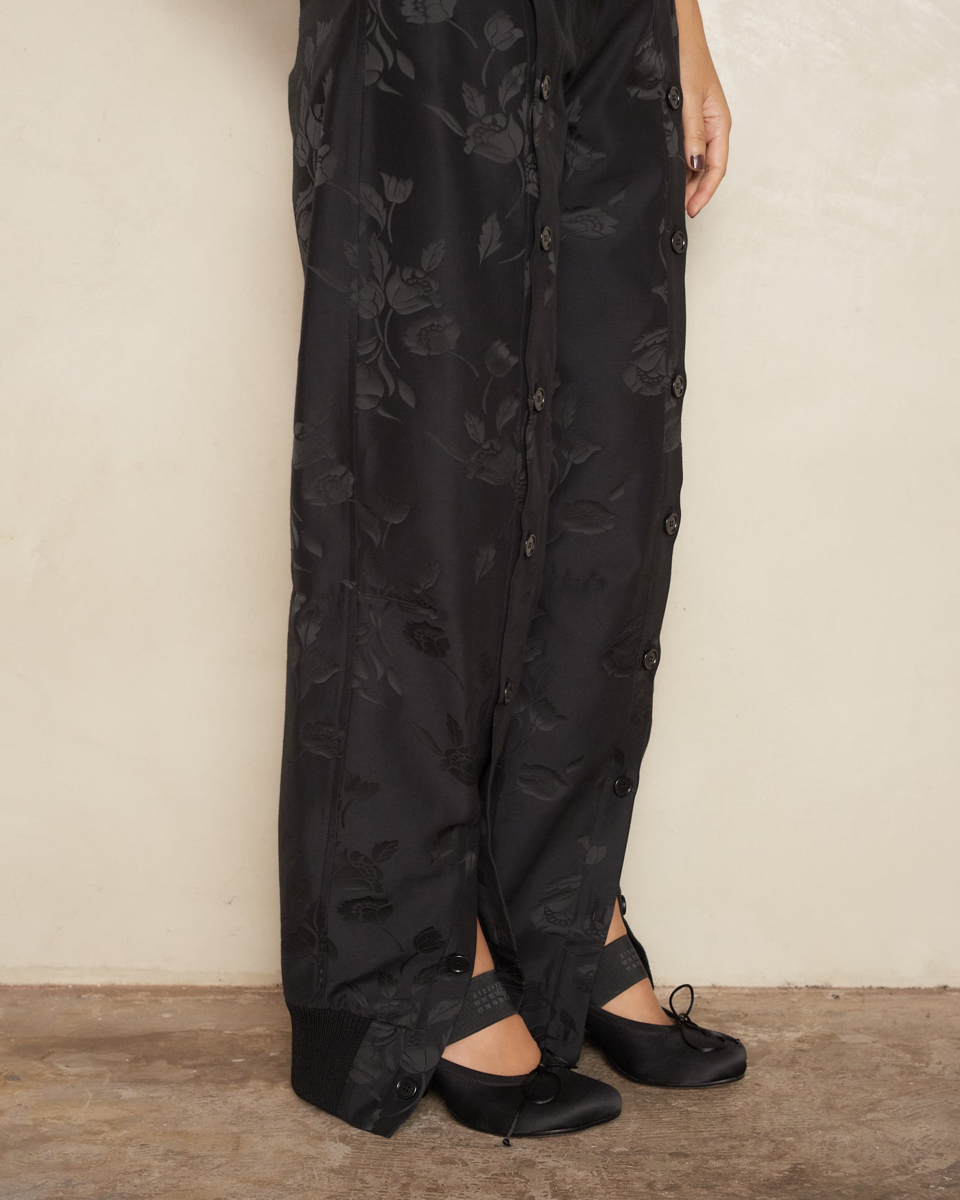 Floral trousers by Simone Rocha. High-waisted trousers in a sleek floral imprinted cotton blend. Buttons run the centre length of each leg, adding a unique decorative detail as well as adjustable functionality. Finished with elastic hems in thick ribbed wool. Zip-fly with clasp closure and four pocket styling.