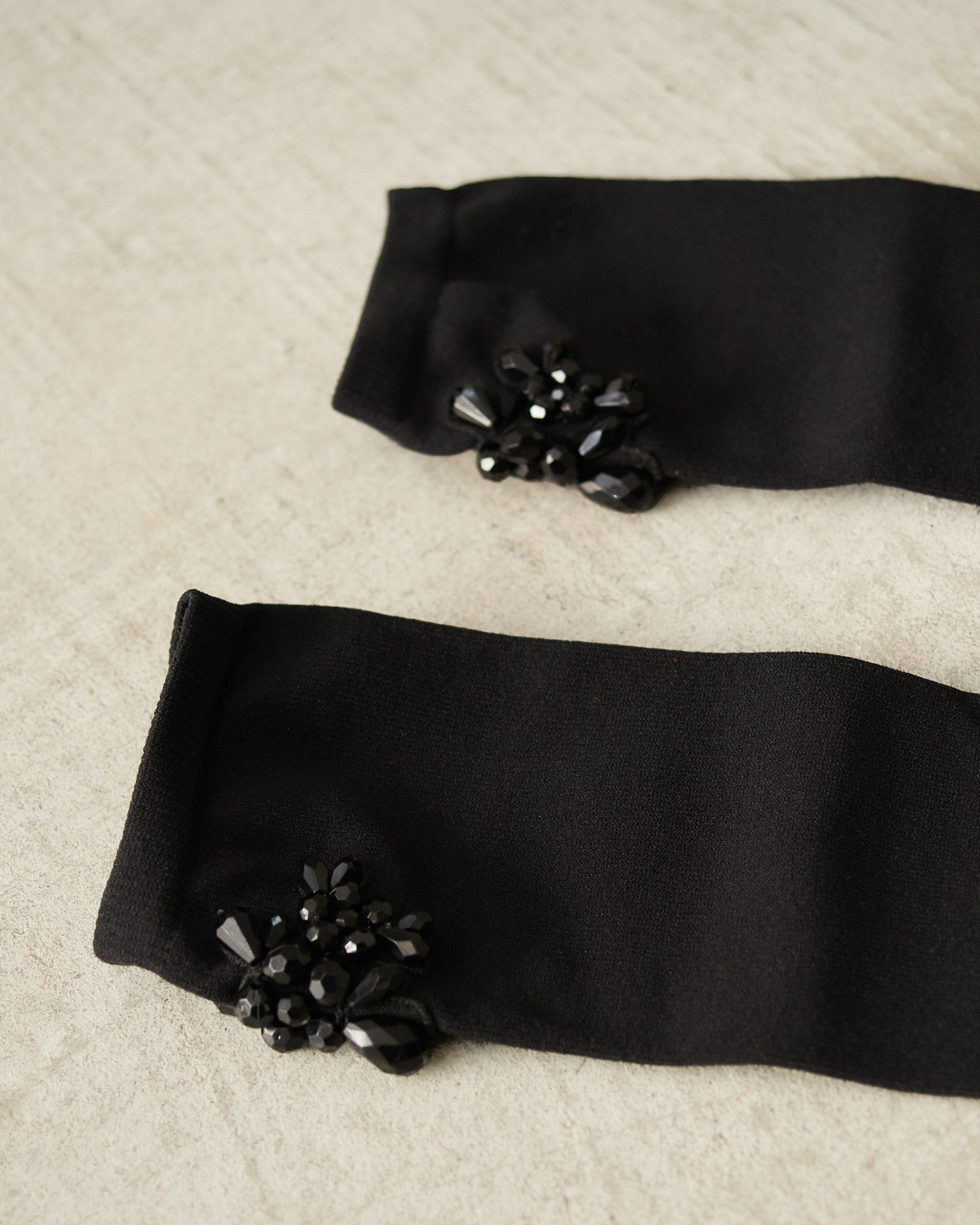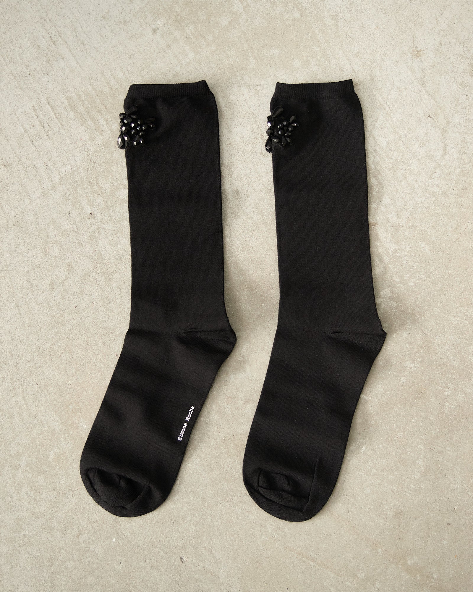 Flower cluster socks by Simone Rocha in black. Slim cotton blend socks adorned with Simone Rocha's idiosyncratic crystal beading at the cuff - a delicate embellishment that lends everyday wear a touch of romance.