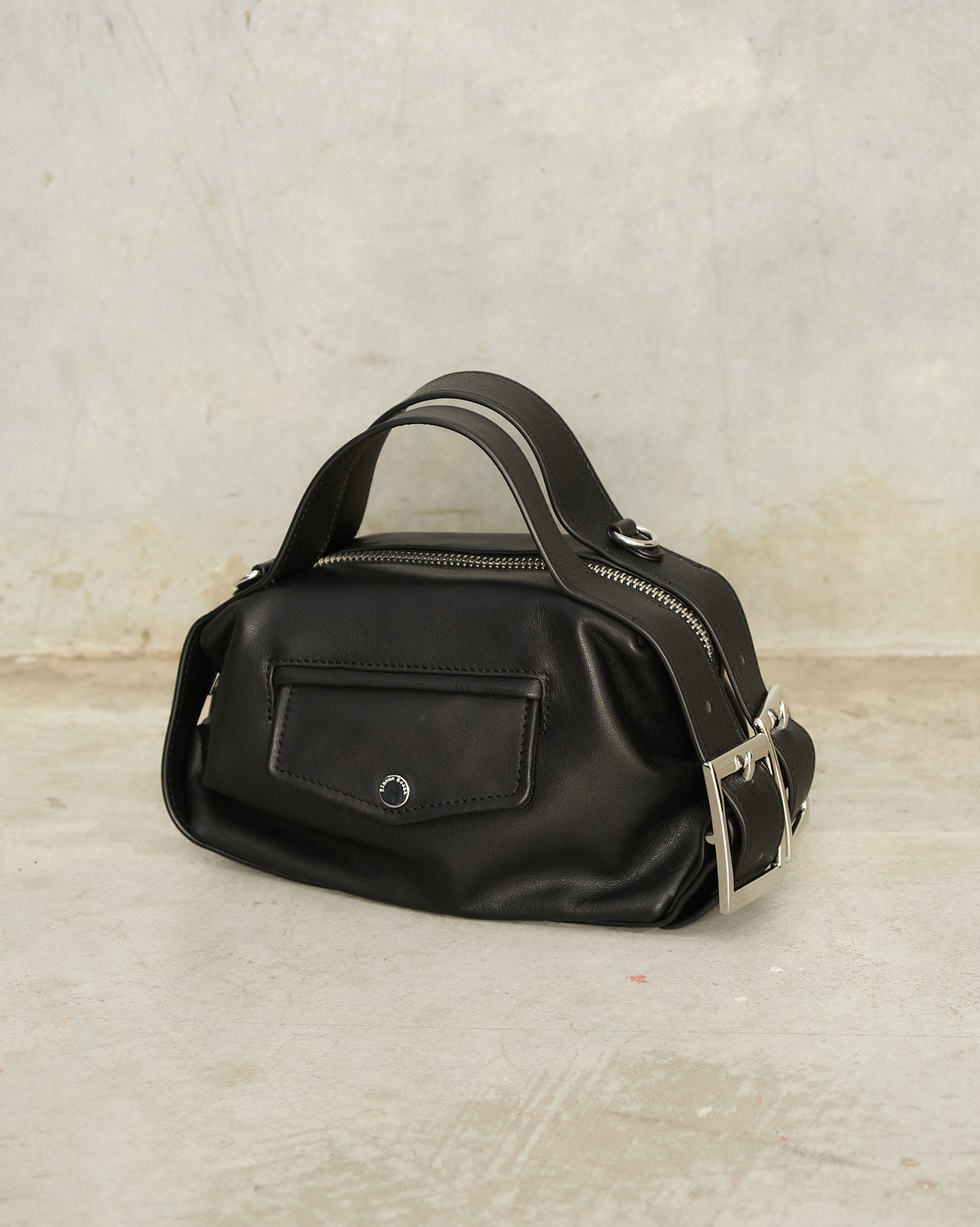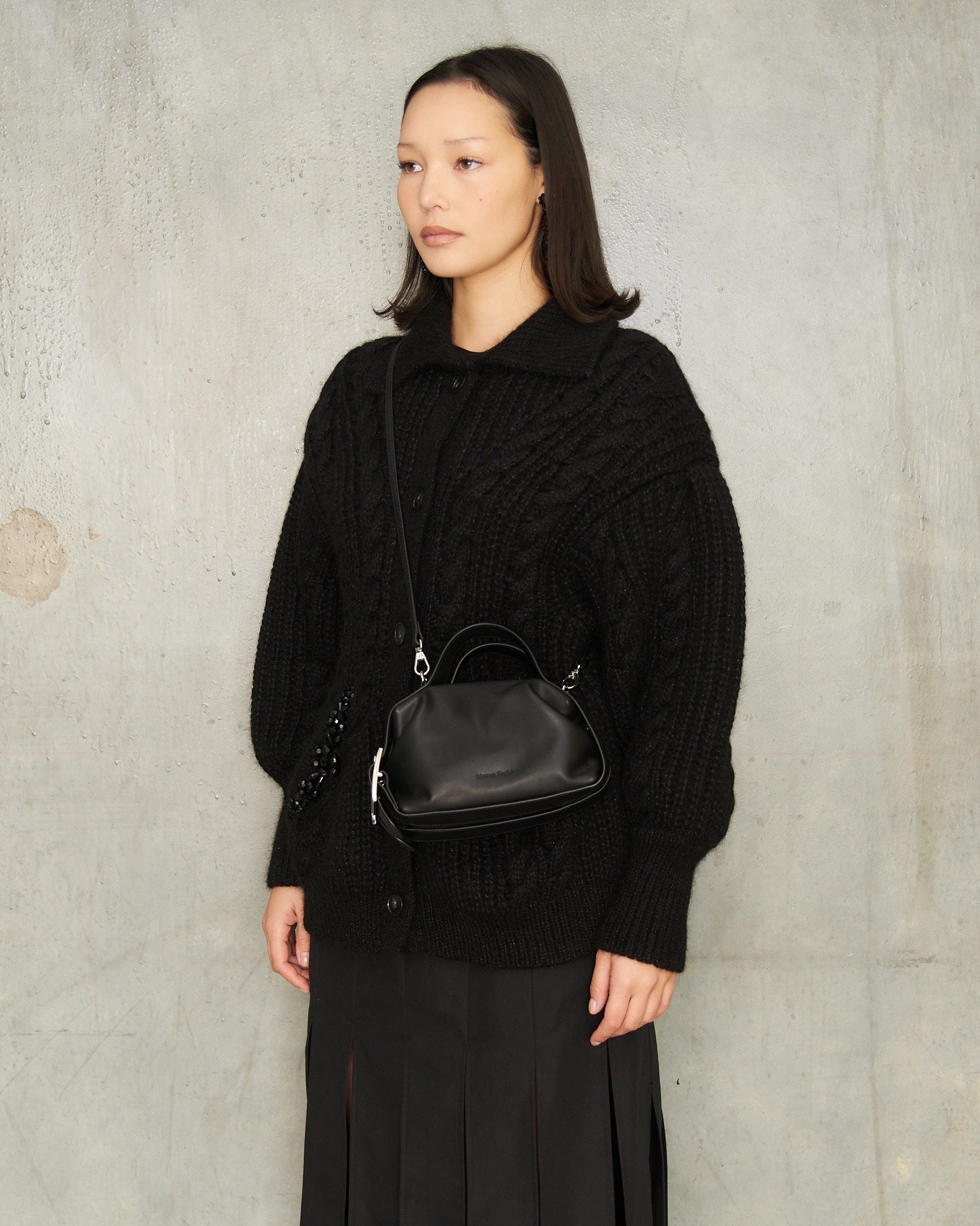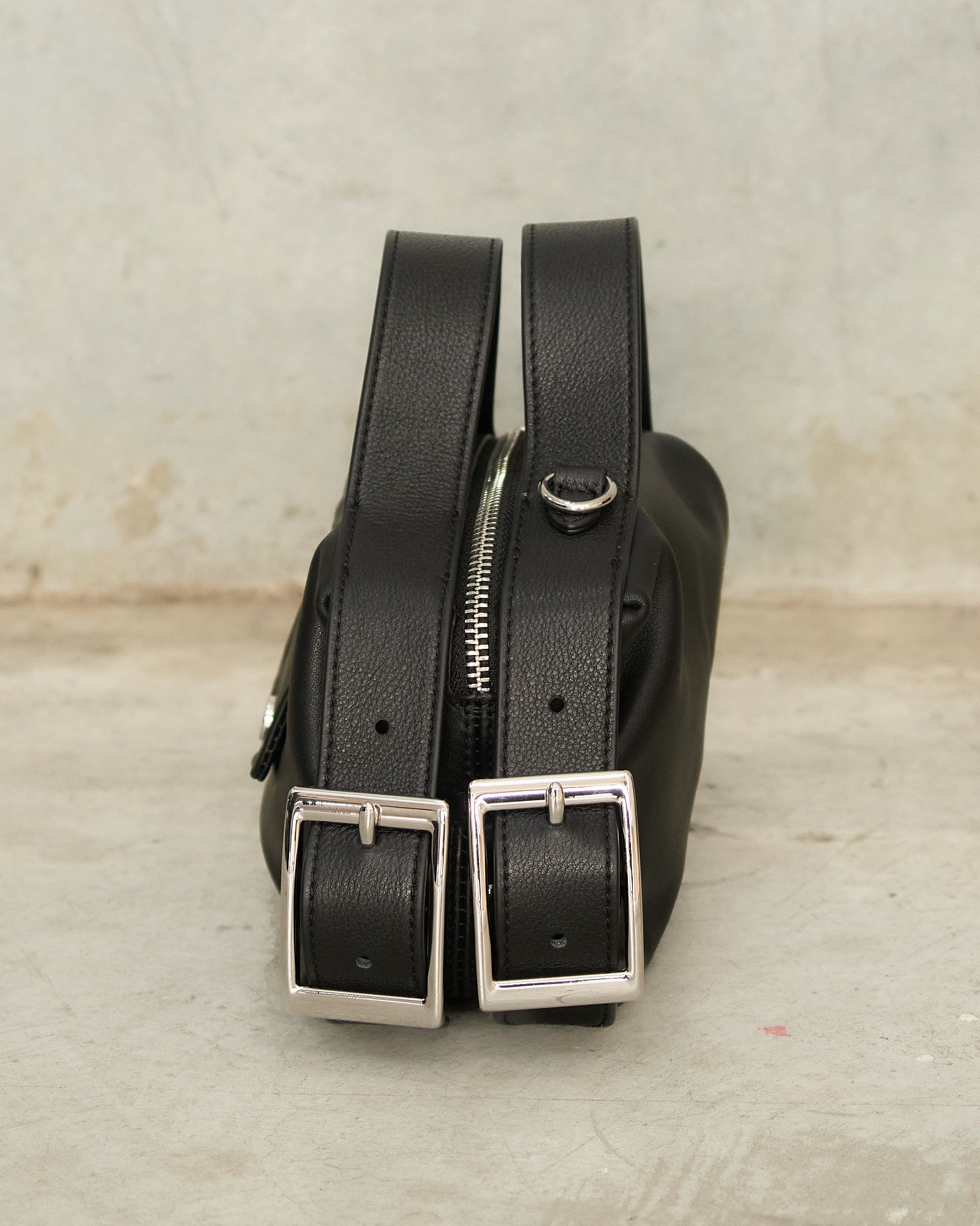 Mini biker belt bag by Simone Rocha in black. Compact handbag in supple leather, defined by dual belt handles that echo the season’s biker influence. Finished with a zip closure and an additional strap for versatile crossbody wear.
