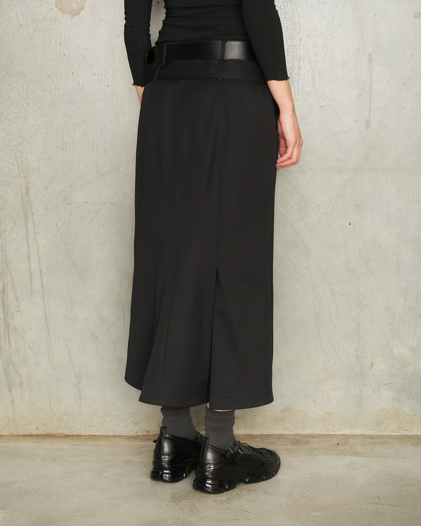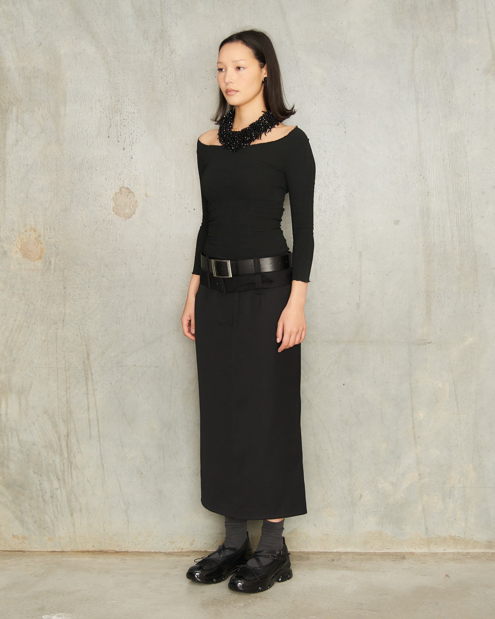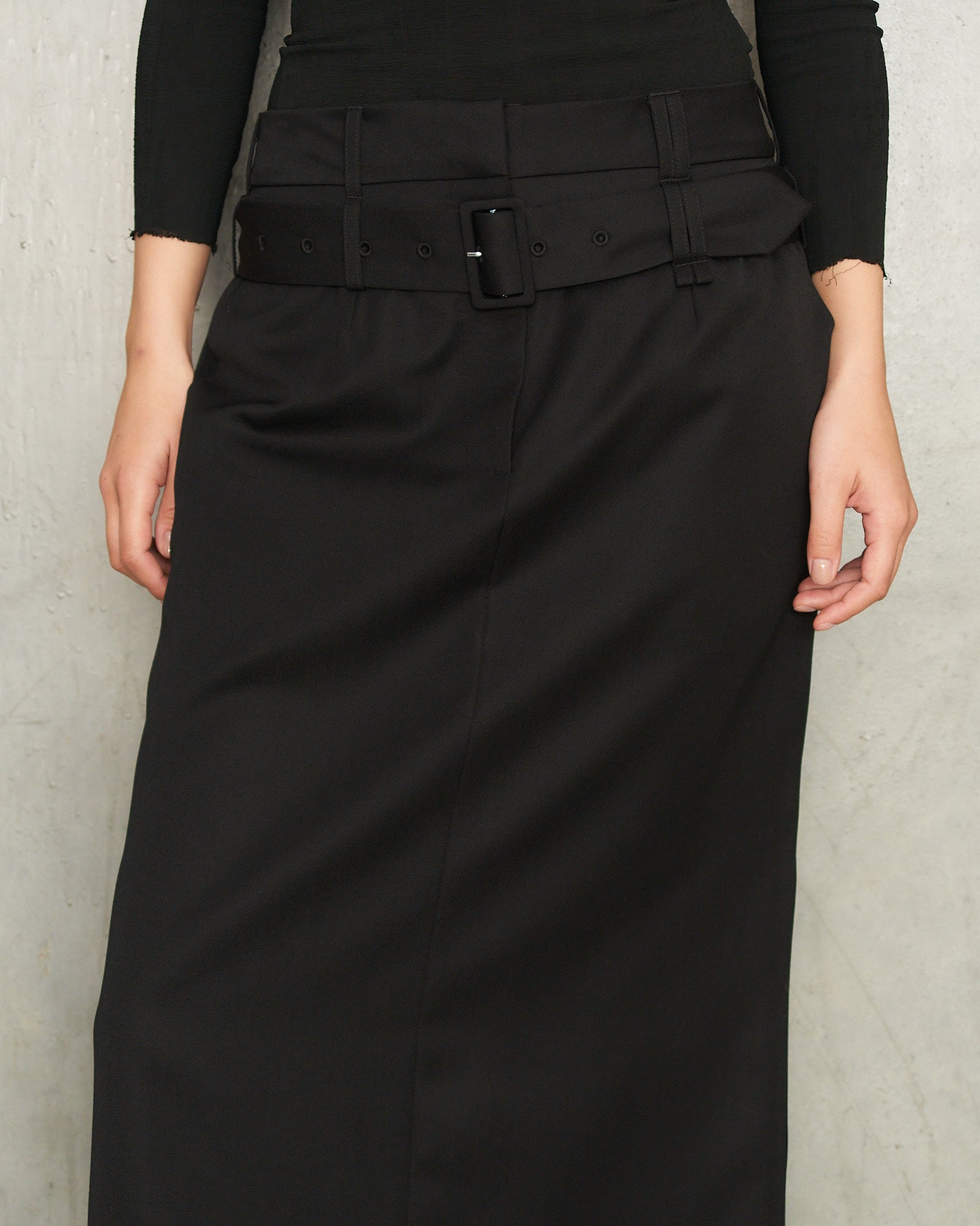 Multi loop kick back skirt by Simone Rocha in black. Refined pencil skirt in sleek Venetian wool, cut with a graceful kickback hem for ease and movement. Double rows of belt loops lend a modern twist with varying styling options.