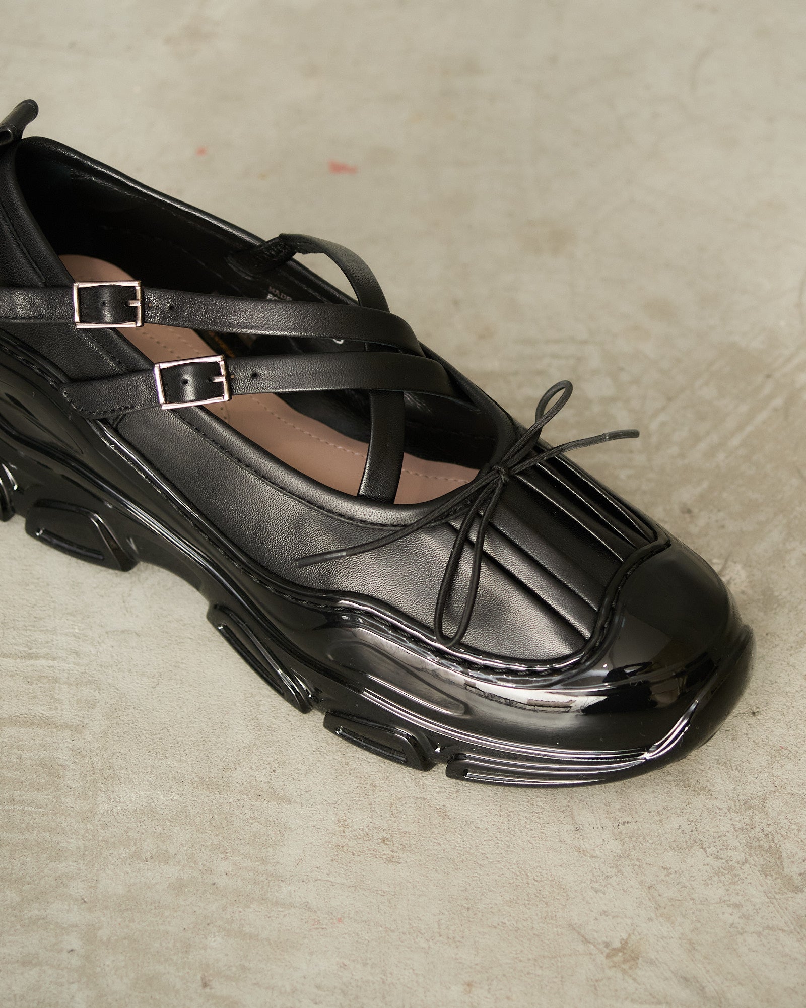 Nappa tracker ballerina shoes by Simone Rocha in black. Signature ballerina pumps in soft nappa leather with pleated toebox and stylish treaded rubber soles. Criss-crossing buckled straps and bow detailing at the toe.