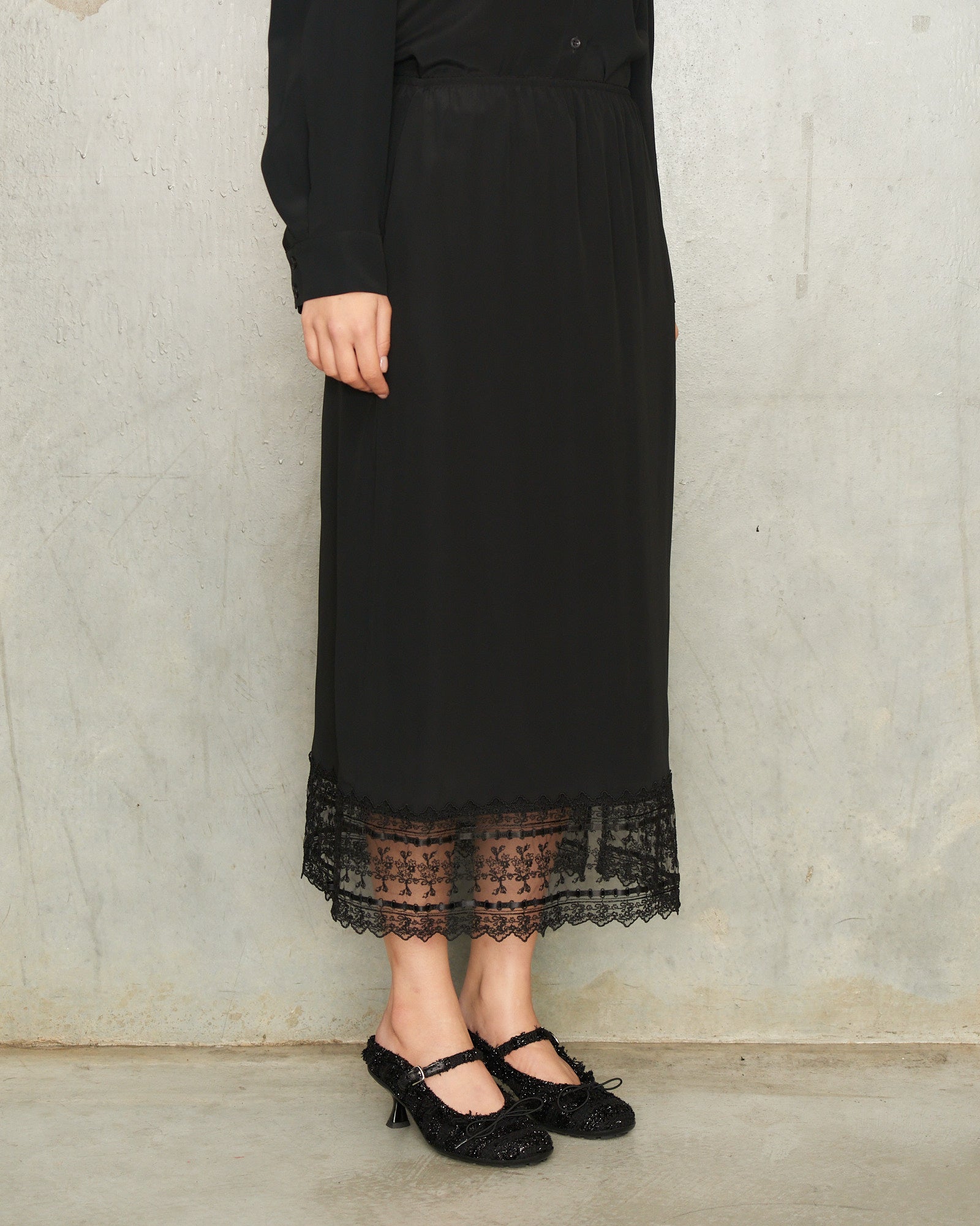 Ribbon trim skirt by Simone Rocha in black. Softly draping crepe de chine skirt that flows with effortless grace from an elastic waist to a mid-length hem, finished with a delicate sheer lace trim.