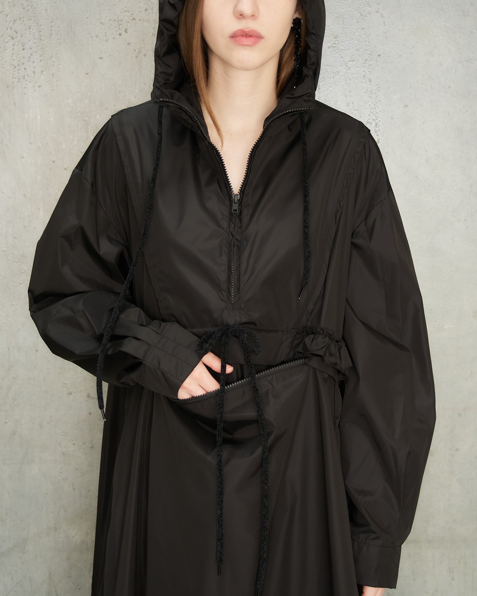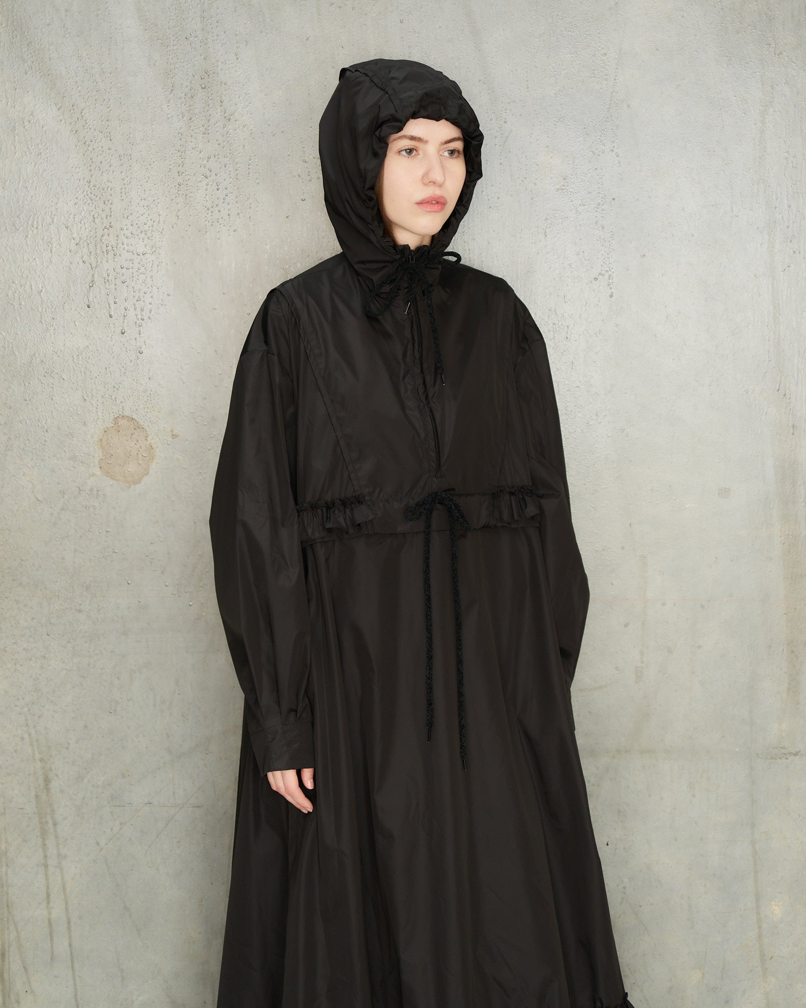 Ruffle frill cagoule by Simone Rocha in black. This exaggerated hooded coat-dress wears as a pullover style, combining dramatic and architectural elements, transforming a practical garment into a signature piece. Seasonal fuzzy chenille bows appear at the waist and hood.