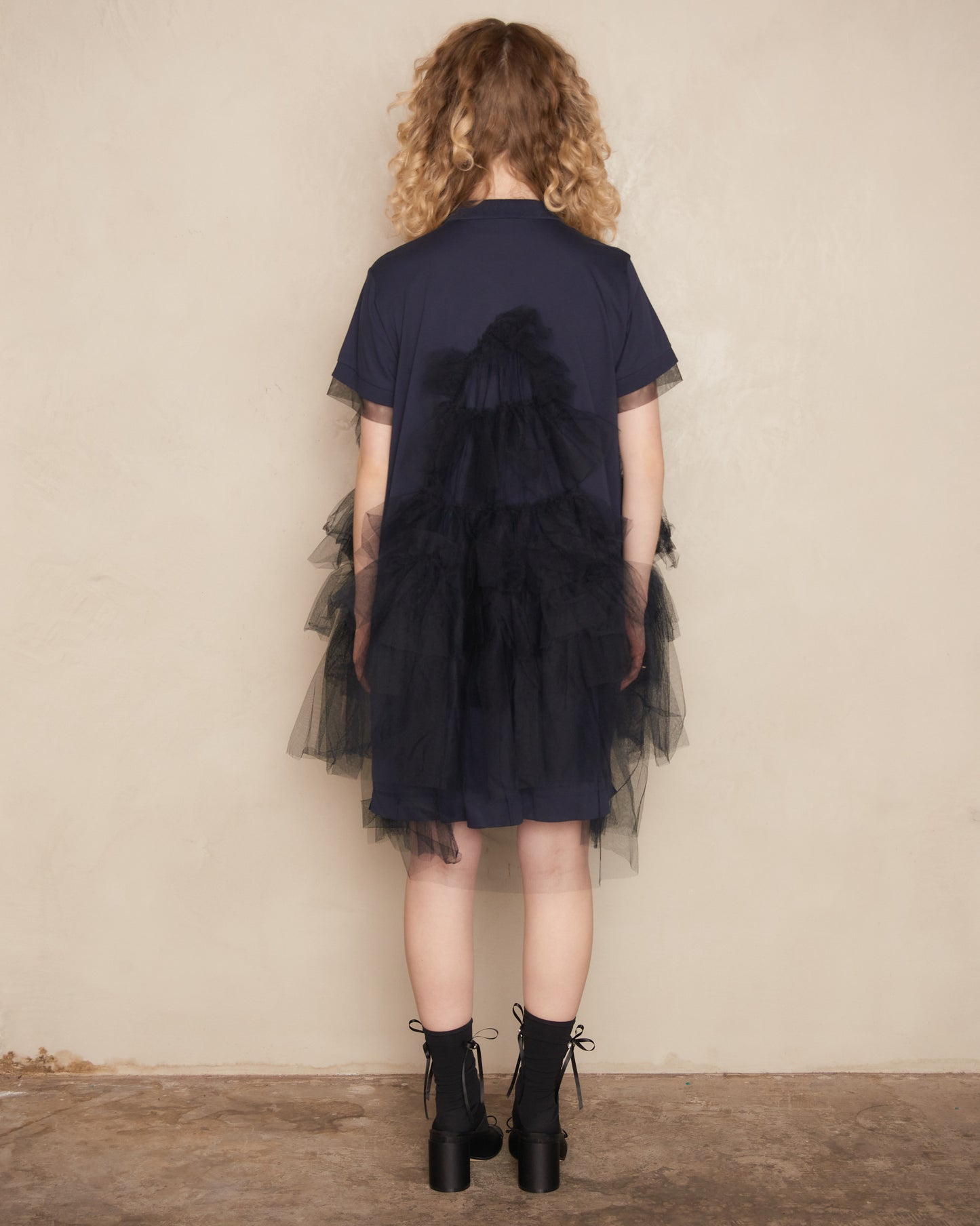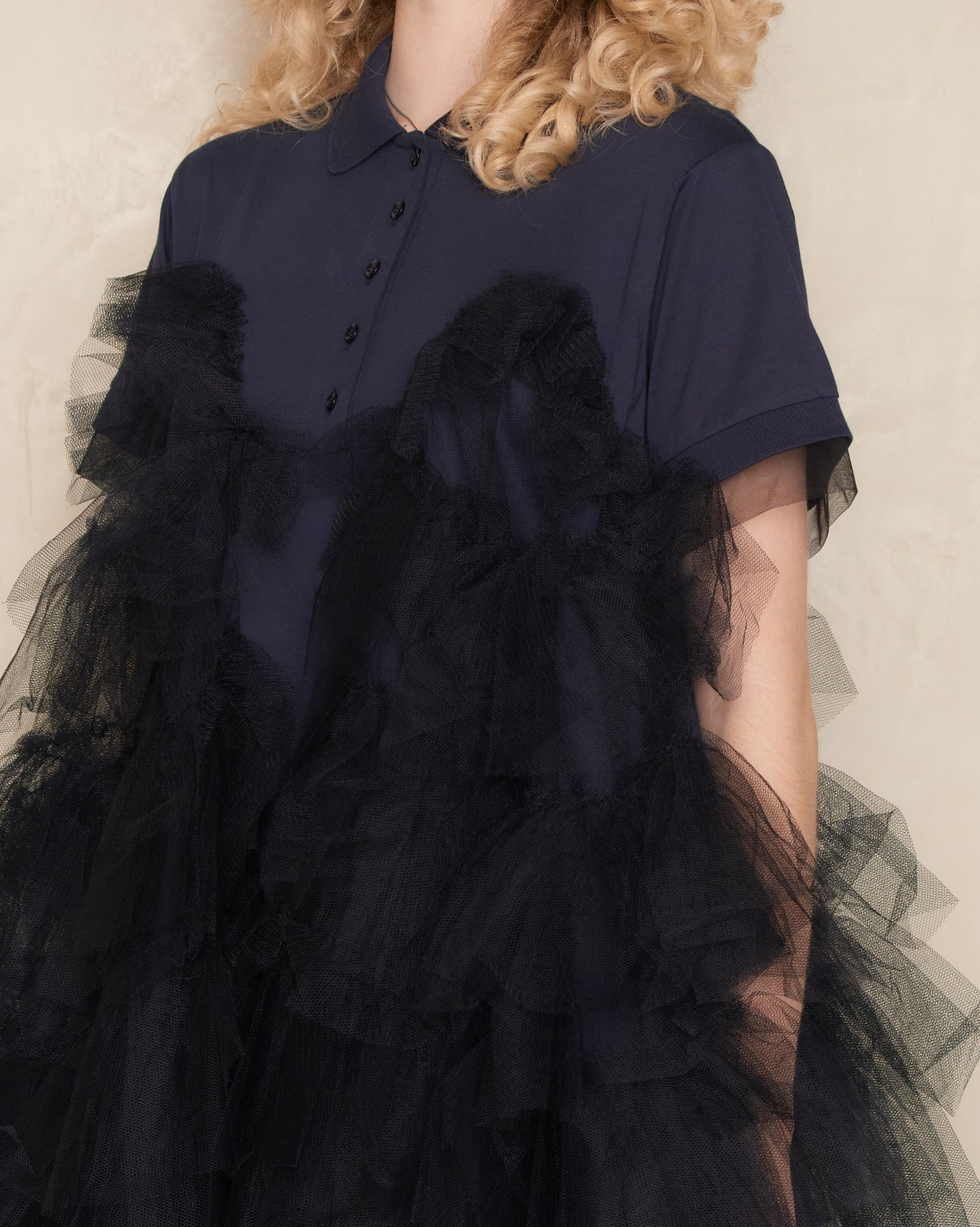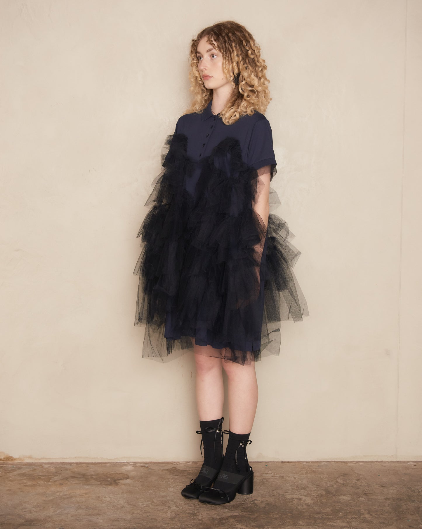 Tiered tulle polo dress by Simone Rocha. Crafted from navy cotton, this polo dress is elevated by layers of ruffled tulle appliqués, creating a multi-tiered, voluminous silhouette. The tulle netting adds a touch of diaphanous glamour, contrasting with the sharp, clean lines of the polo collar. This fusion of soft, romantic fabrics with a tailored polo design perfectly embodies Rocha's signature blend of femininity and modern edge.