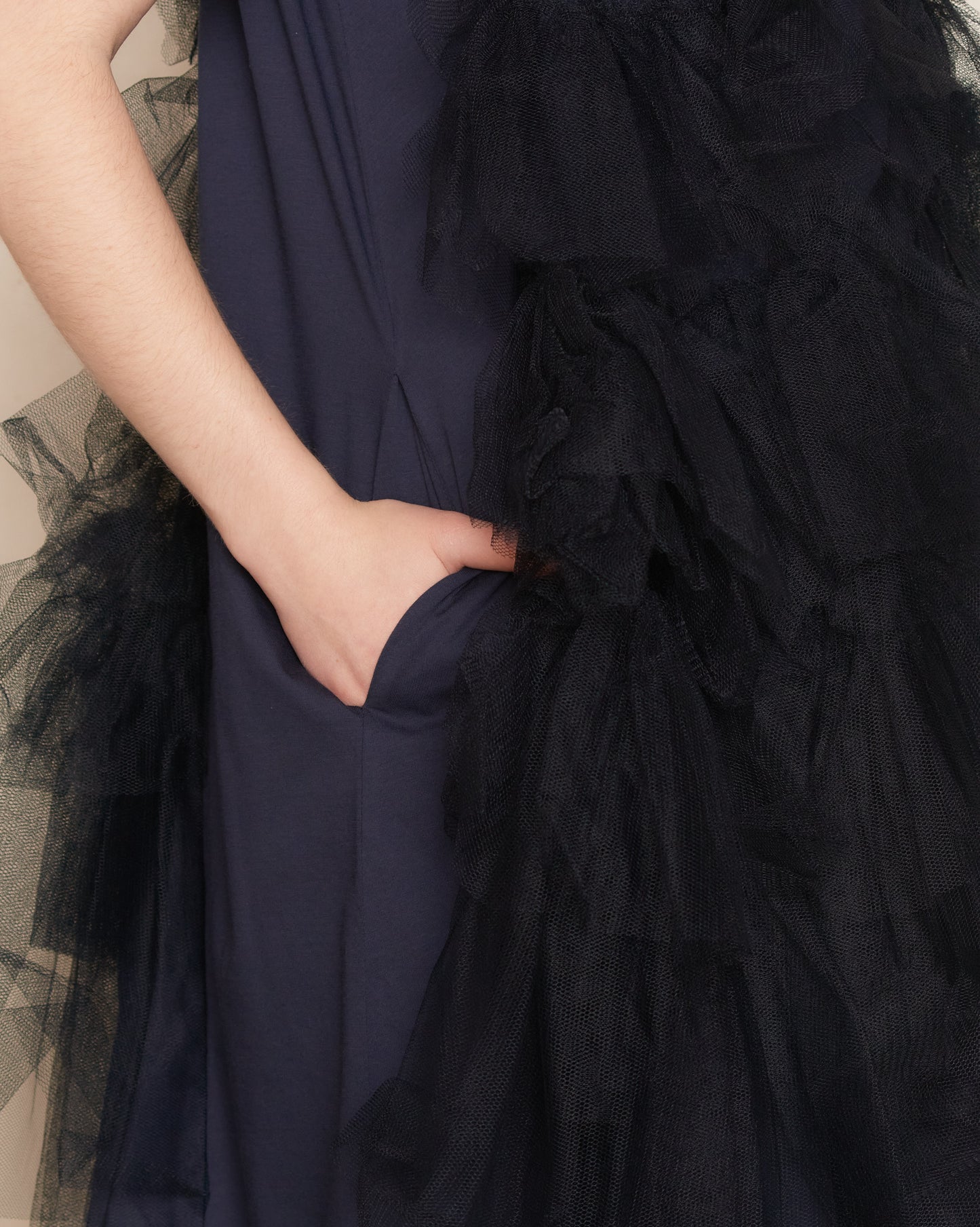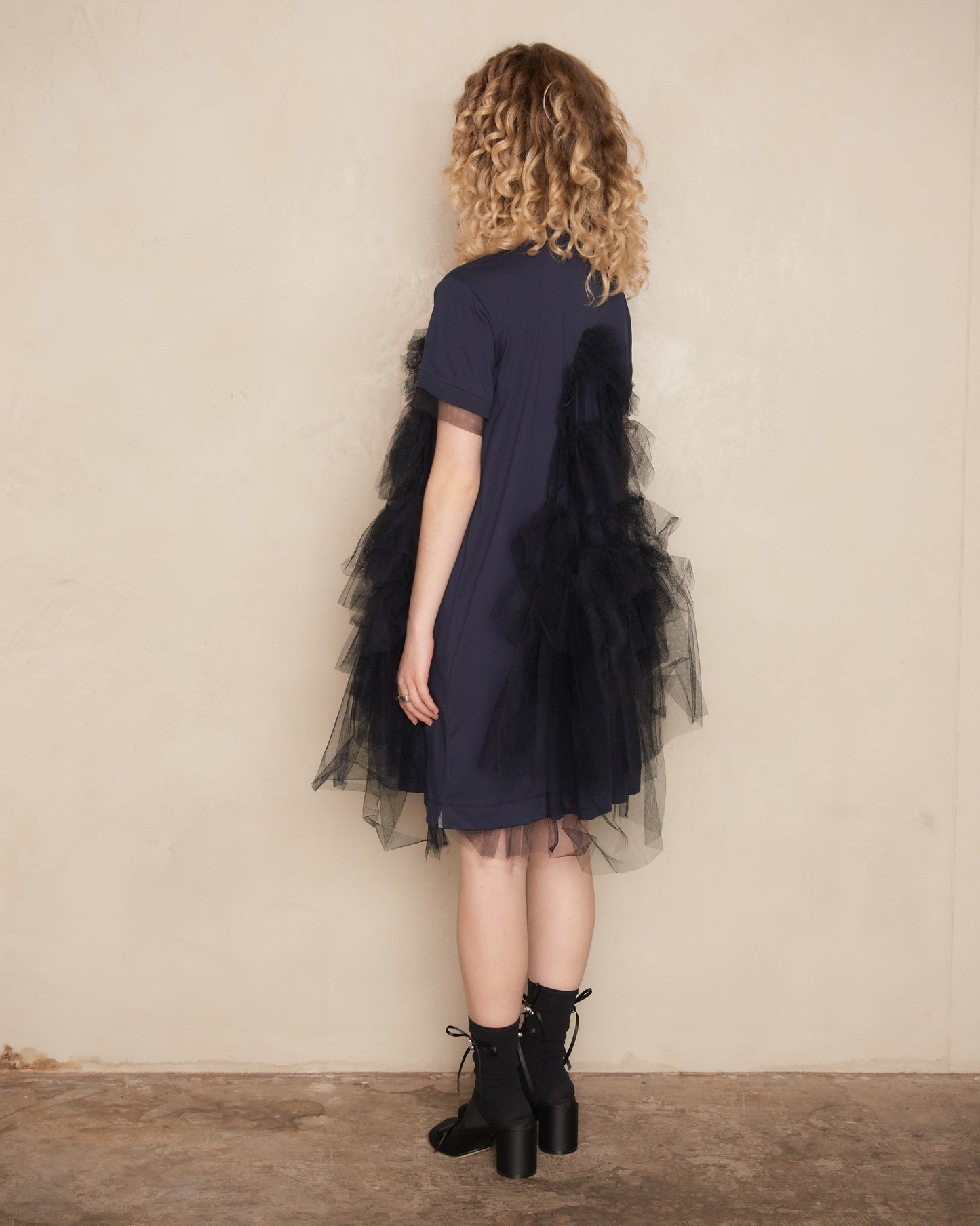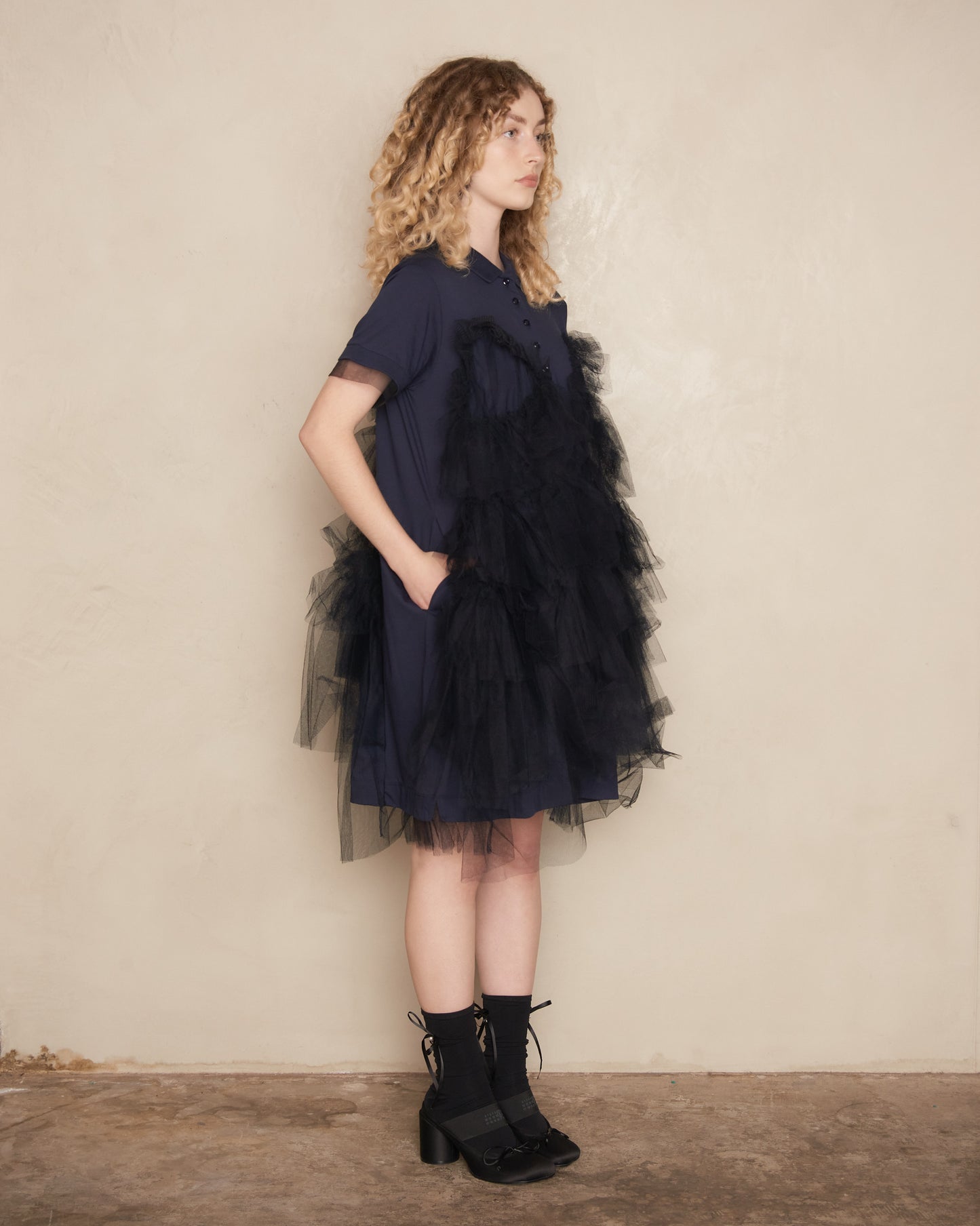 Tiered tulle polo dress by Simone Rocha. Crafted from navy cotton, this polo dress is elevated by layers of ruffled tulle appliqués, creating a multi-tiered, voluminous silhouette. The tulle netting adds a touch of diaphanous glamour, contrasting with the sharp, clean lines of the polo collar. This fusion of soft, romantic fabrics with a tailored polo design perfectly embodies Rocha's signature blend of femininity and modern edge.