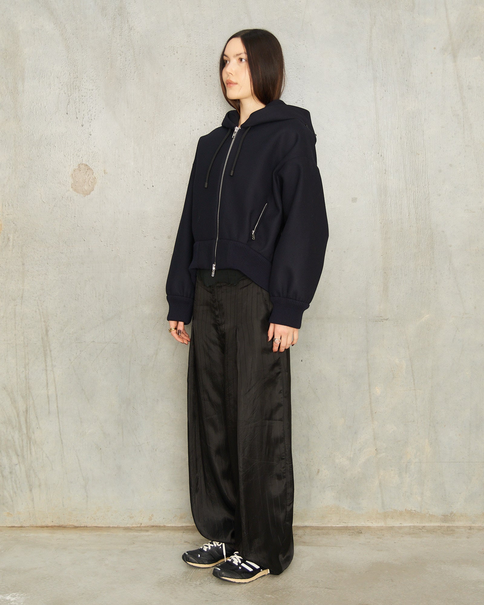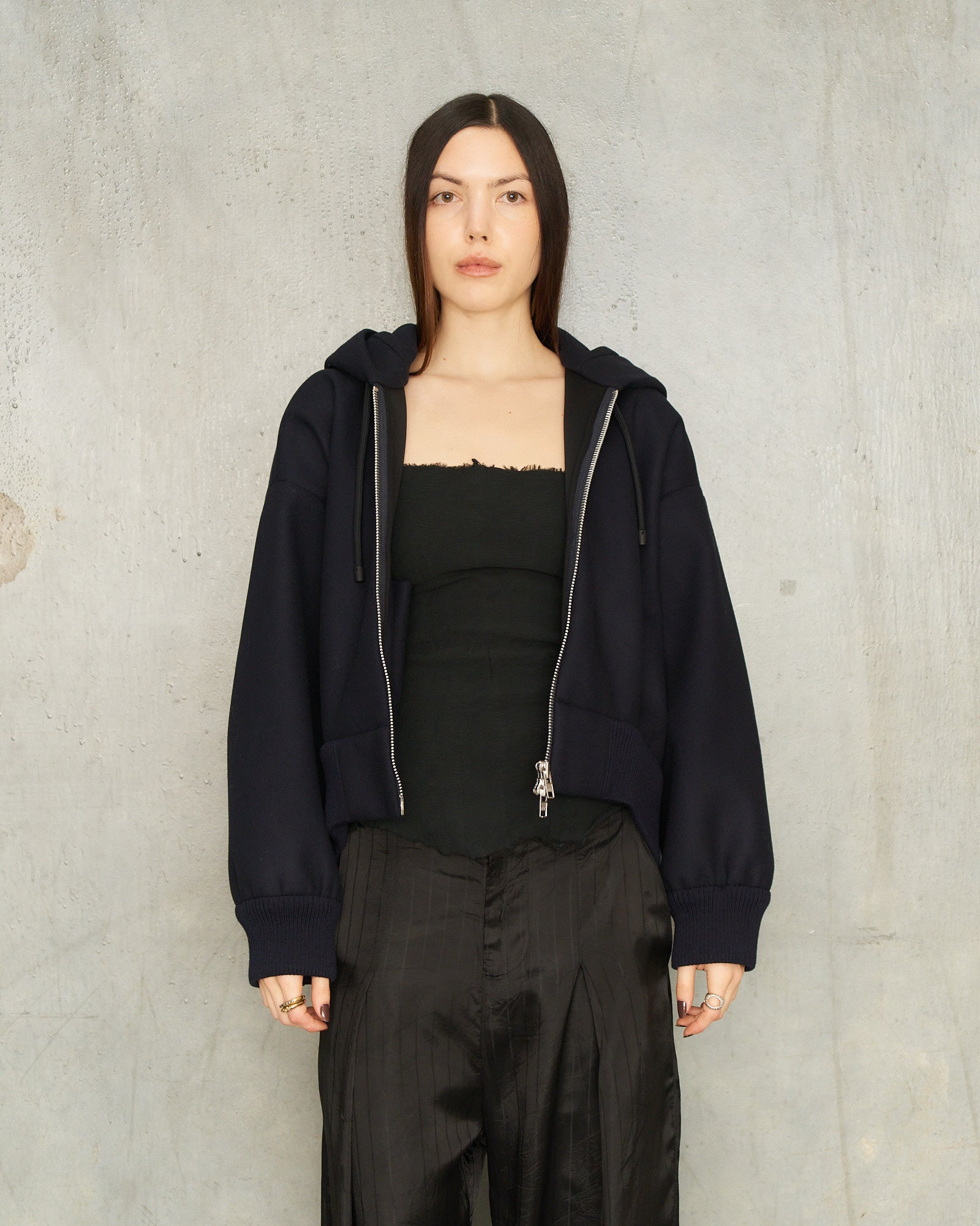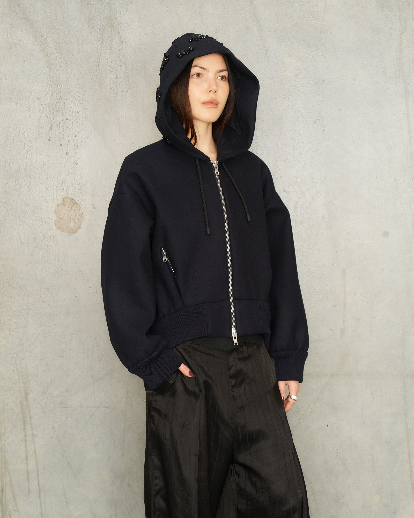 Embellished Hood Zip Bomber by Simone Rocha in navy. A boxy-cut jacket detailed with black crystal cluster embellishment at the hood, finished with a silver zip closure, ribbed hem and cuffs, and an adjustable drawstring hood.