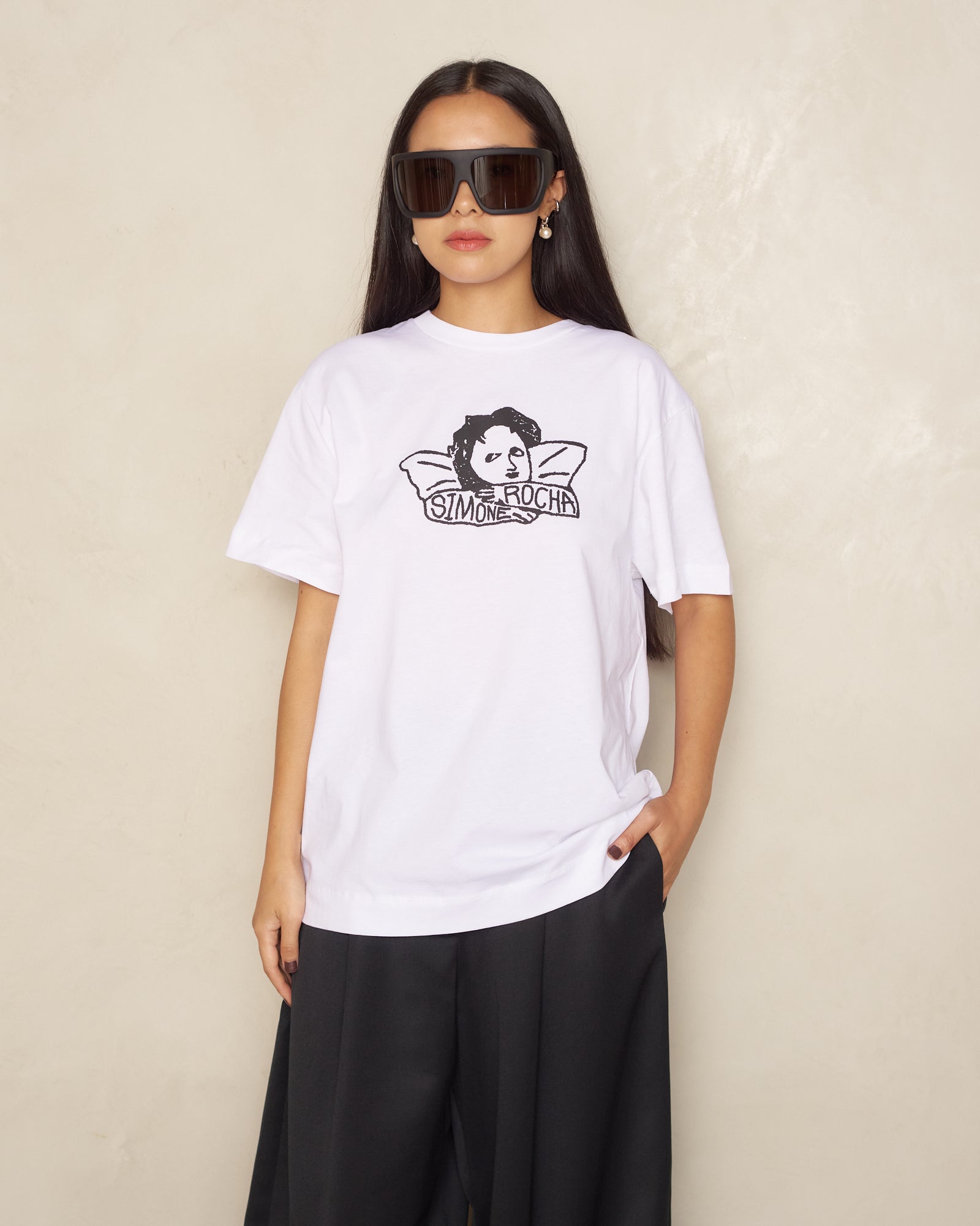 Cherub T-shirt by Simone Rocha. Crafted from cotton jersey, this top presents an angel graphic conceived by Daniel David Freeman, playfully reimagining the Simone Rocha logo on both the front and rear. Its sumptuous texture gives a luxurious feel, while the relaxed, dropped shoulder fit ensures effortless wear.