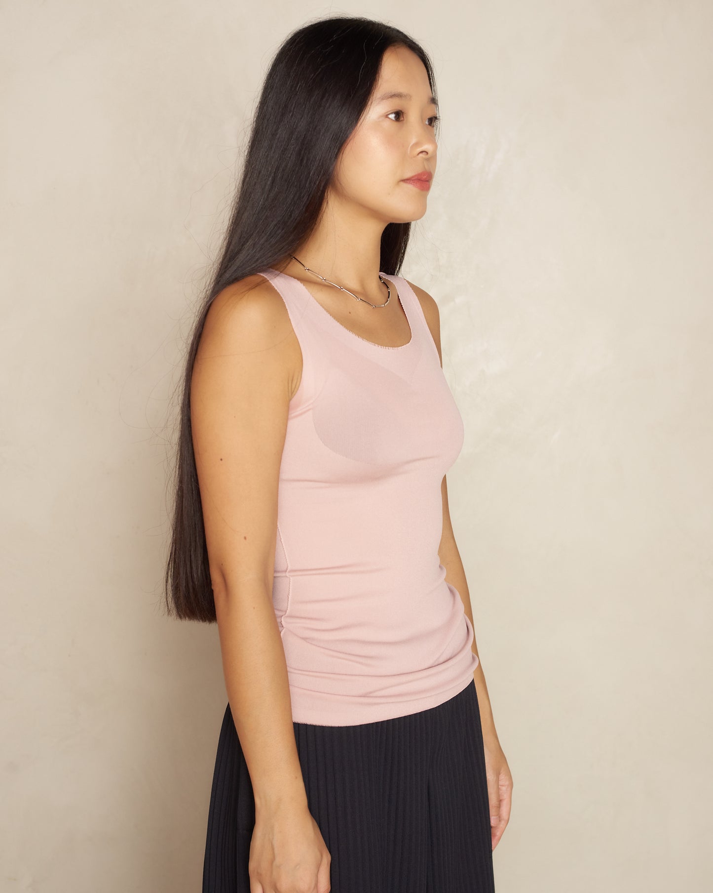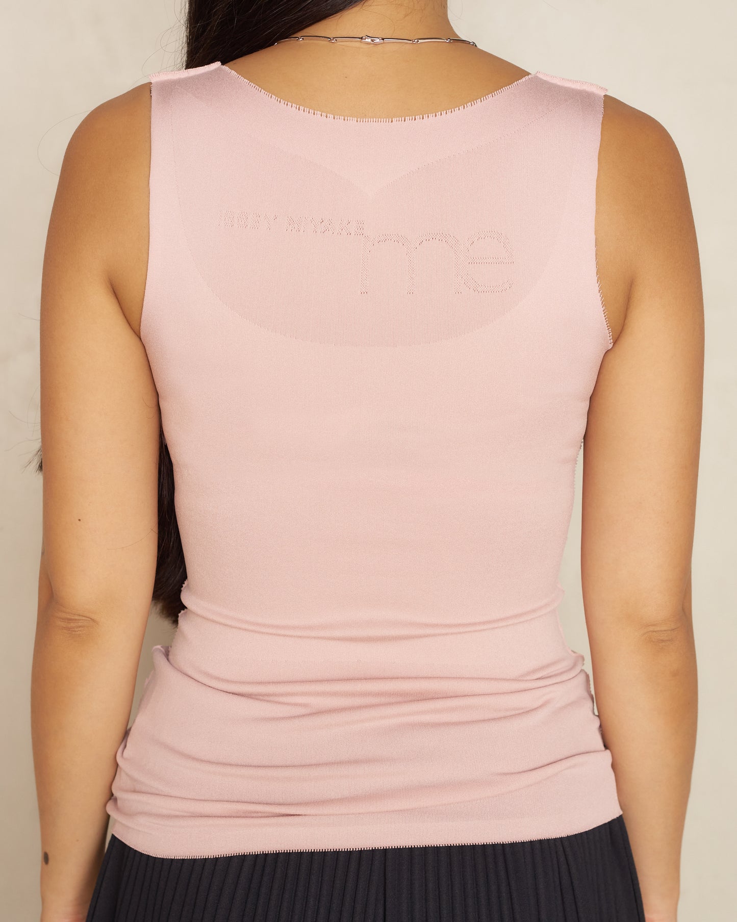 Fitted tank top by Issey Miyake ME in smokey rose. Featuring a fringed neckline and seams with subtle brand insignia at the rear, this tank is fabricated from a stretch material that dries quickly and has deodorant effects.