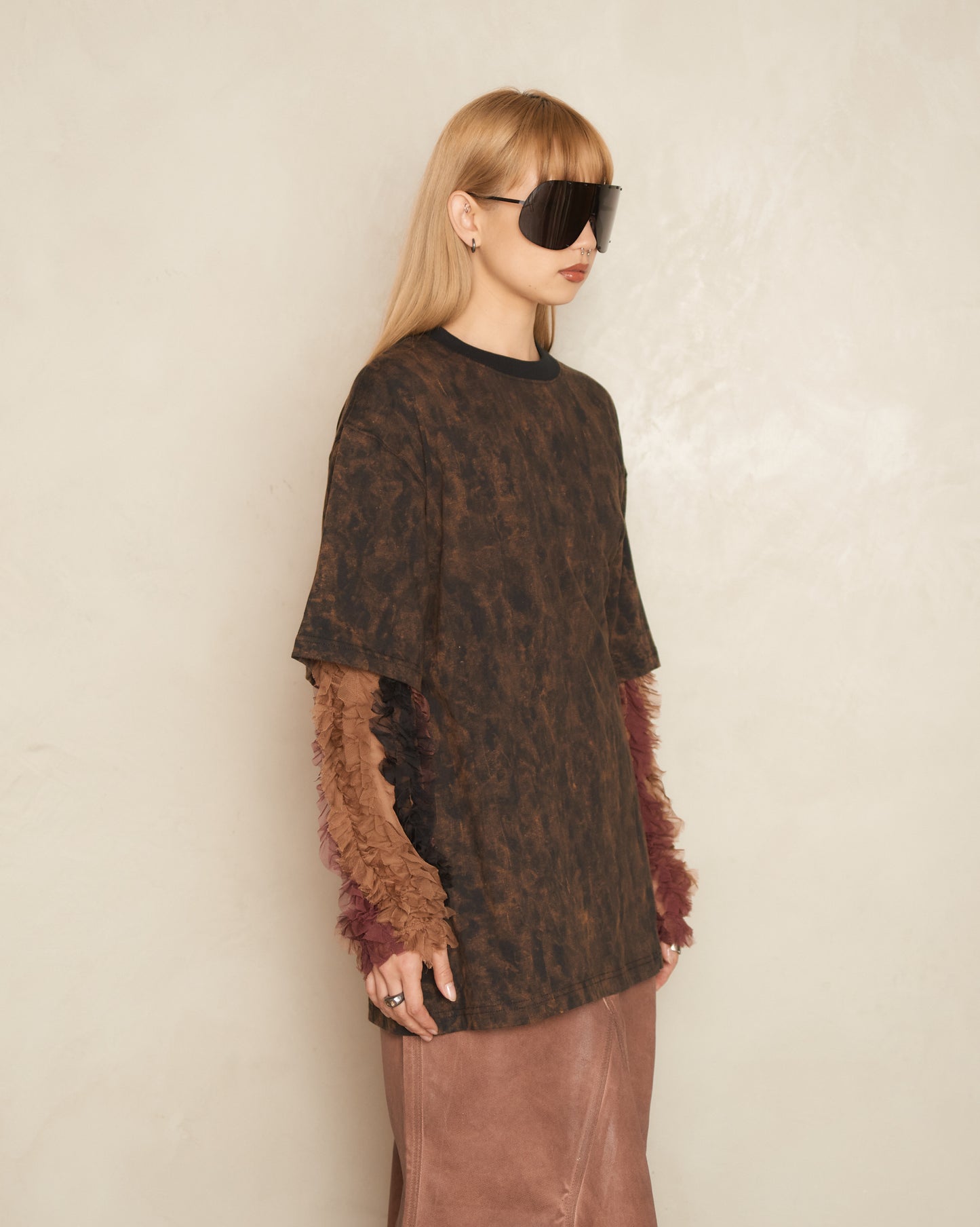 Double layered T-shirt by Song for the Mute. Oversize baggy tee with longsleeve underlayer attached. Composed of a thick tie-dyed cotton jersey body with a spectral brown finish. Sleeve extensions in complementing tones of orange and mauve, expressed in ruffled nylon chiffon.