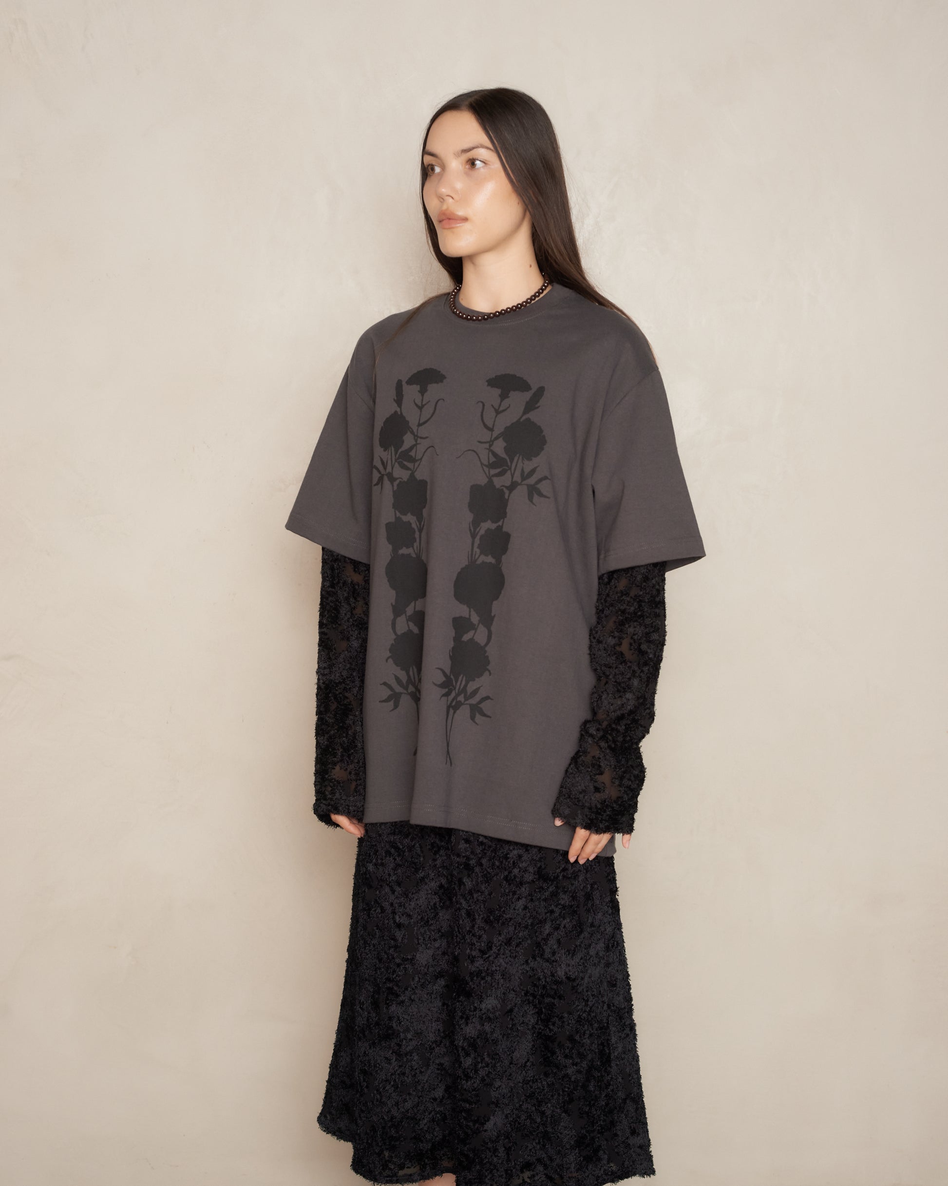 Black foliage double layered T-shirt by Song for the Mute. Oversize baggy T-shirt with longsleeve underlayer attached. Main body crafted from a thick cotton jersey with focal mirrored foliage print. Tactile sleeve extensions spill out from beneath with shaggy floral formations.
