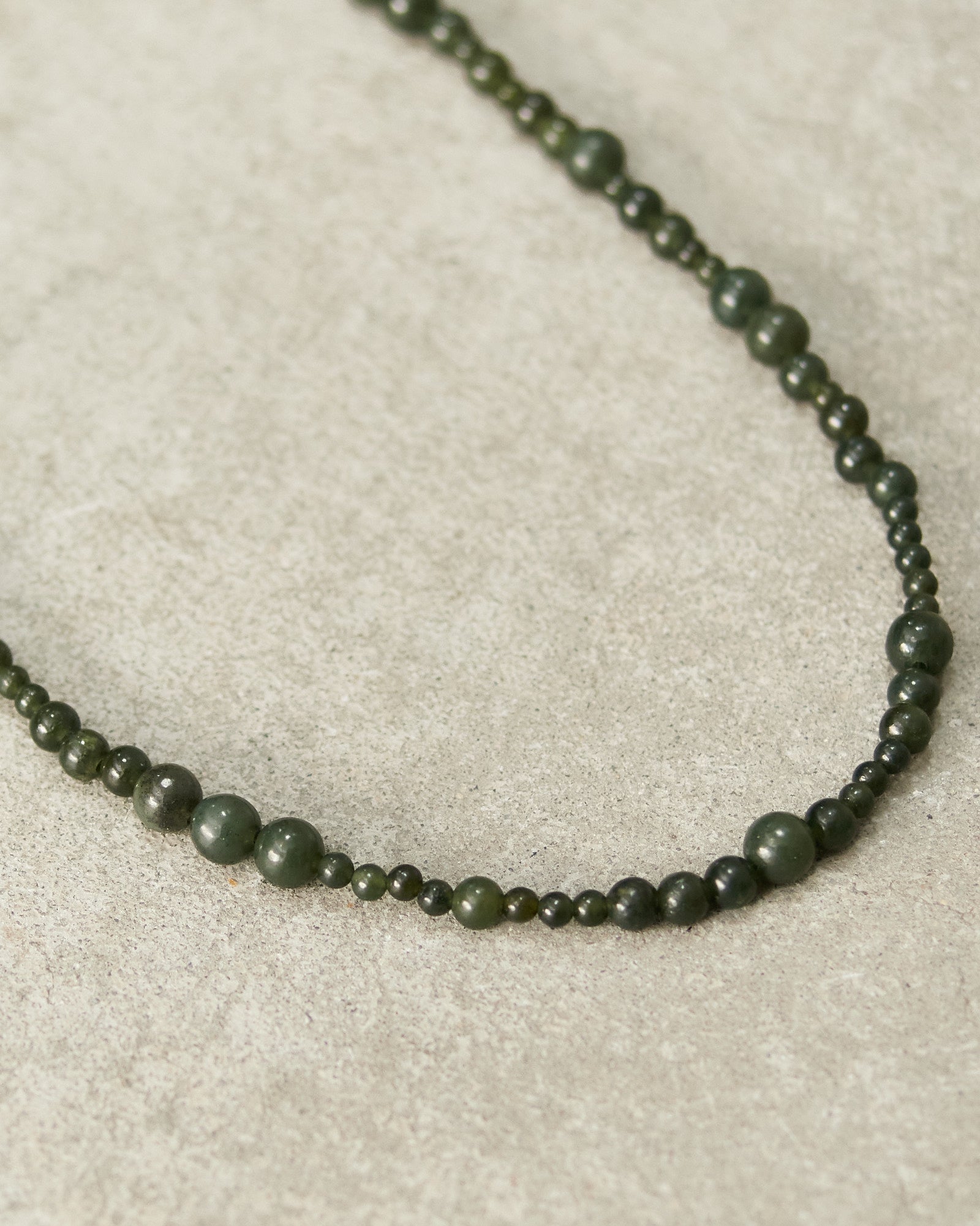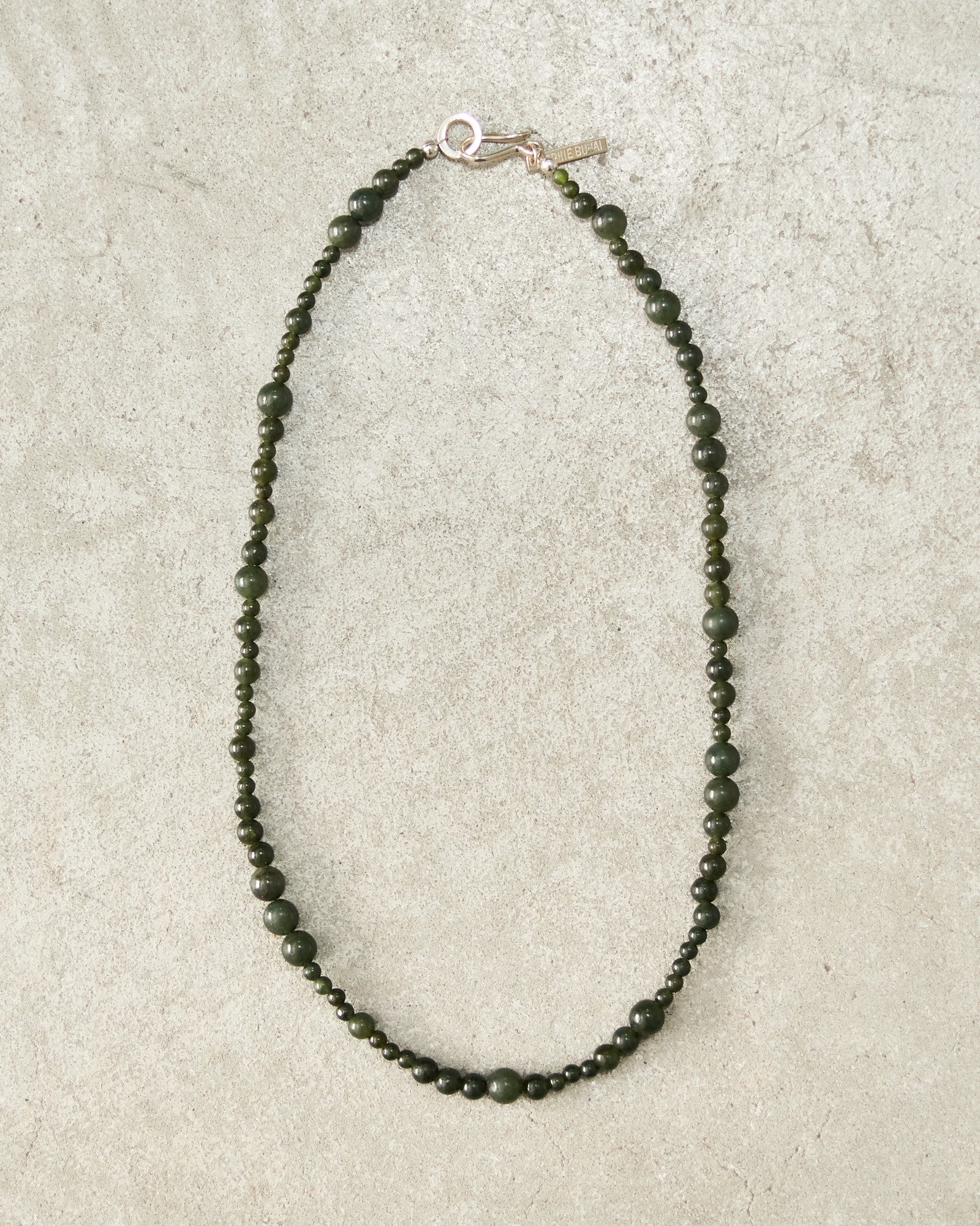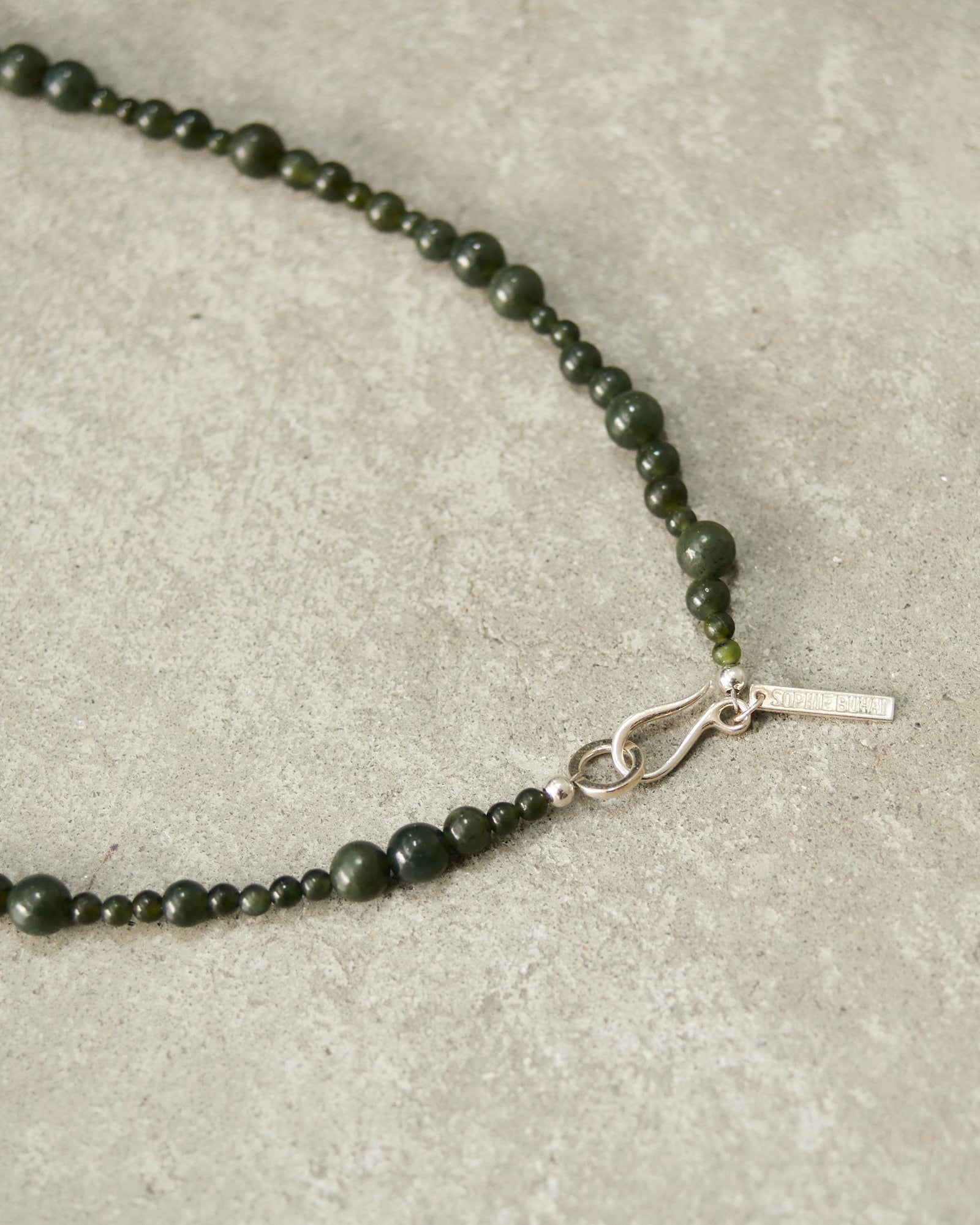 Constellation necklace by Sophie Buhai in jade. Refined 16-inch strand of smooth jade beads in varying sizes, arranged in quiet harmony. Finished with Sophie Buhai’s signature sculpted sterling silver hook clasp at the nape.