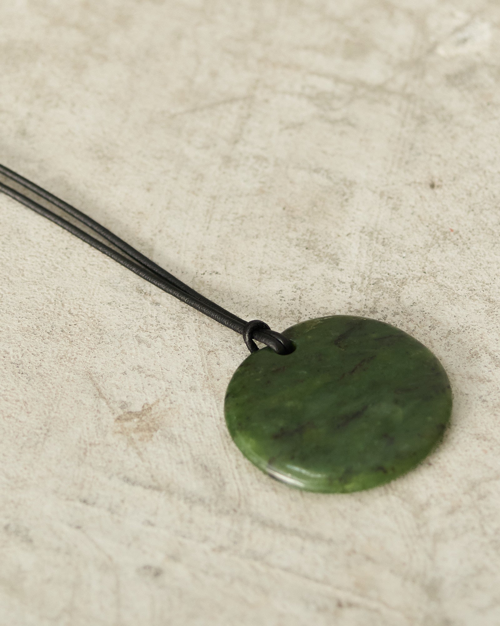Full moon pendant by Sophie Buhai in jade. Refined pendant necklace showcasing the brilliance of jade in a sculptural disc. Suspended from an adjustable vegan leather cord with sterling silver teardrop ends, this minimal yet opulent piece offers a refined elegance.
