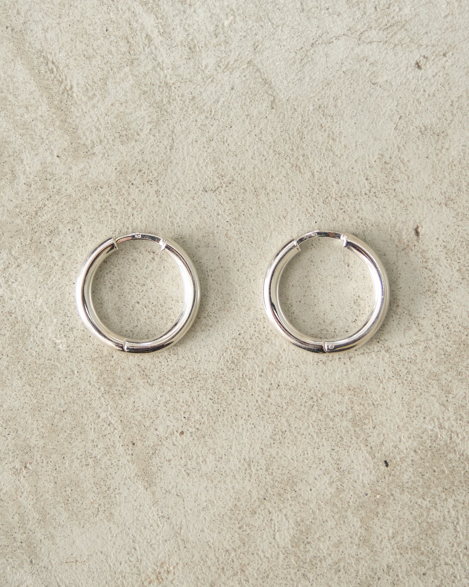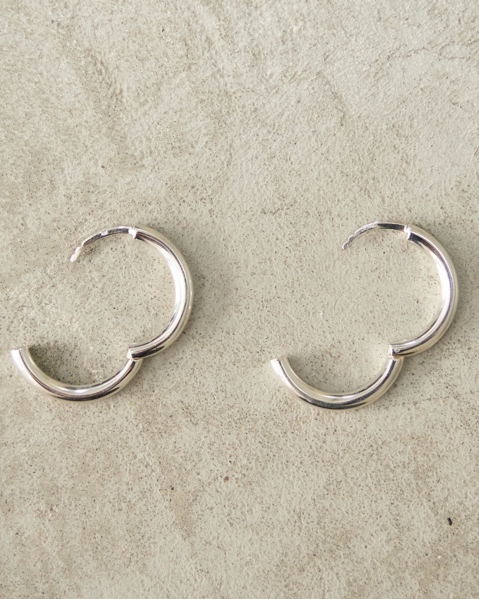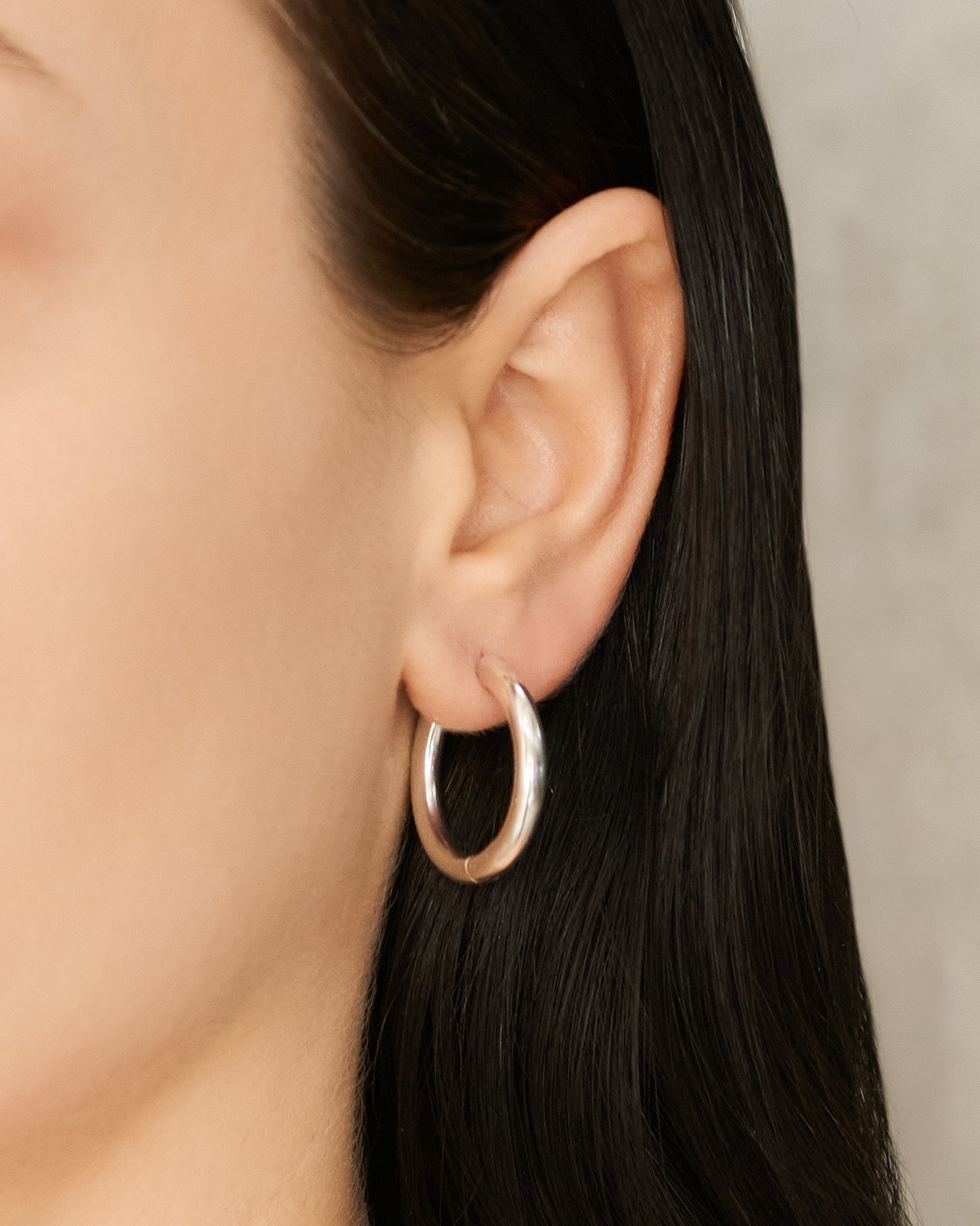 Phiona hoops by Sophie Buhai in sterling silver. Sleek, lightweight hoops designed for everyday wear, featuring a seamless engineered hinge closure for effortless comfort.