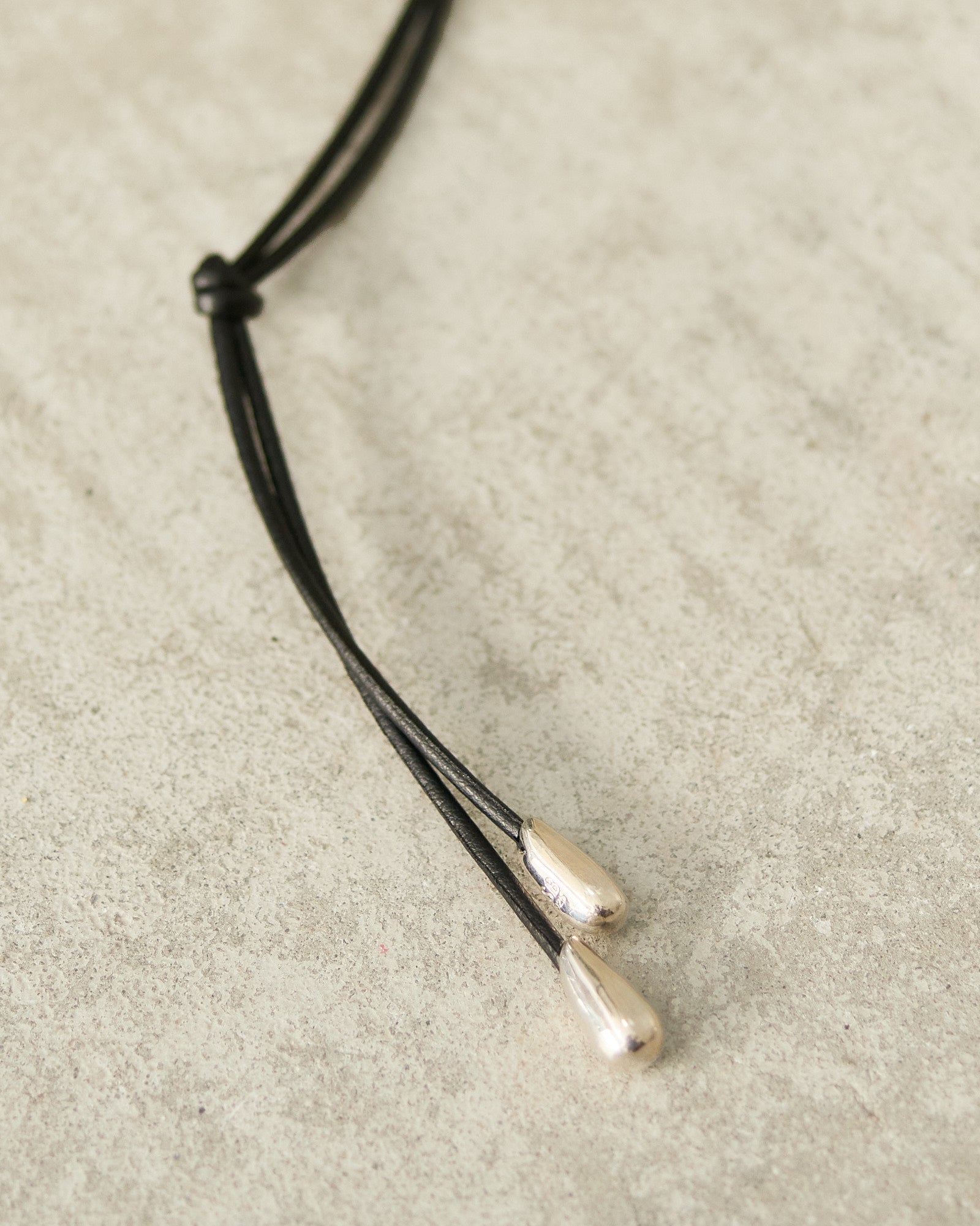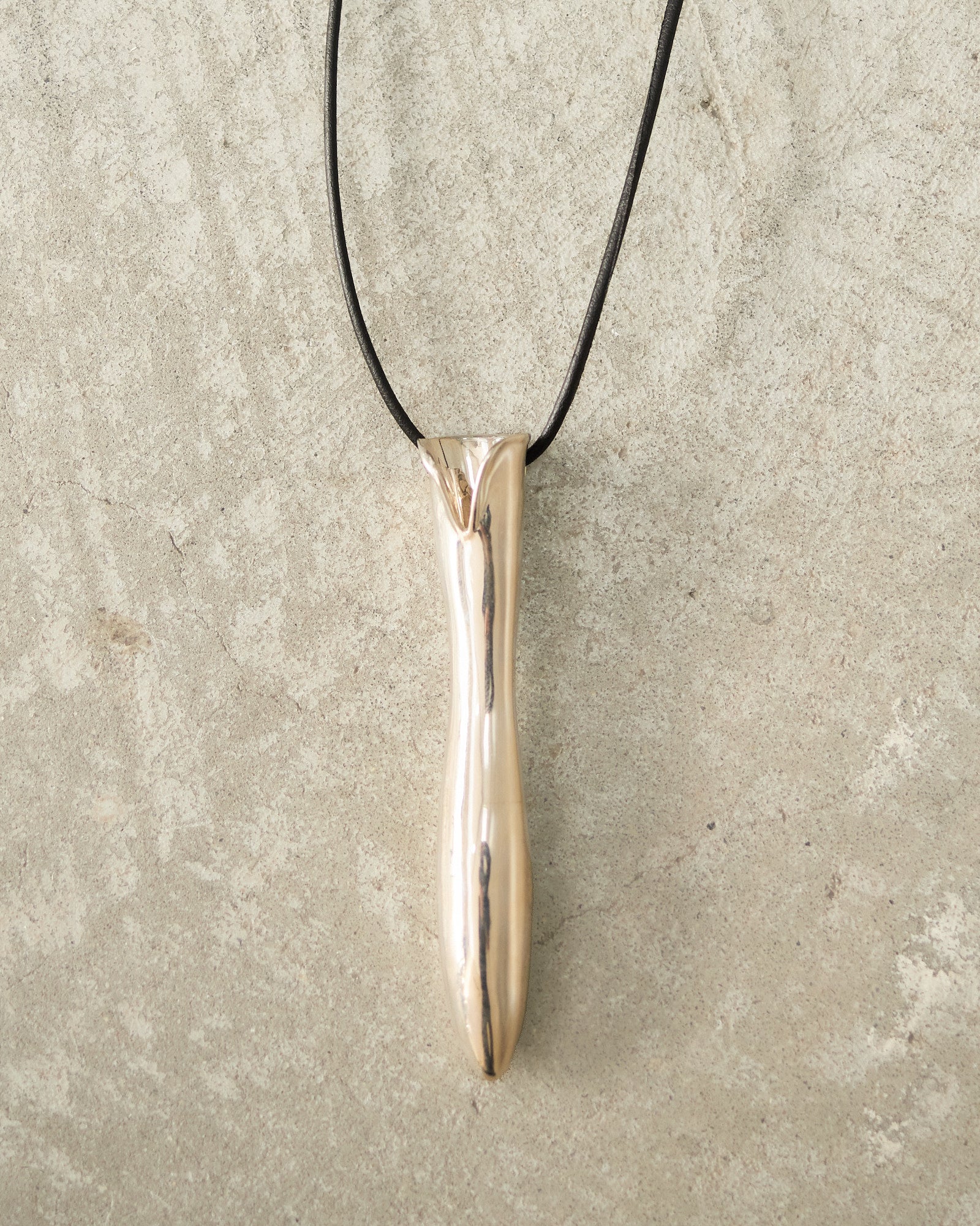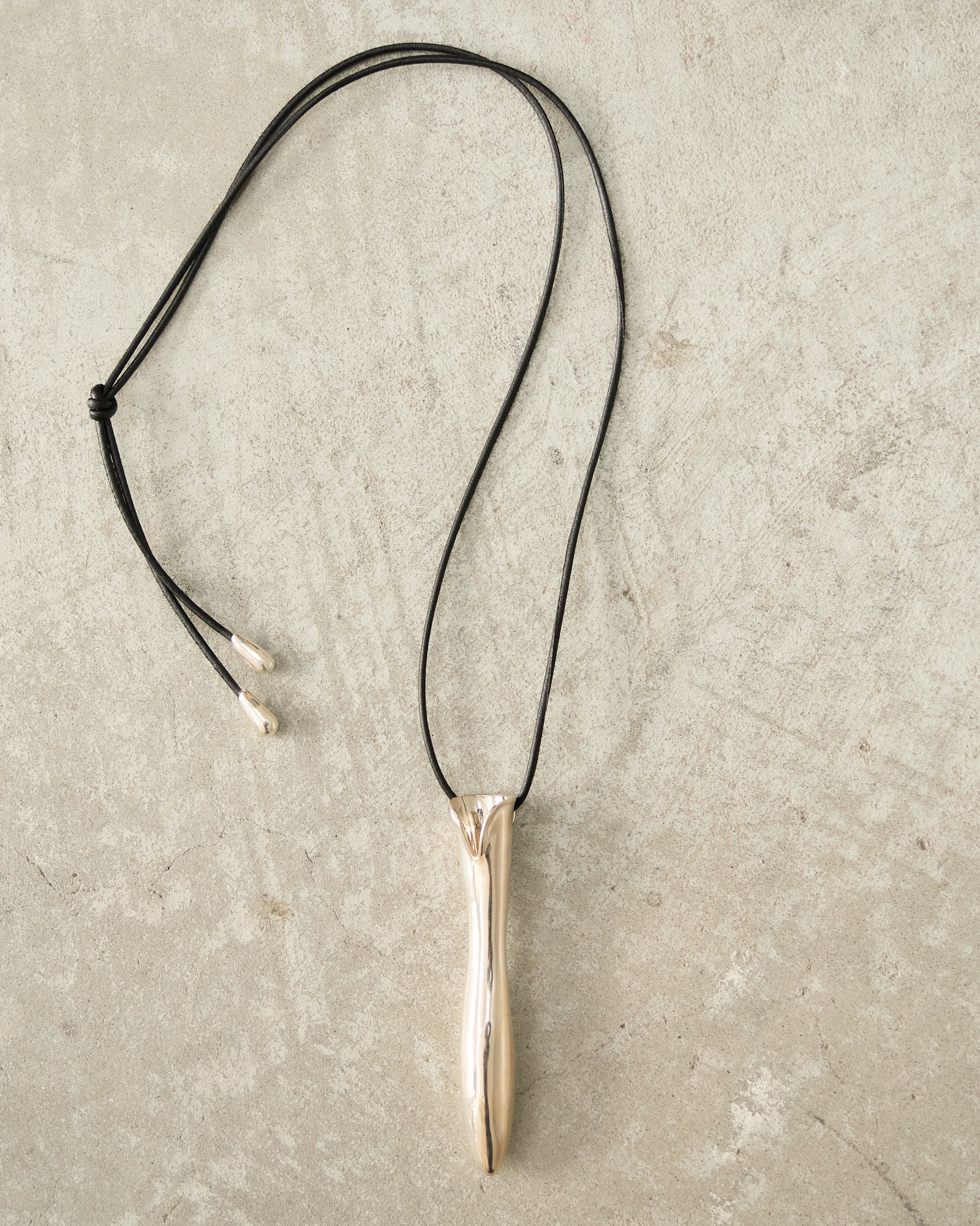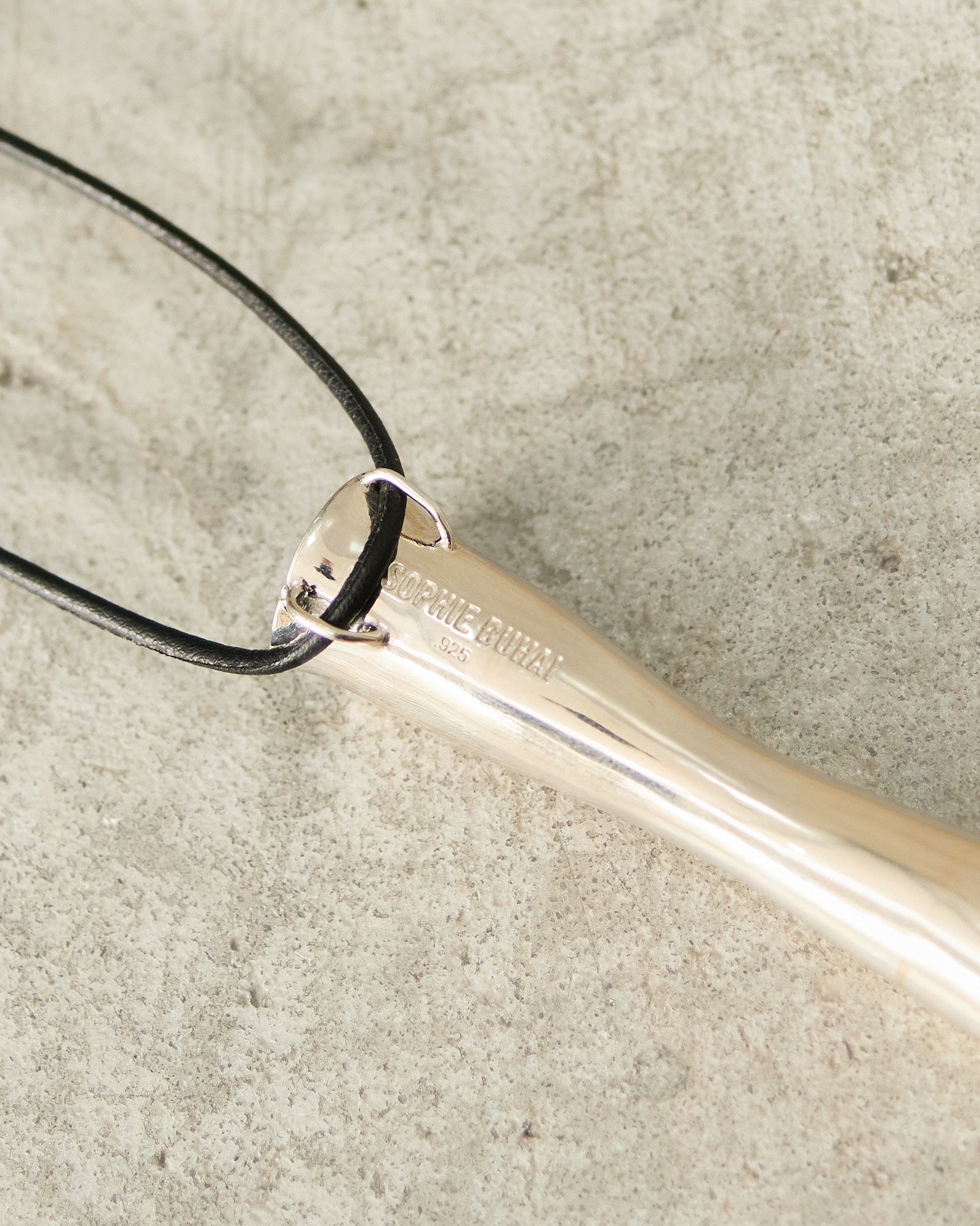 Vessel necklace by Sophie Buhai in sterling silver. Sculptural, polished sterling silver vessel pendant suspended from a vegan leather cord tipped in sterling silver. A modern reliquary designed to be worn alone or adorned with a cherished sprig of florals.