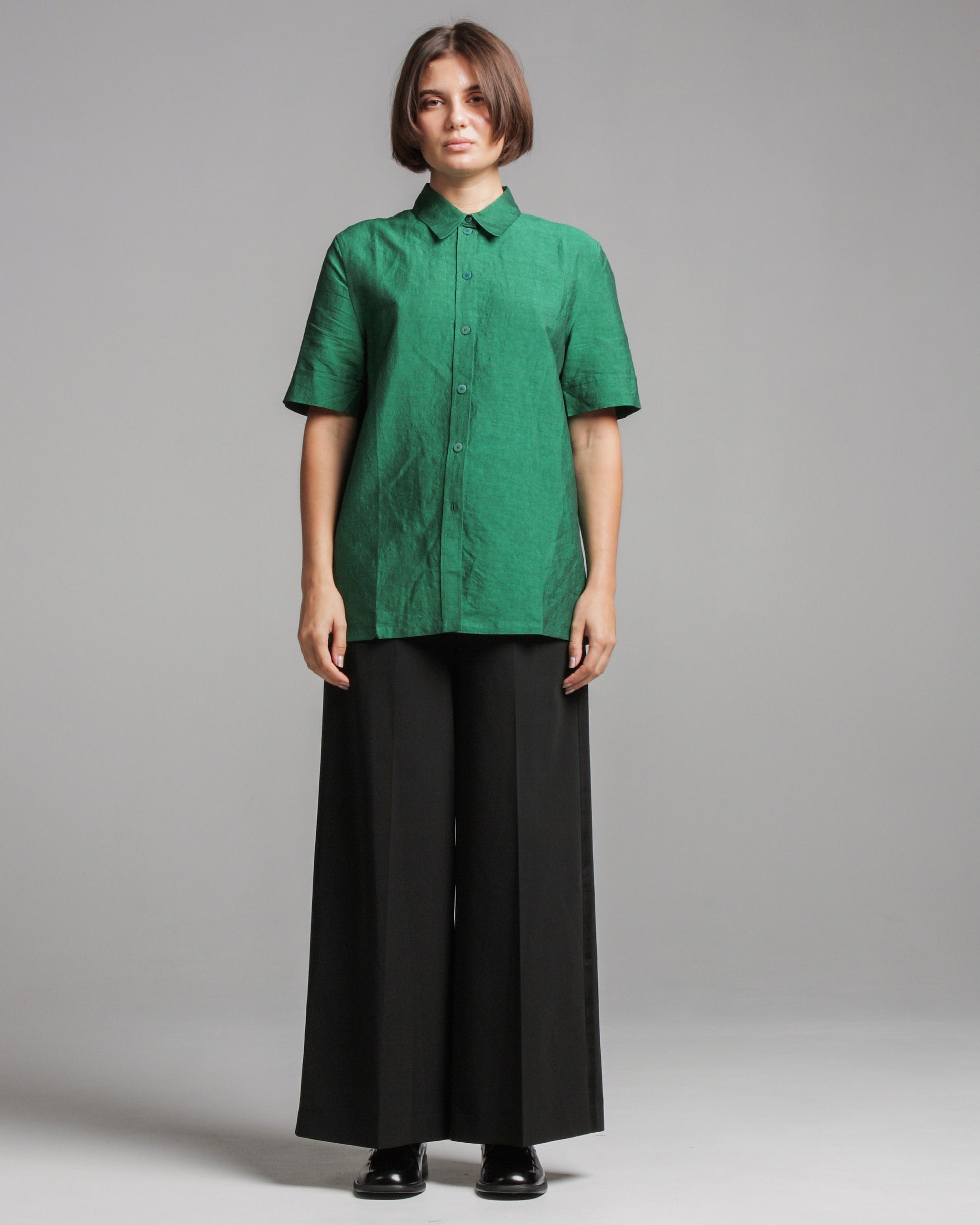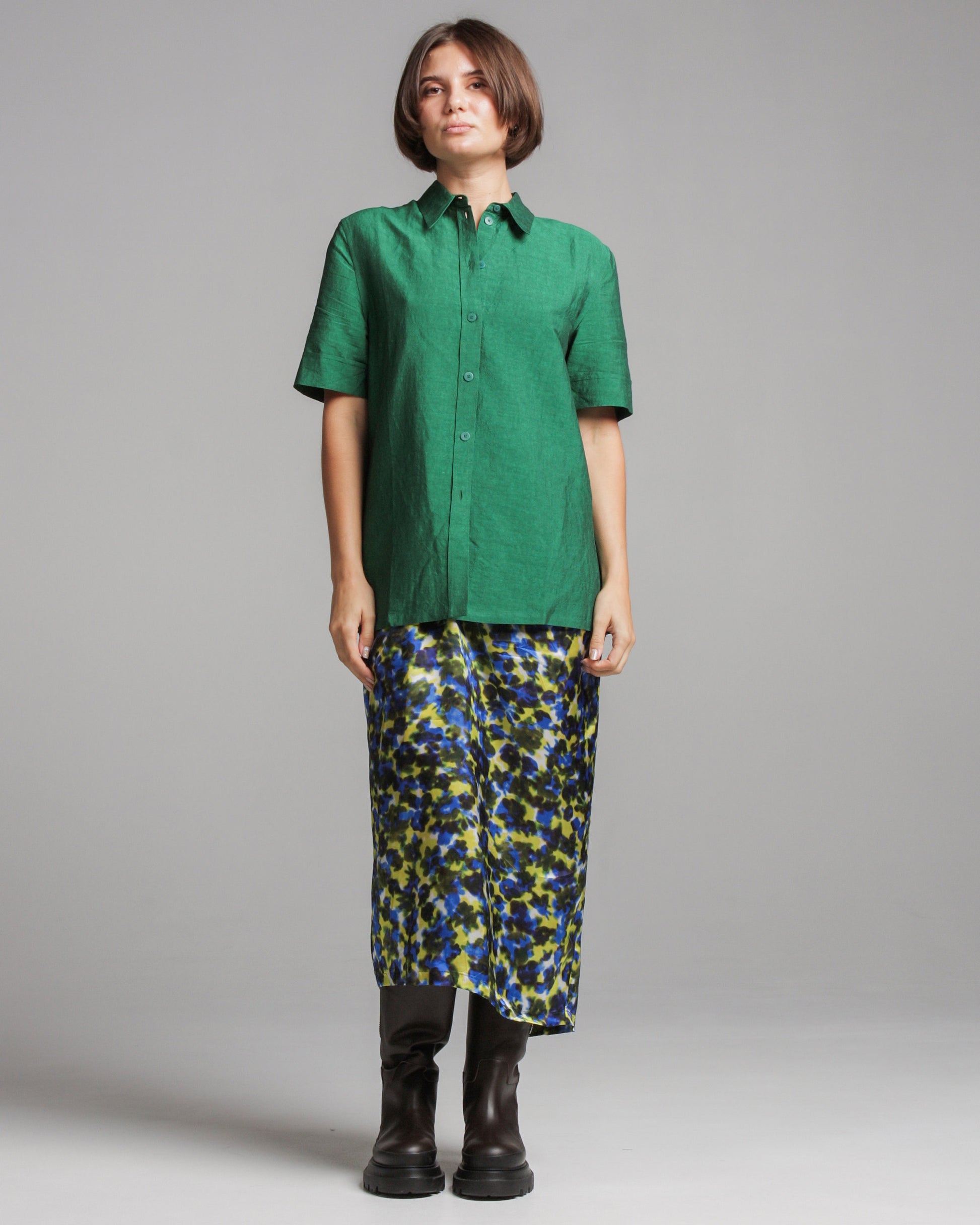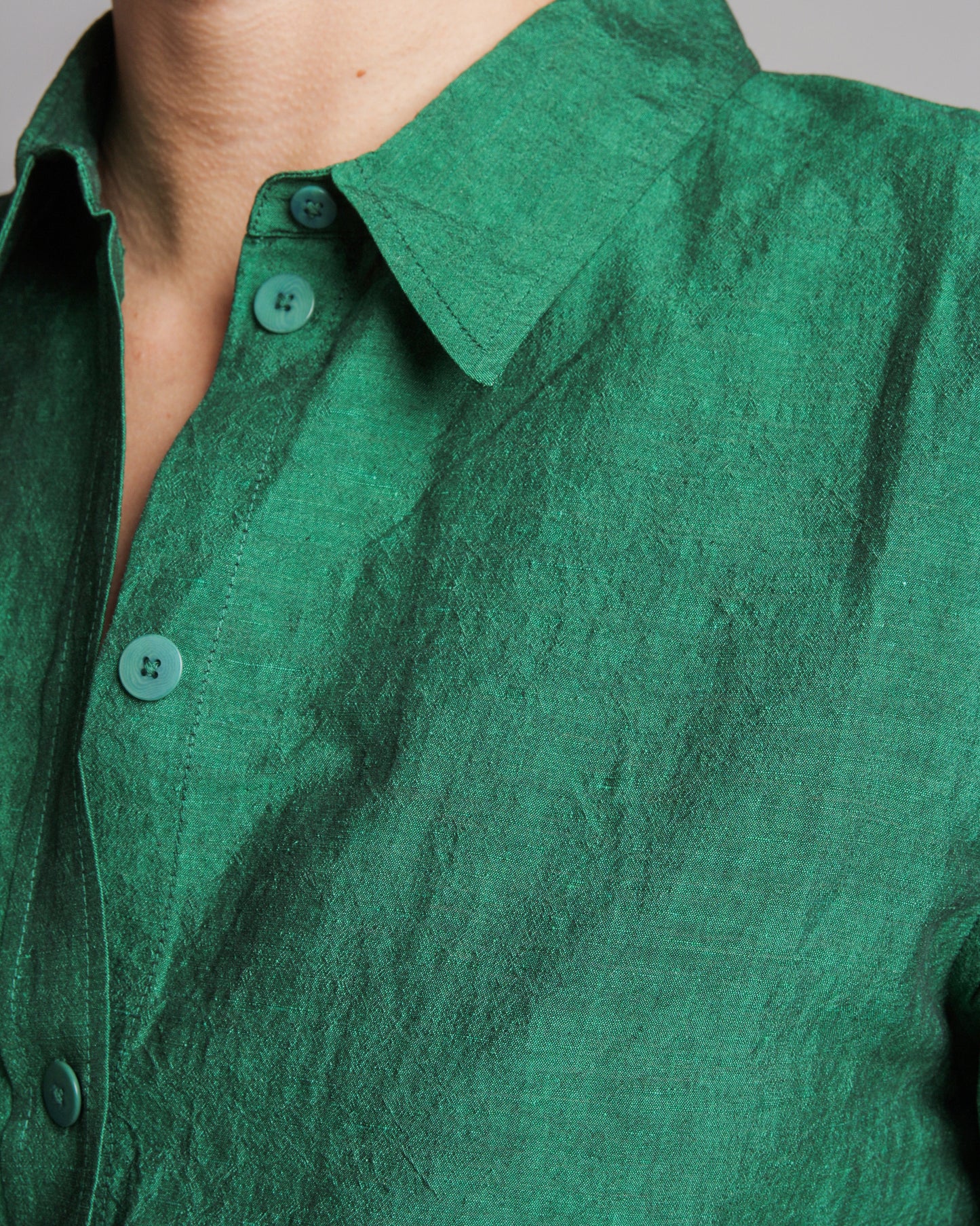Terrence short sleeve shirt by Christian Wijnants in green. Structured shirt in a crinkled blend of linen and cotton, woven with an iridescent yarn to give a subtle sheen. Finished with tonal green buttons, turn up sleeves and a straight hem - marrying a textural sensuality with stylish simplicity.