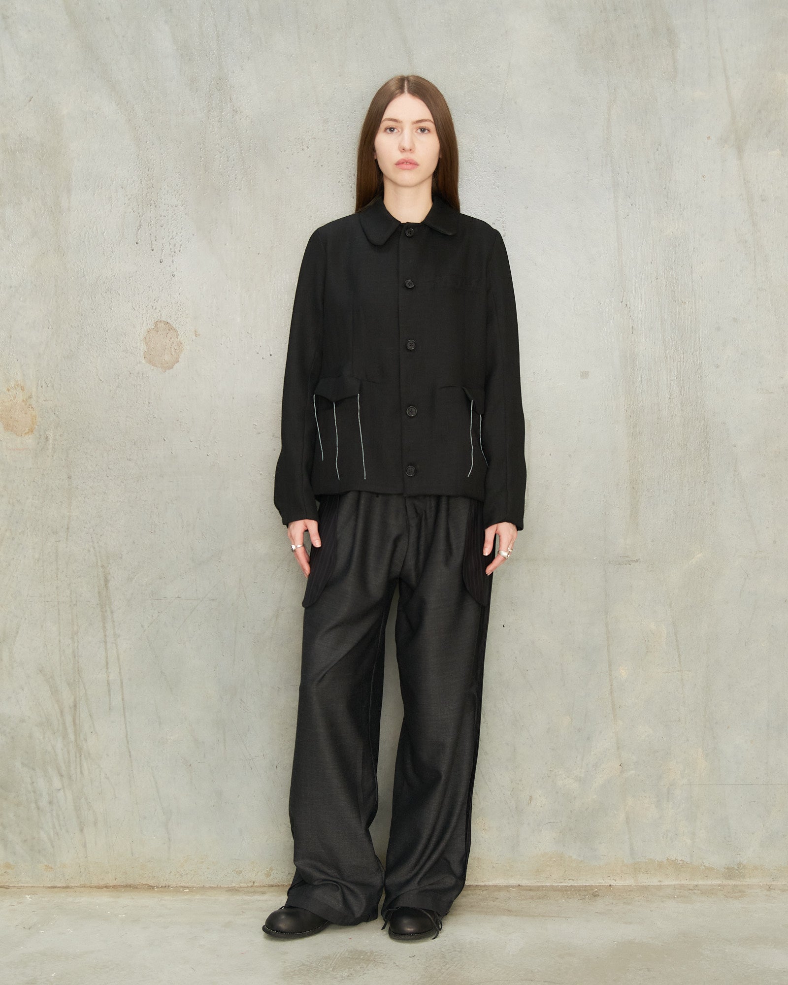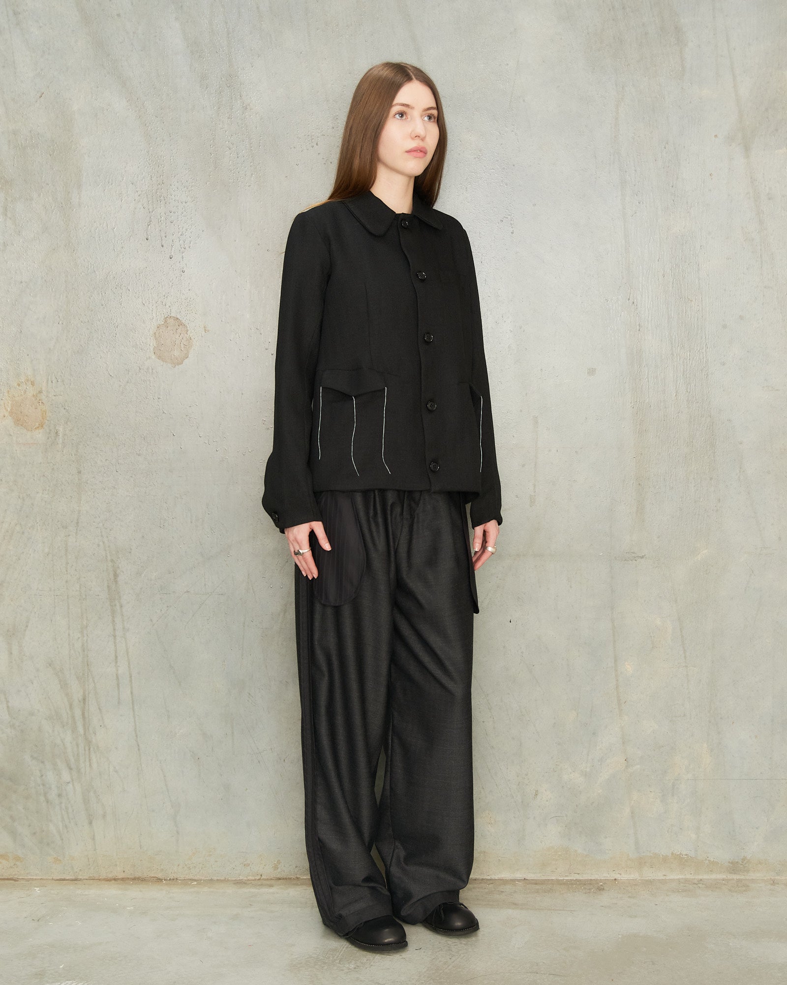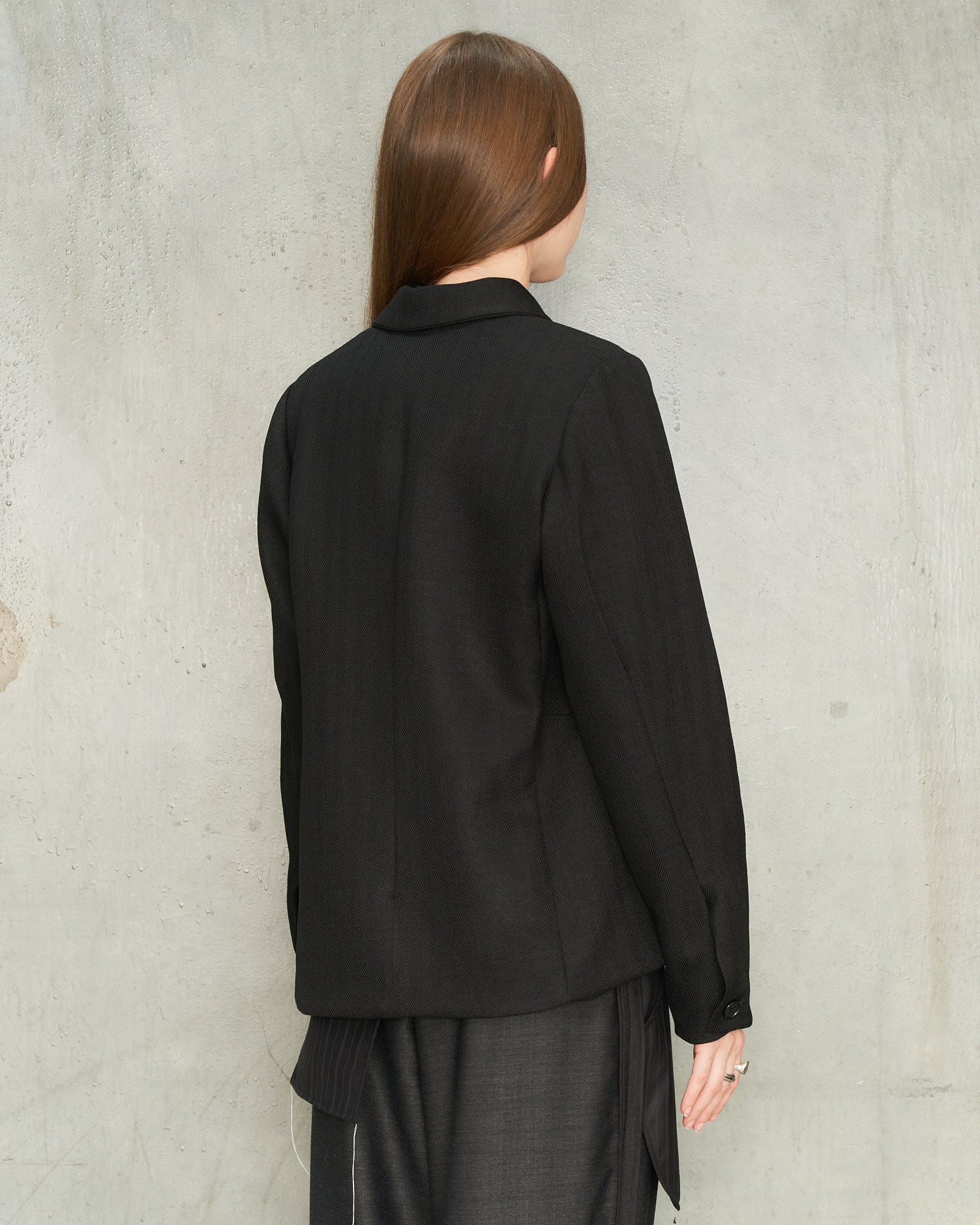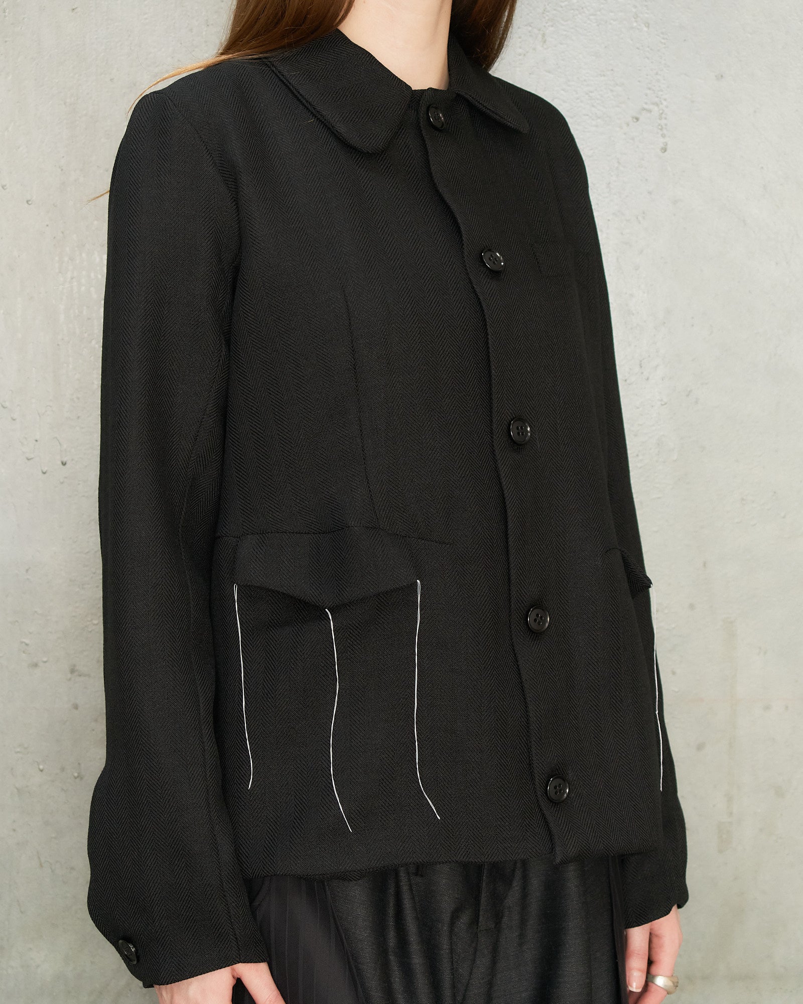 Black Herringbone Jacket by Tom Westlake. A tailored jacket in a subtle herringbone weave, designed with a generous fit, a softly curved collar and a full button front. Fine white threads near the two front pockets introduce a light, intentionally unfinished detail while maintaining the overall clean and refined finish of the piece.