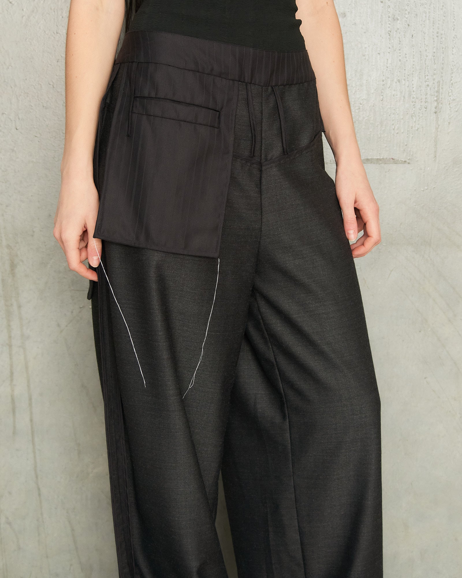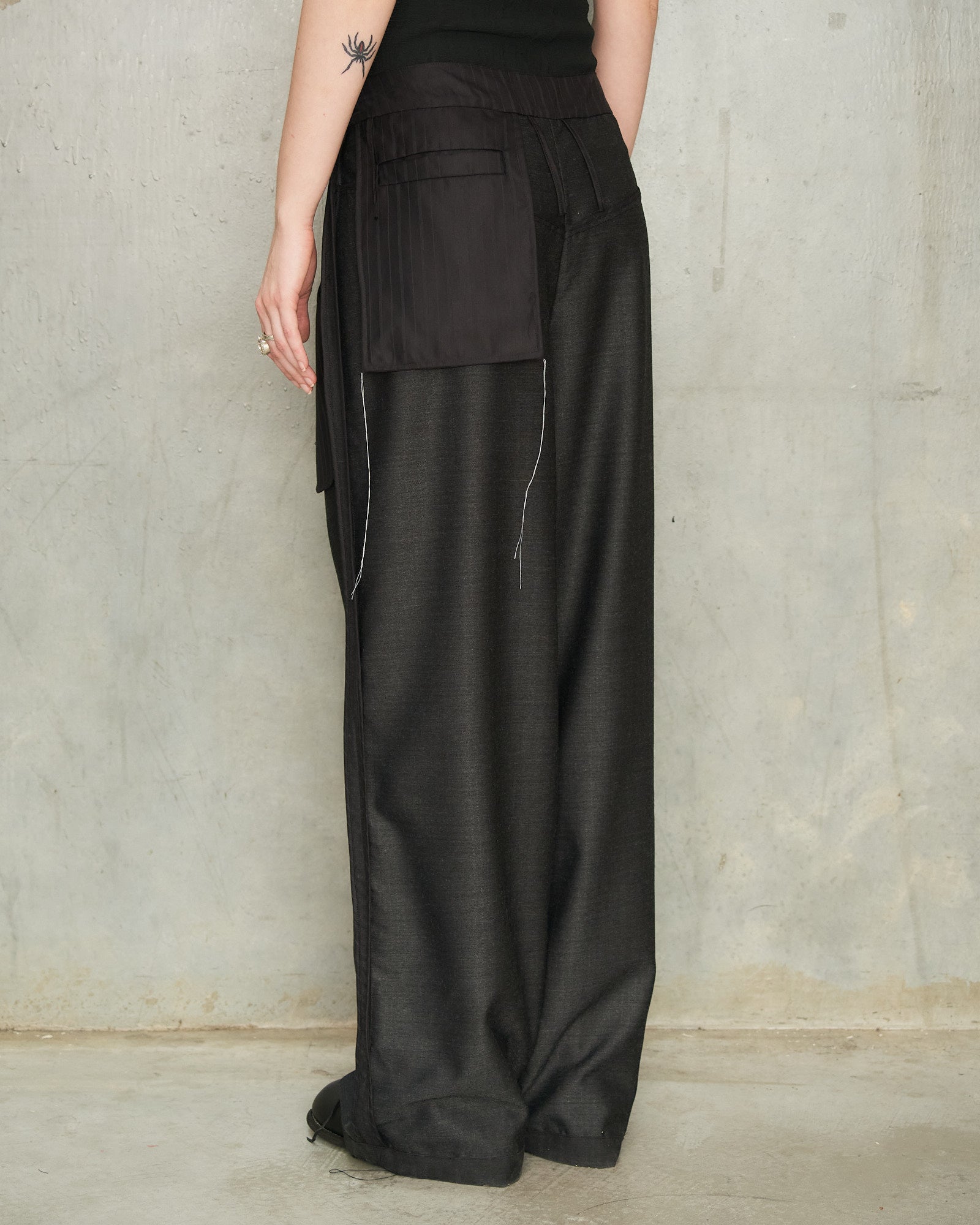Charcoal Reversed Trousers by Tom Westlake. Relaxed wide-leg trousers with a reversed, draped silhouette. Exposed pockets and seams contrast with the clean, finished waistband and zip. "Fly-front" at the centre back, and the back pockets are at the front. Fine white threads near the pockets add an intentionally unfinished, subtly distressed detail, highlighting the deconstructed character of the design.