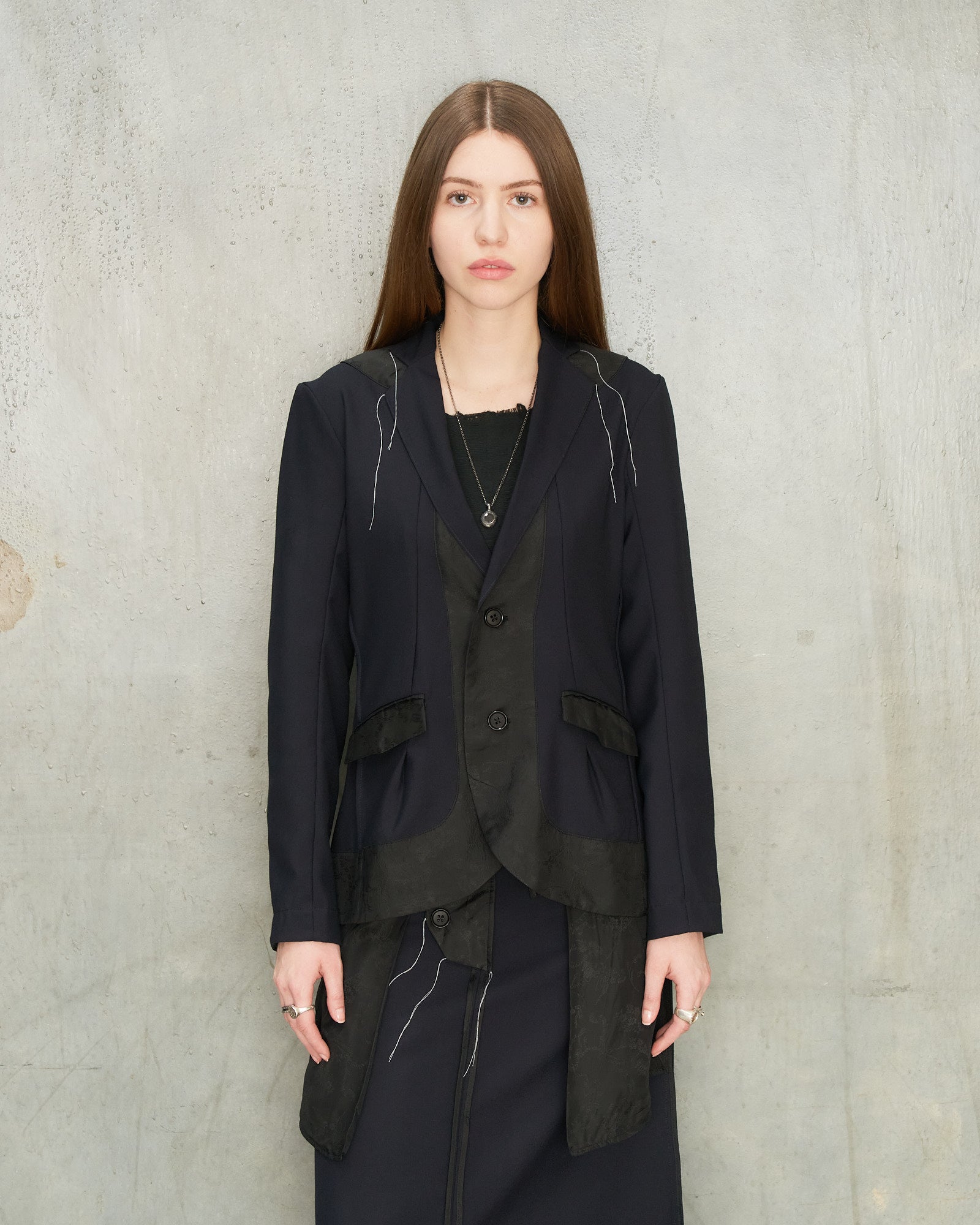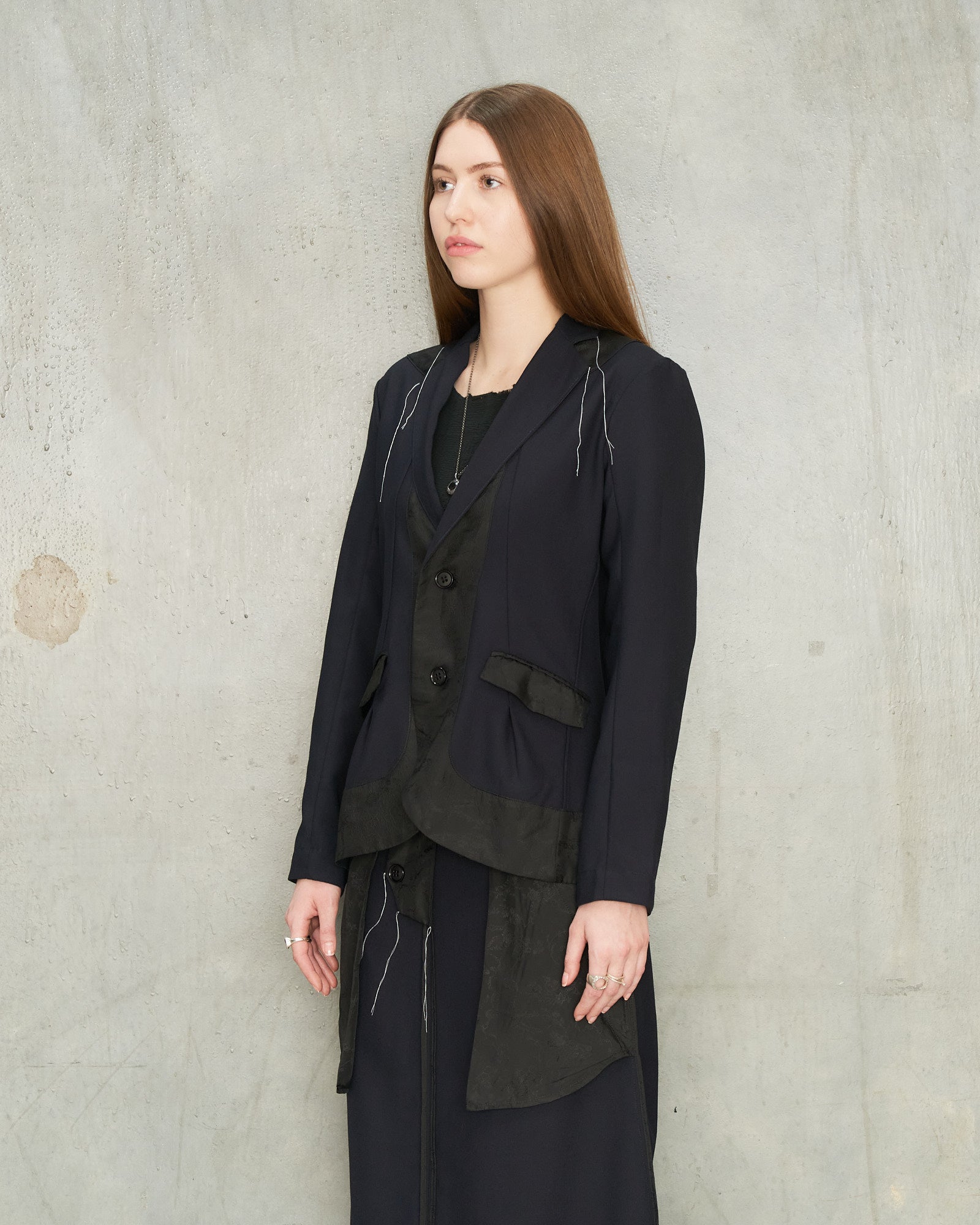 Navy Reversed Blazer by Tom Westlake. A tailored blazer with contrasting black jacquard panels that reveal themselves at the lapels, hem and pockets. The silhouette is slim and structured through the shoulders, finished with clean sleeves and a double breasted closure. Fine white threads near the lapel introduce an intentionally unfinished and subtly distressed touch.