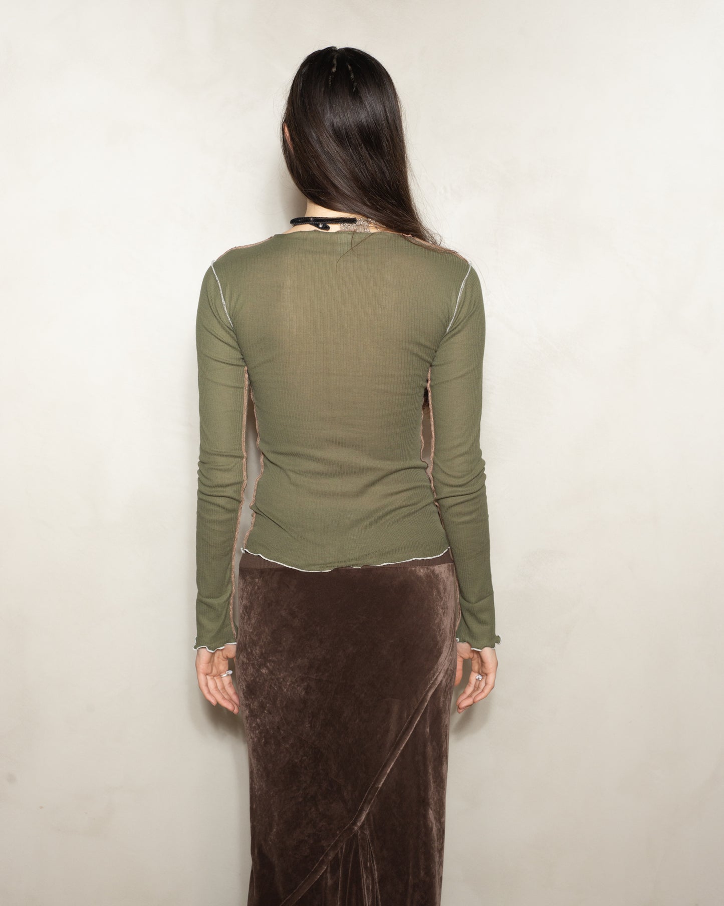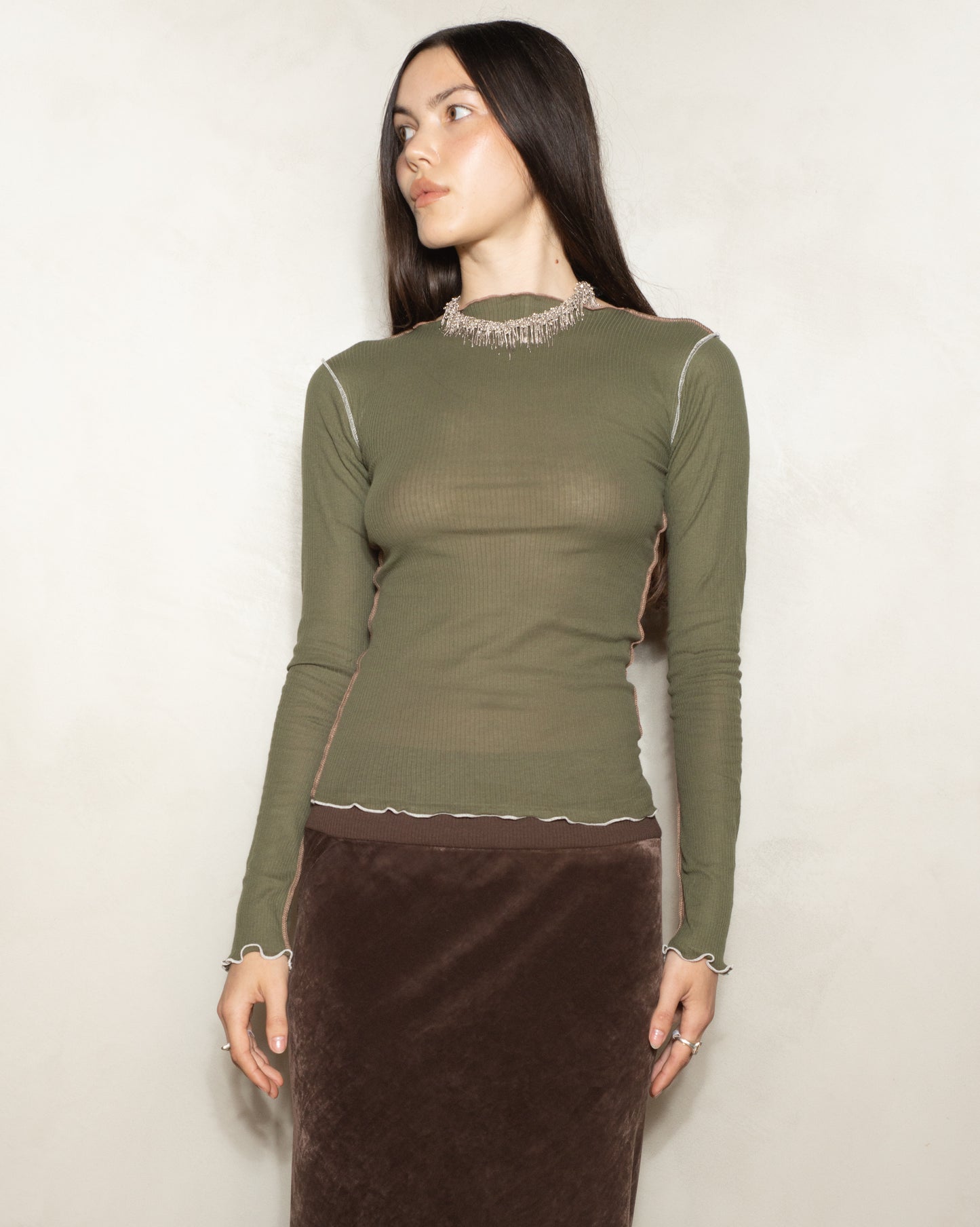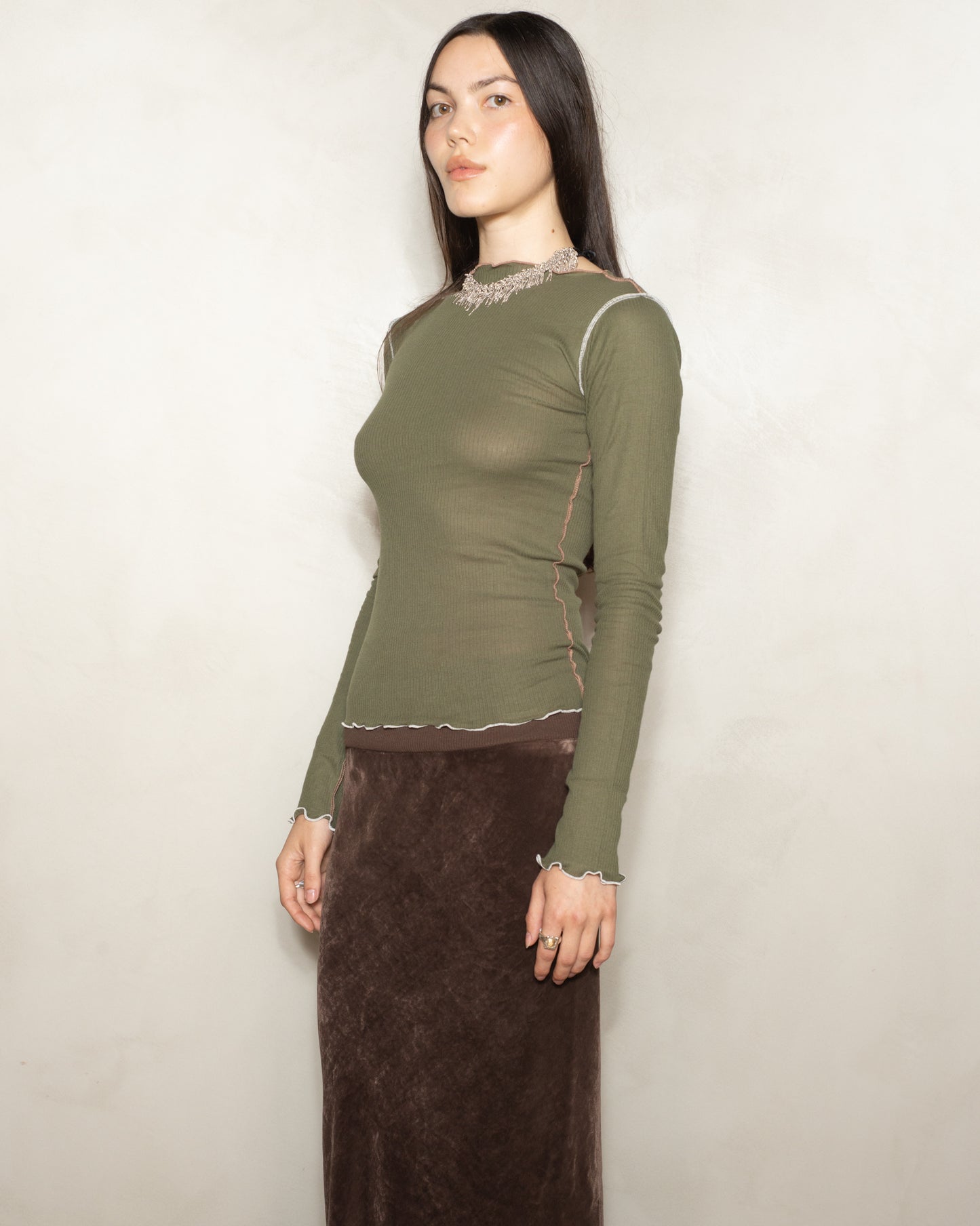 Vein longsleeve by Baserange in conto green. Form-fitting top in ribbed organic cotton, coloured using vegetal dyes. Wide boat neckline, detailed by scalloped hems and contrasting inverted babylock finish on all seams.
