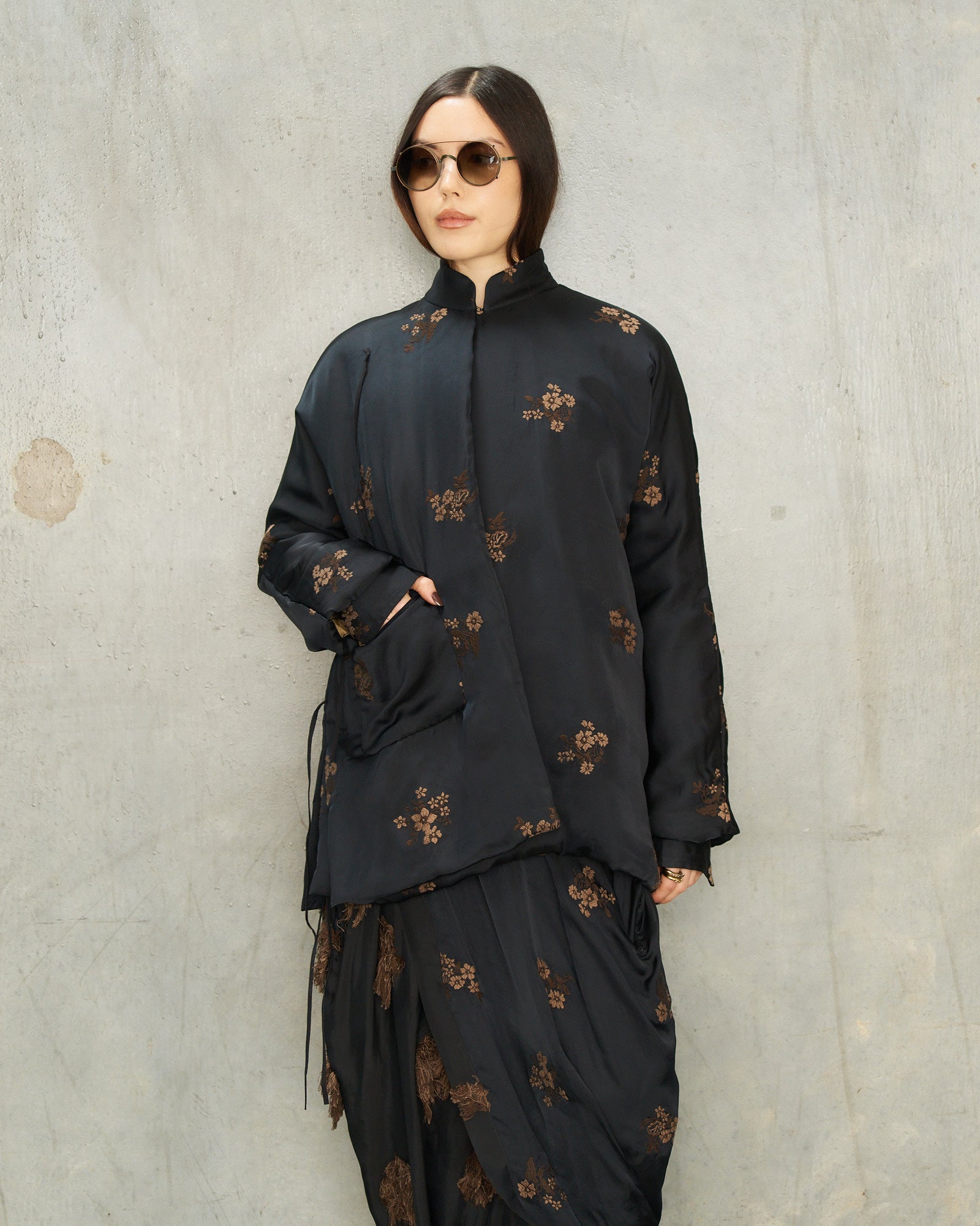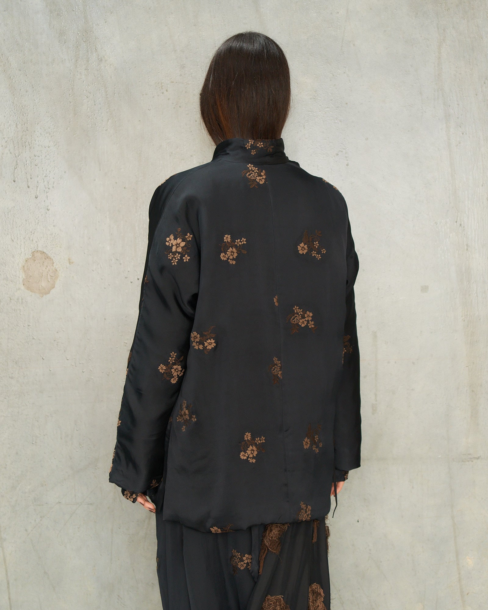 Emma jacket by Uma Wang in black embroidery. Elegant, structured jacket with a standing collar and asymmetric cheongsam-style closure fastened by a delicate ribbon bow. A refined fusion of Eastern heritage and Italian craftsmanship, rendered in a soft cotton and cupro blend that drapes fluidly with an understated sheen.