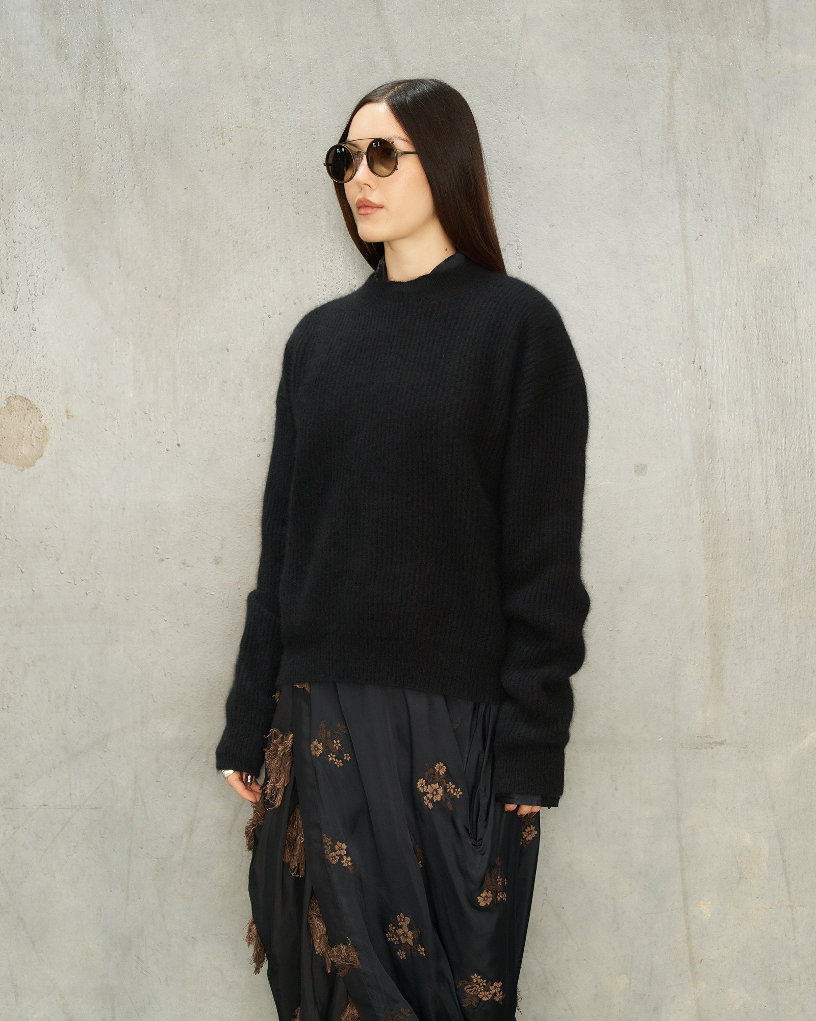 Raccoon knit sweater by Uma Wang in black. Feather-light and irresistibly soft, this sweater wears with an effortless grace. Fine raccoon knit with a subtle ribbed texture, it offers supreme warmth and comfort for the cooler seasons.