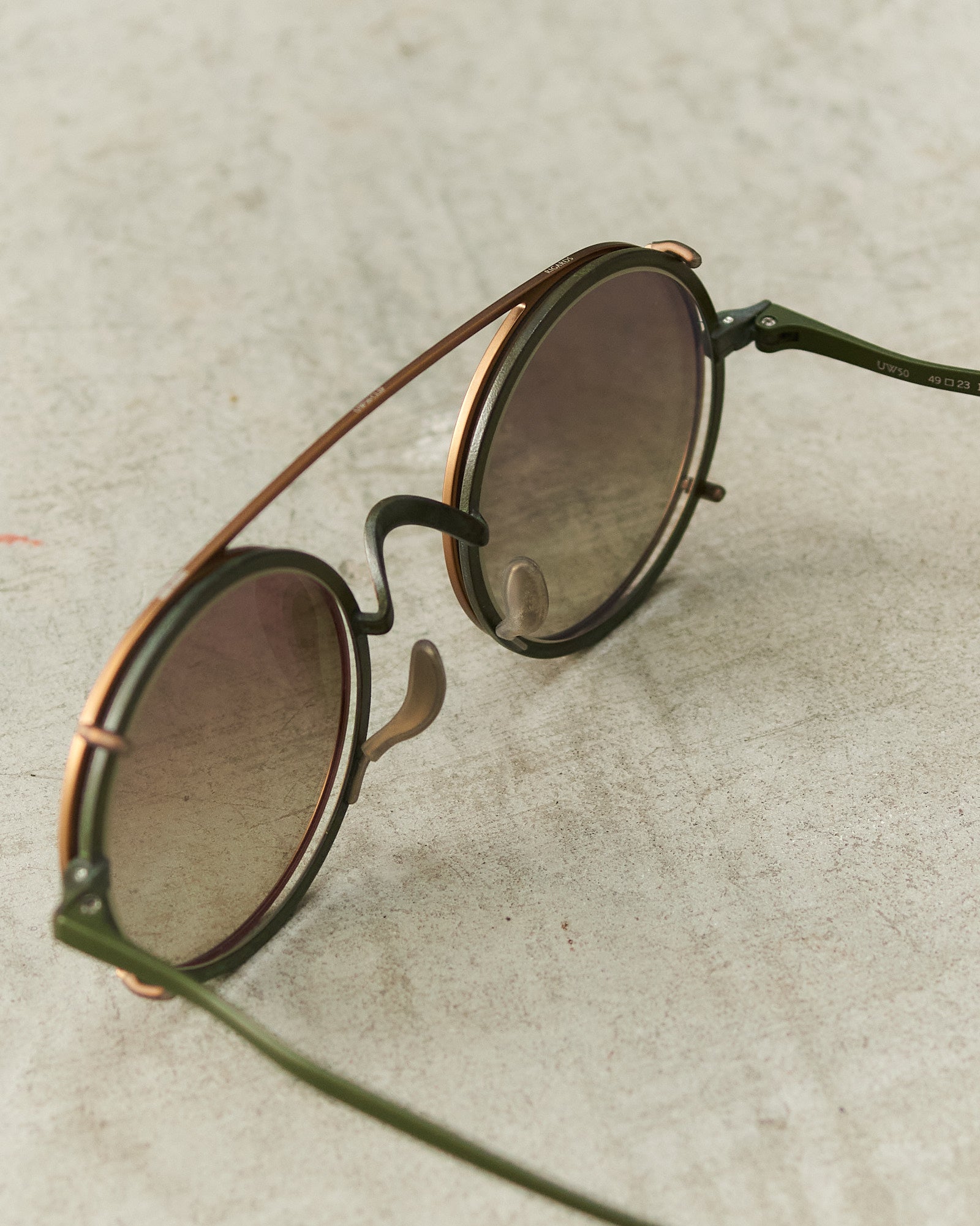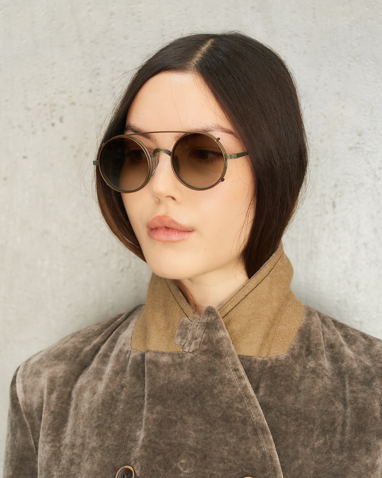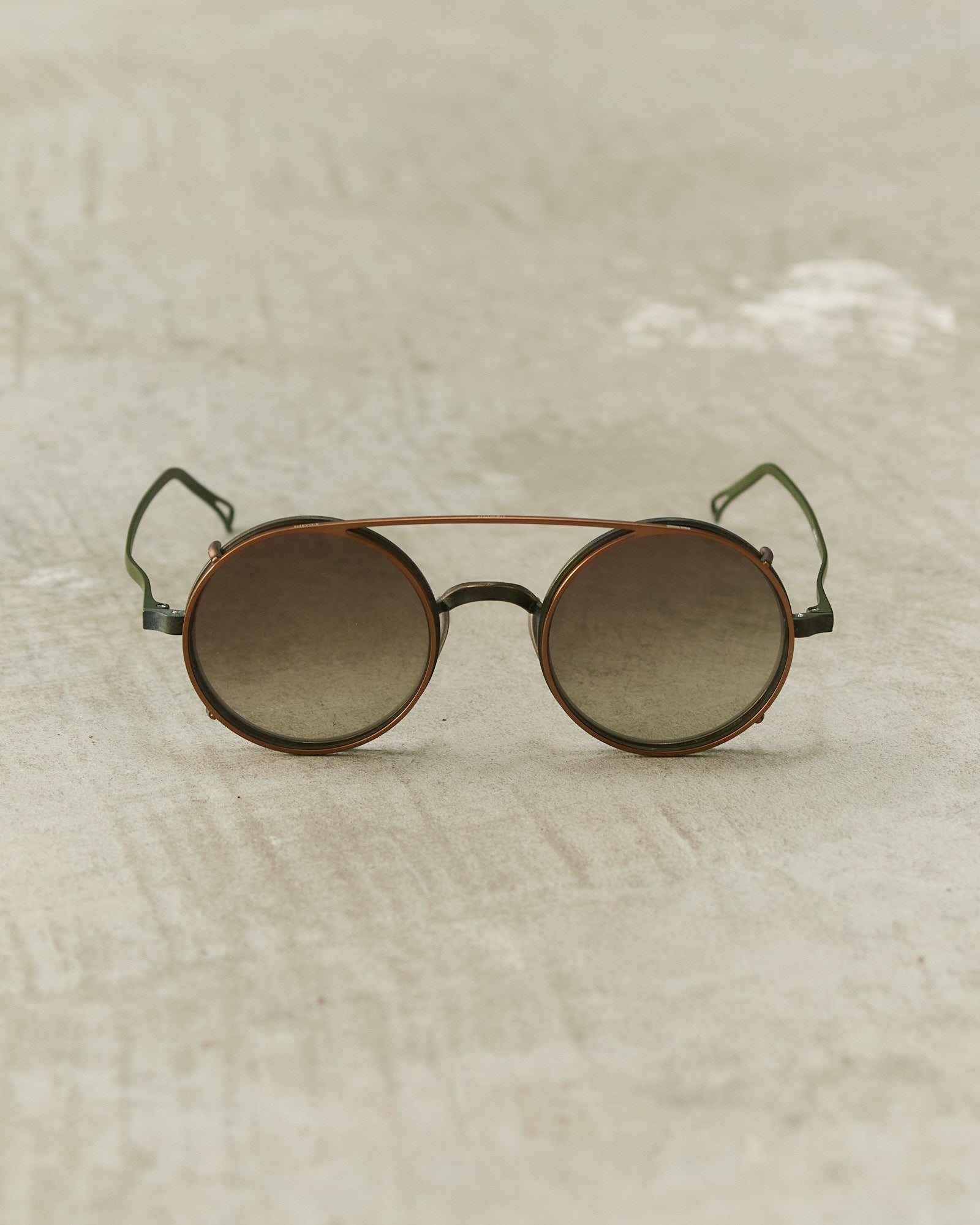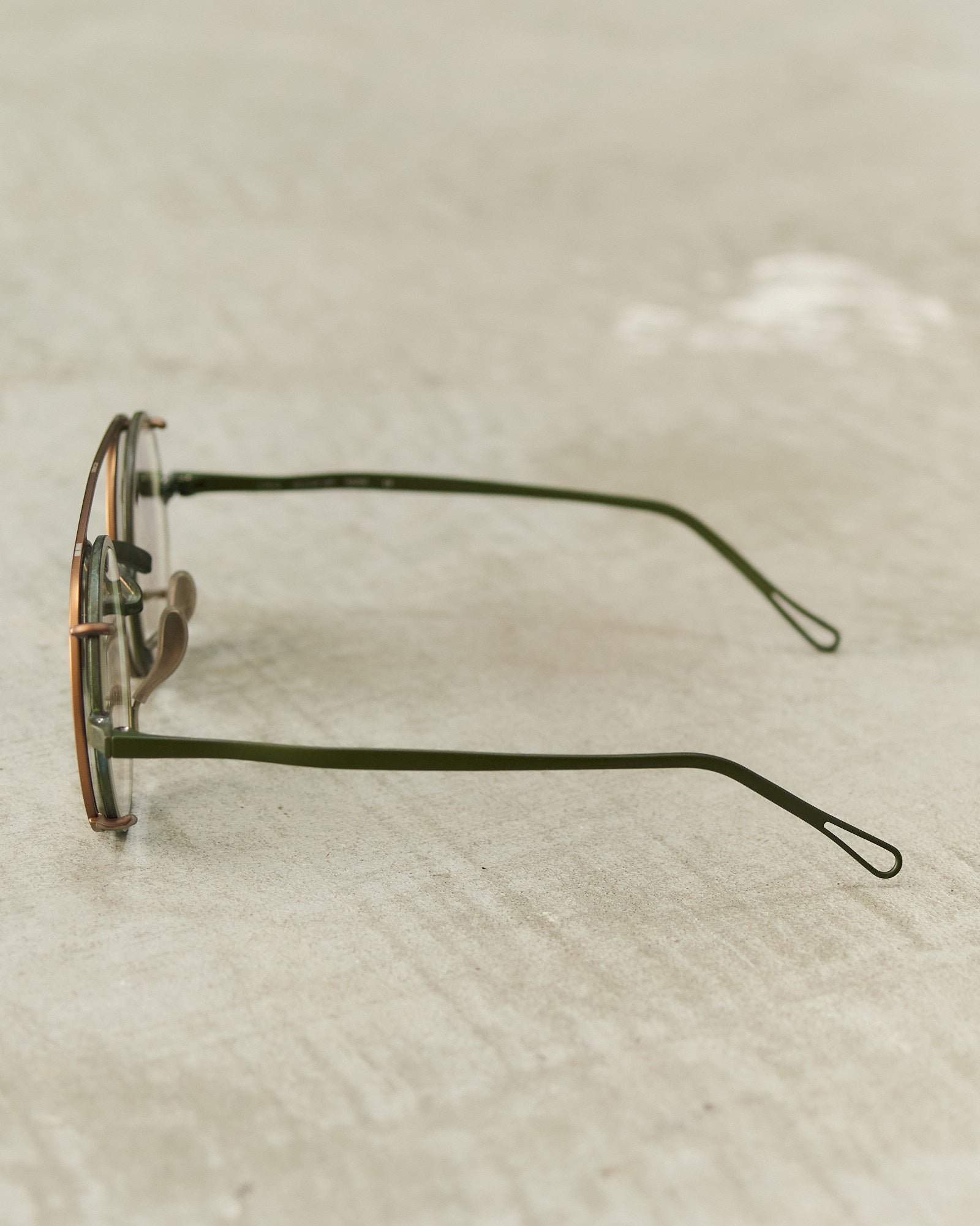 Victorian clip sunglasses by Uma Wang in bronze. Lightweight titanium frames and slender temples in collaboration with Rigards. Distinctive round nylon lenses on bronze clip-ons evoke the refined elegance of 19th-century eyewear, blending historical sophistication with contemporary wearability.