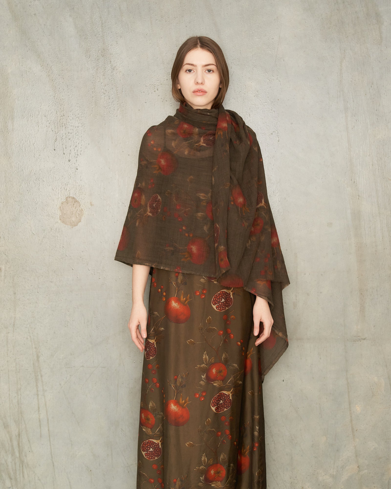 Pomegranate scarf by Uma Wang in brown. Luxurious virgin wool scarf adorned with a painterly pomegranate motif, rendered in subdued hues inspired by traditional Chinese mineral pigments. Soft and warming, generously proportioned for graceful draping or lavish swaddling.