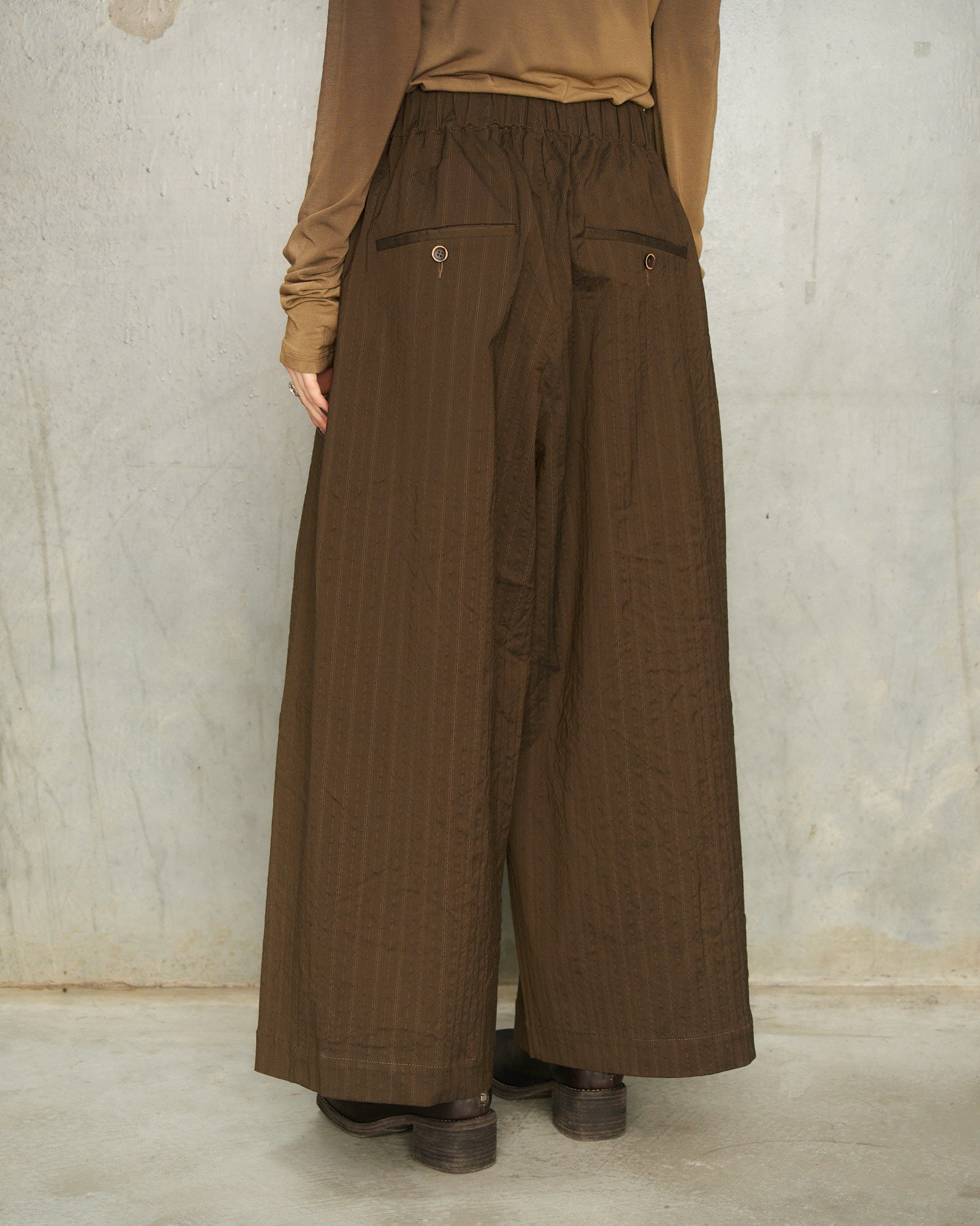 Poetic pants by Uma Wang in brown stripe. Voluminous wool-blend trousers with a gathered elastic waist, buttoned closure and front pleats. Textured stripes add subtle depth and tactile elegance.