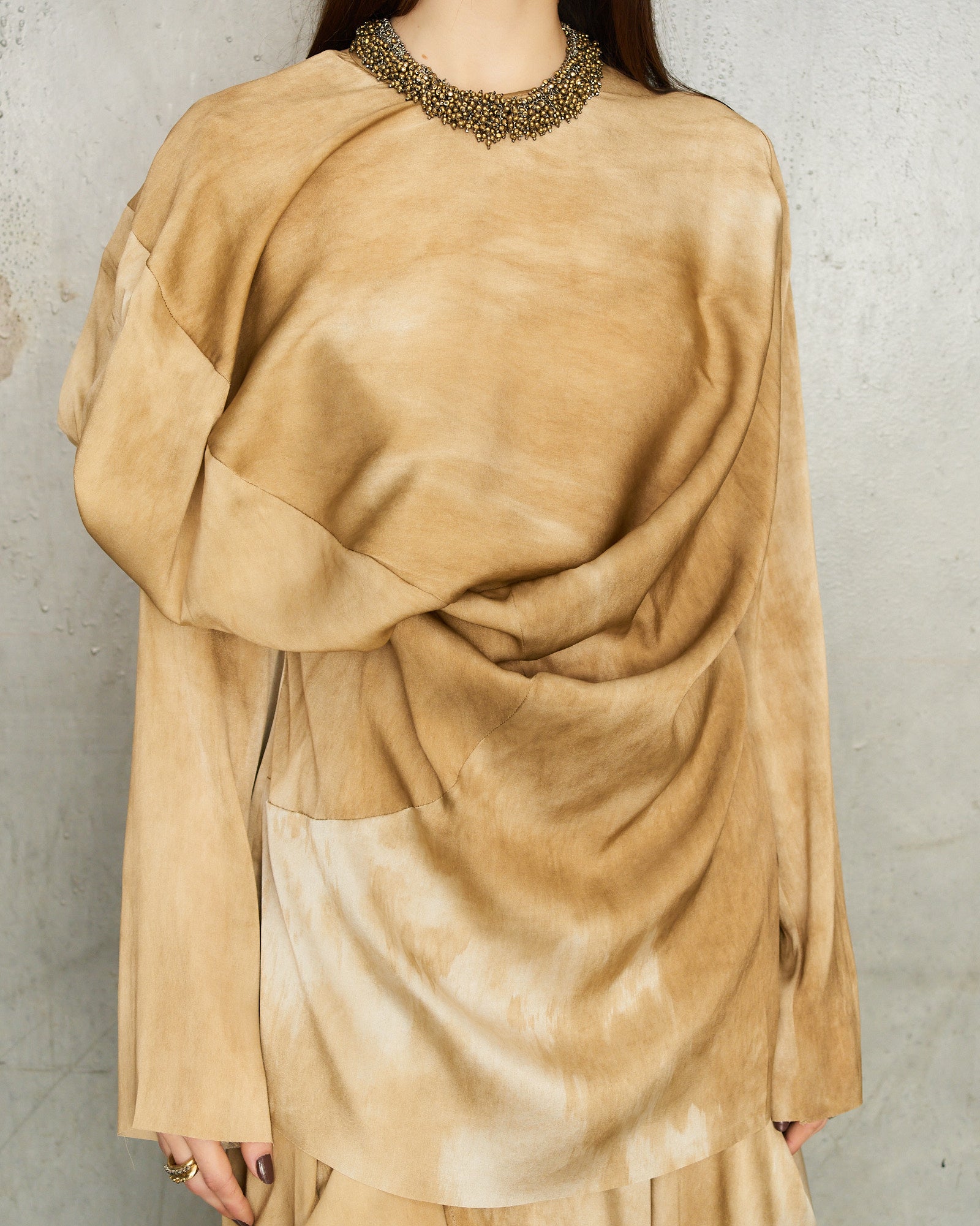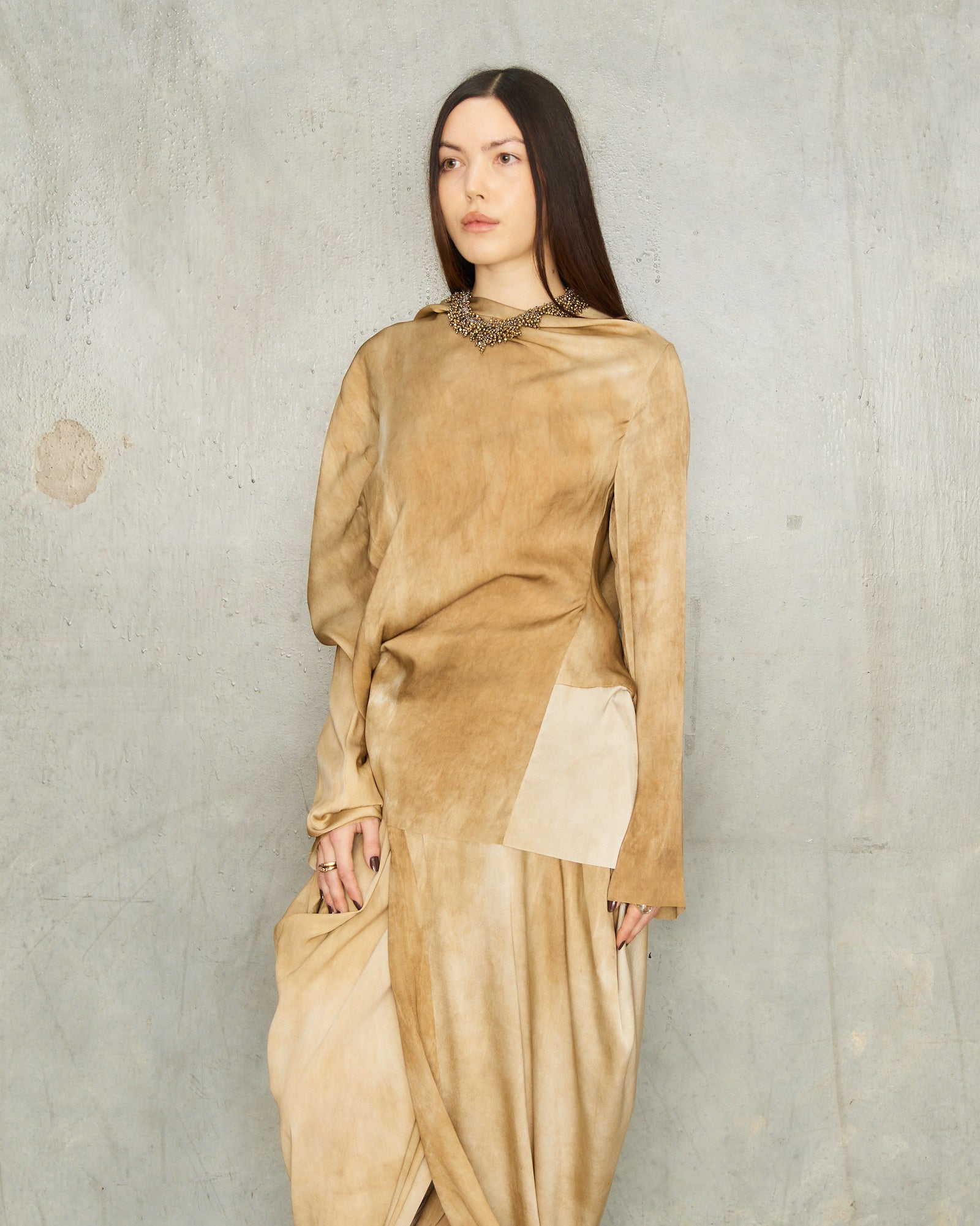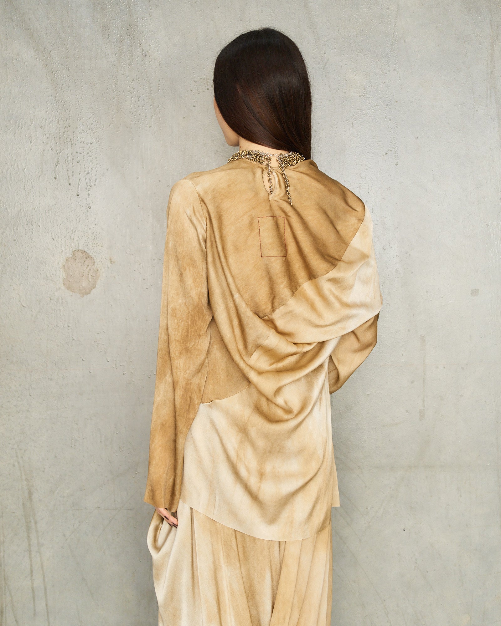 Tavella Trek top by Uma Wang in mustard. Marvellously draped top in a lustrous silk blend that swaddles the bodice with dynamic movement. Irregular panels converge to reveal artisanal hand-dyed variations across the fabric.