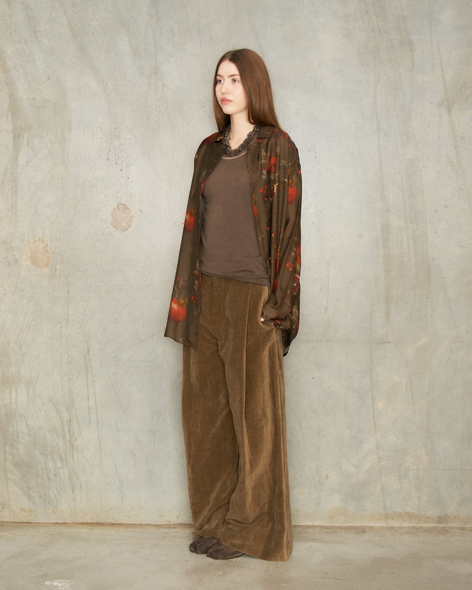 Pudding pants by Uma Wang in mustard velvet. High-waisted trousers in plush velvet, tailored at the waist with front pleats that fall to a sweeping wide leg. Rendered in a rich mustard-brown, they wear effortlessly and with a comfortable grace.