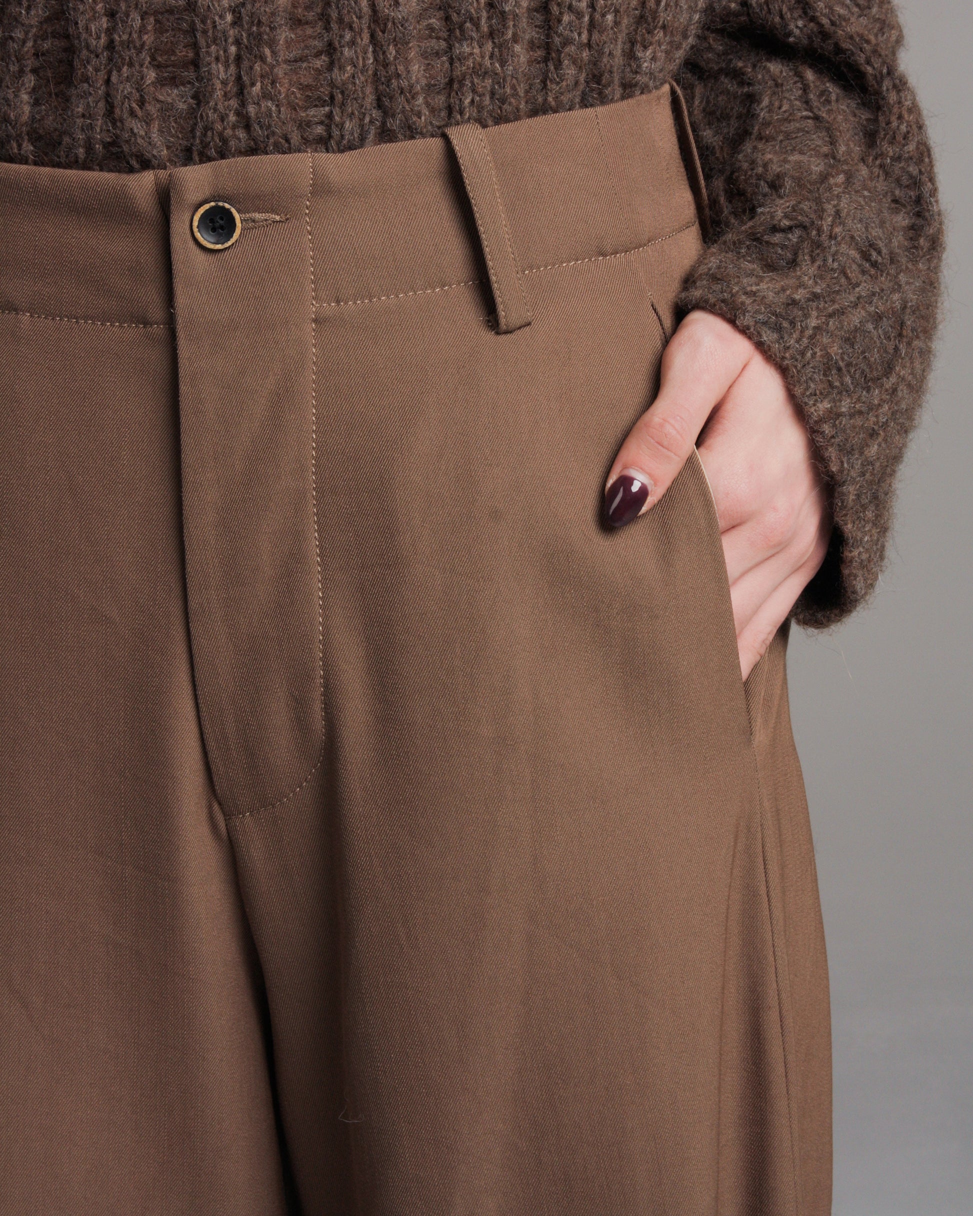 Dip dyed Phyllis pants by Uma Wang. Baggy fitting tailored trousers in a smooth wool and cotton blend. Dip dyed along the hem in a visceral blood red. Four pocket styling with button fly closure.