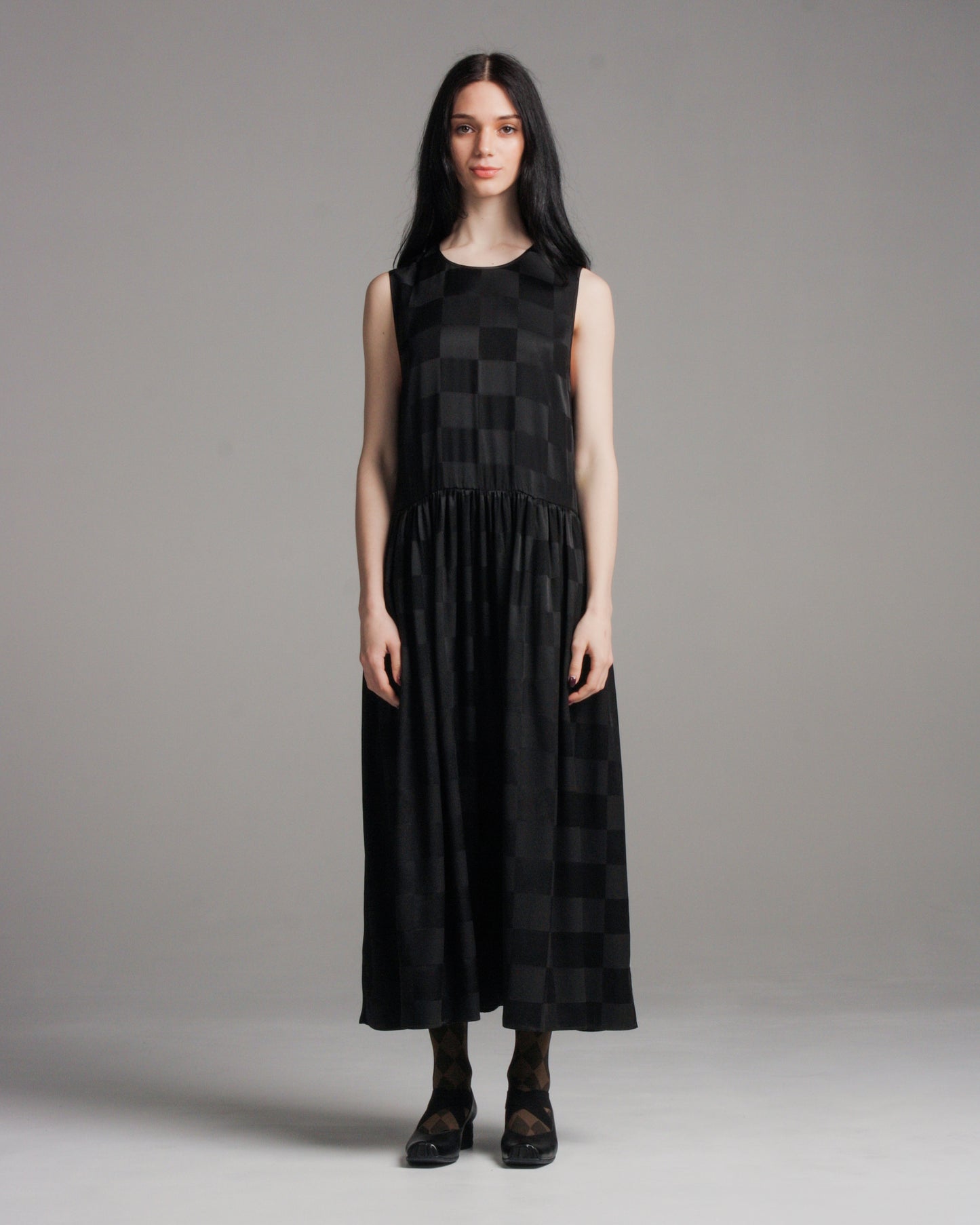Ardal dress by Uma Wang. Tank dress in expressively flowing silk. Dark and satiny checkered pattern complements a voluminously pleated dropped waist.