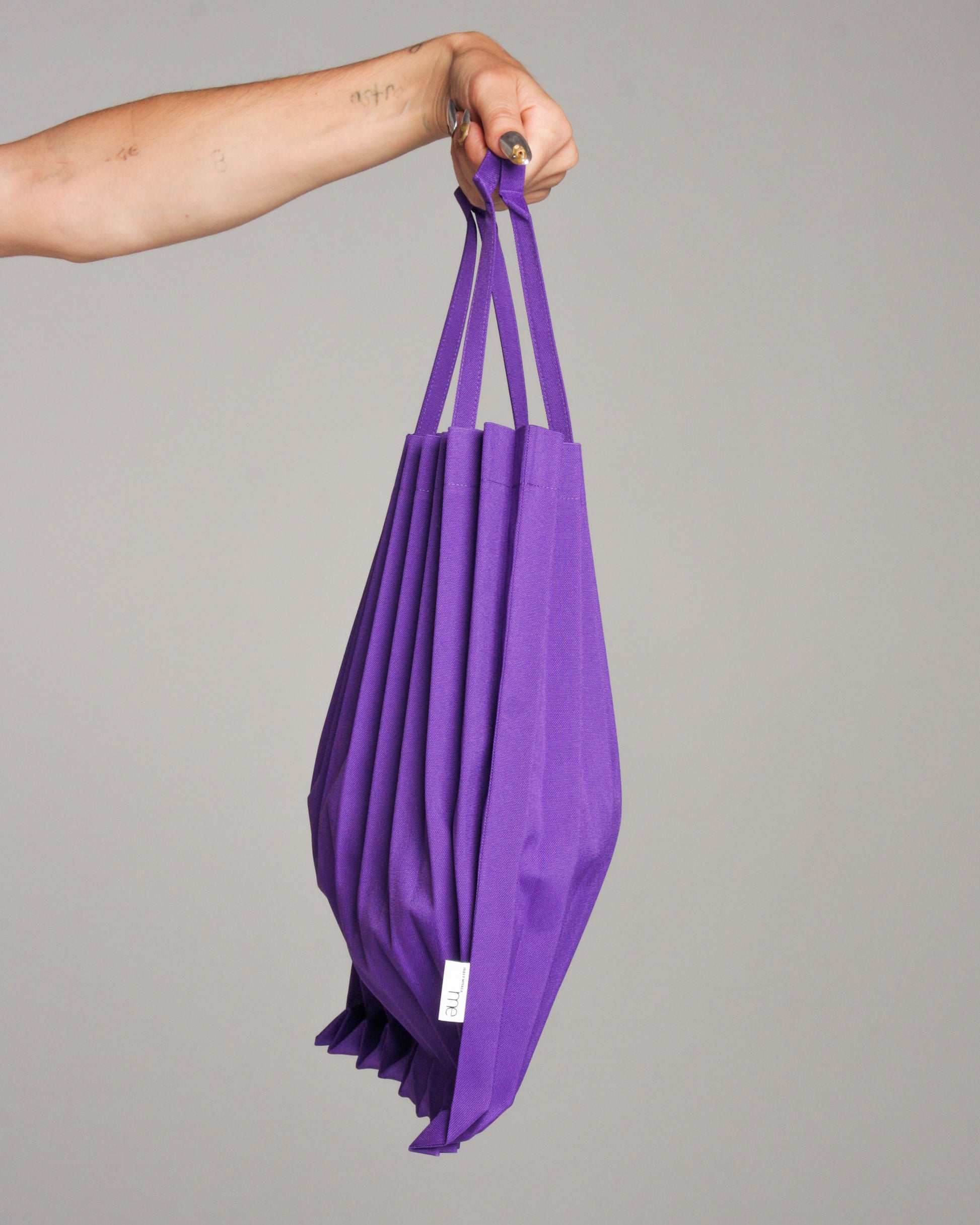 Trunk pleats bag by Issey Miyake ME in violet. Accordion pleated tote with origami-like folds at the base. Opens to a generous capacity with dual pleated straps. Available in a range of whimsical colours.