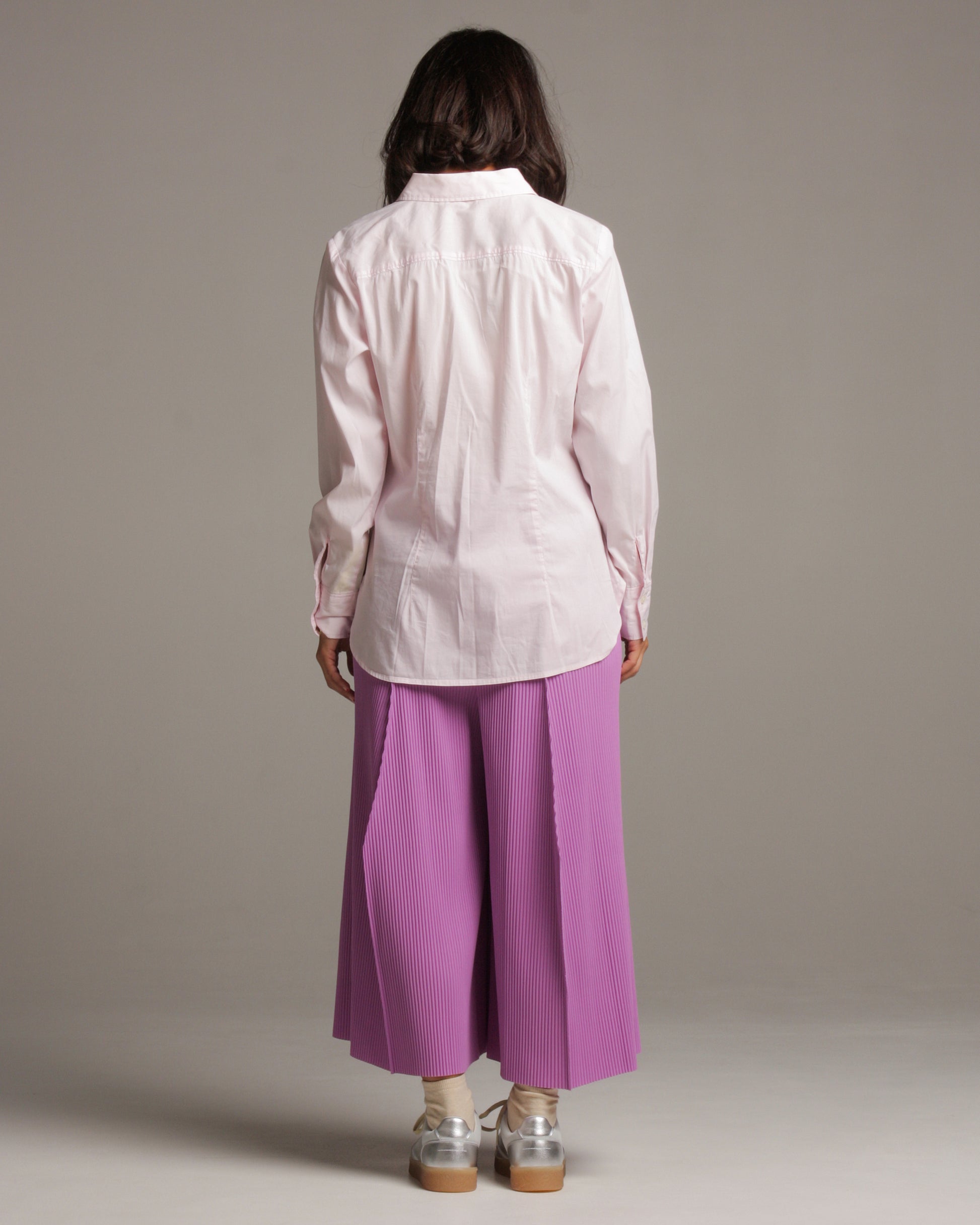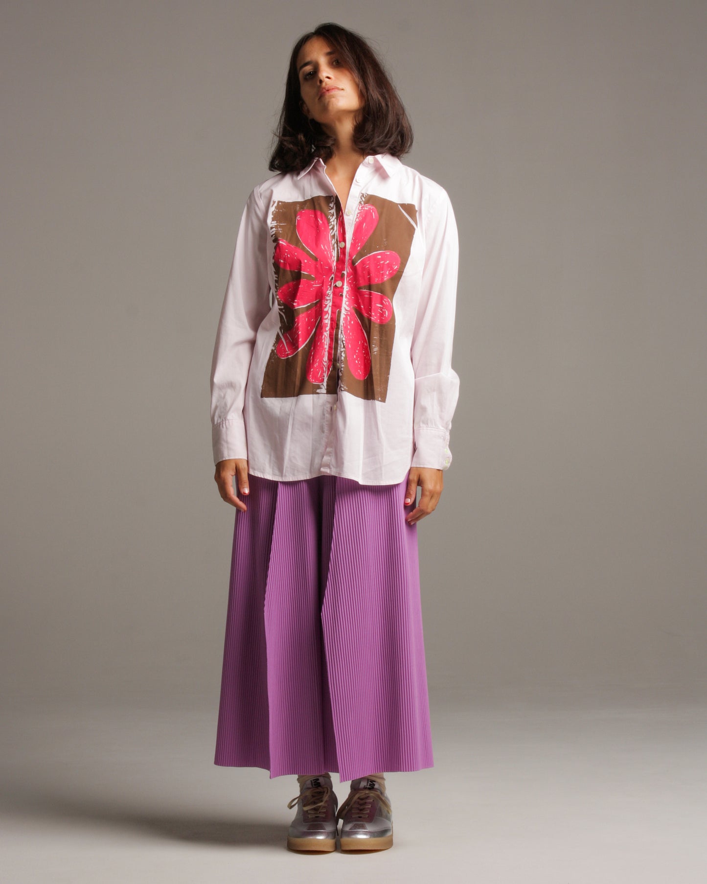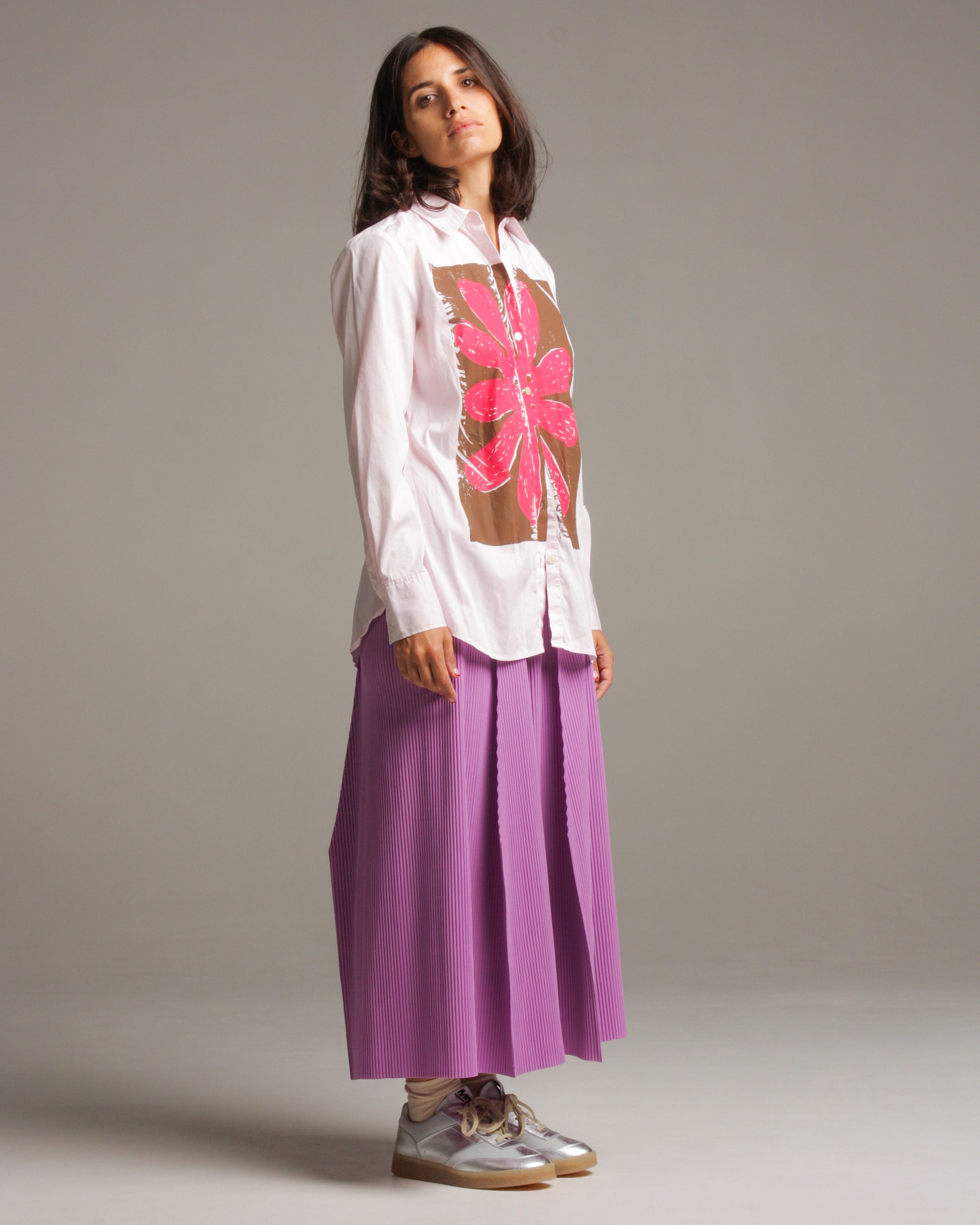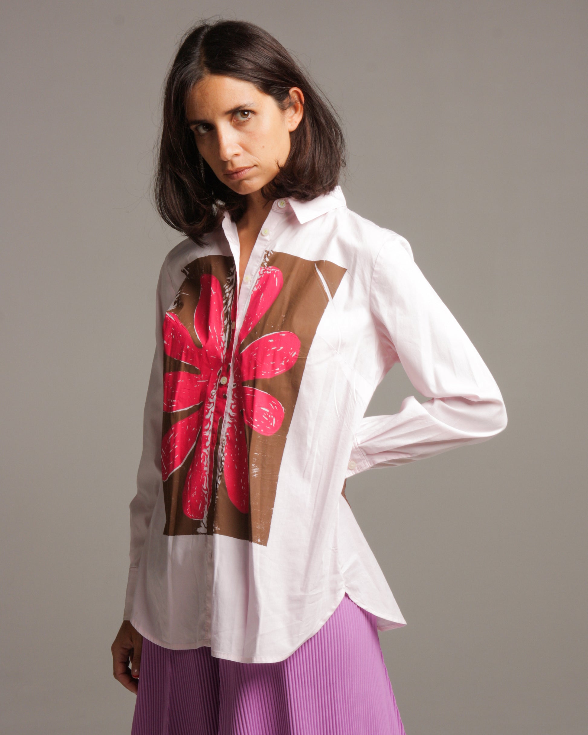 "Wassim" shirt by Mariaan Pugh in pink with brown and hot pink flower screen print.