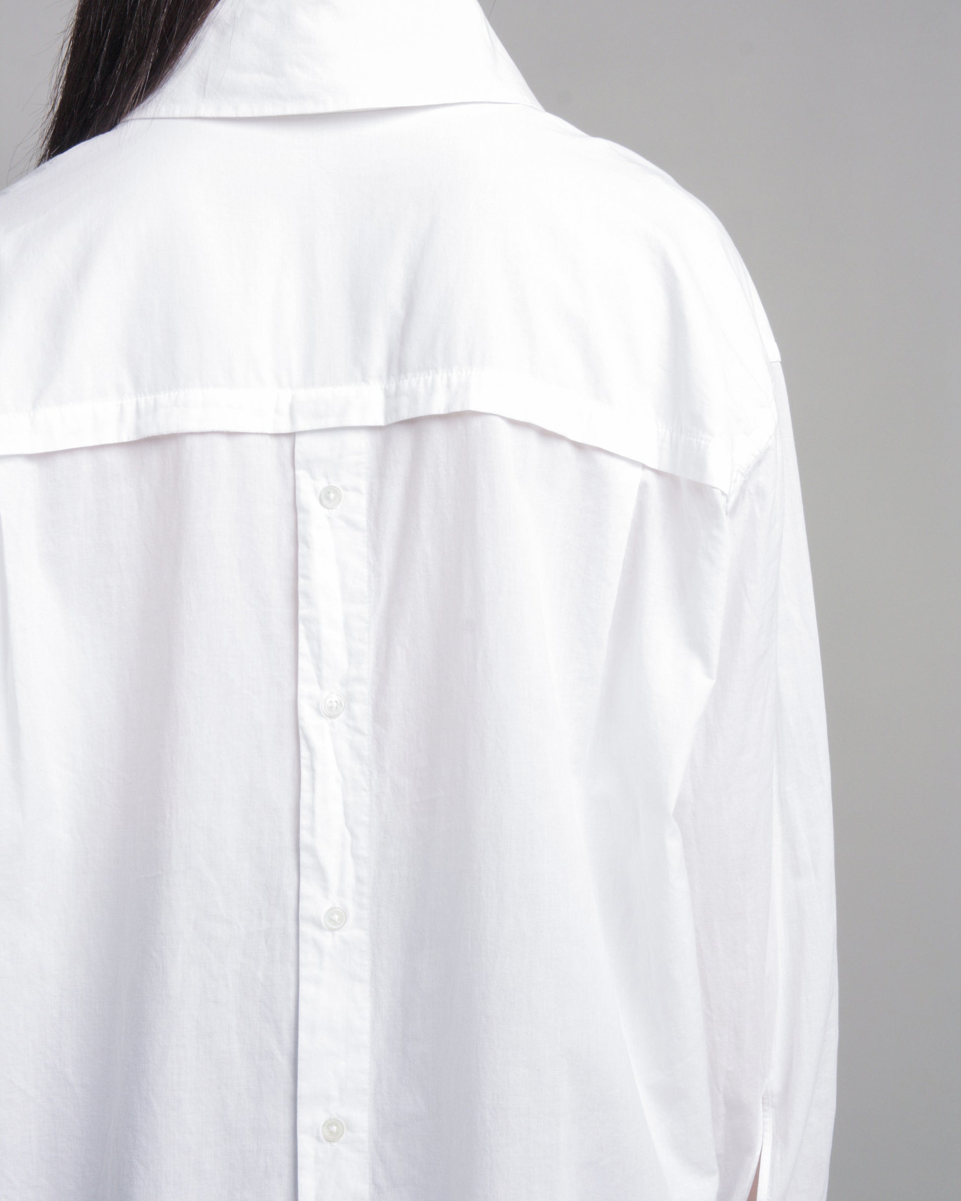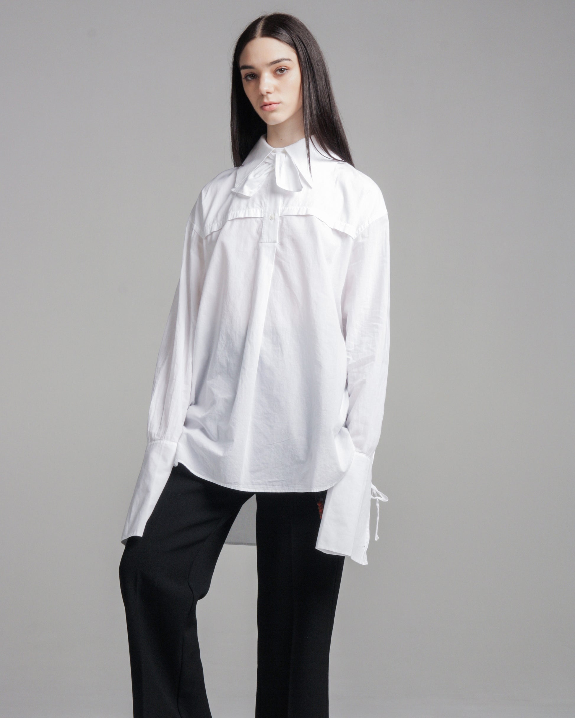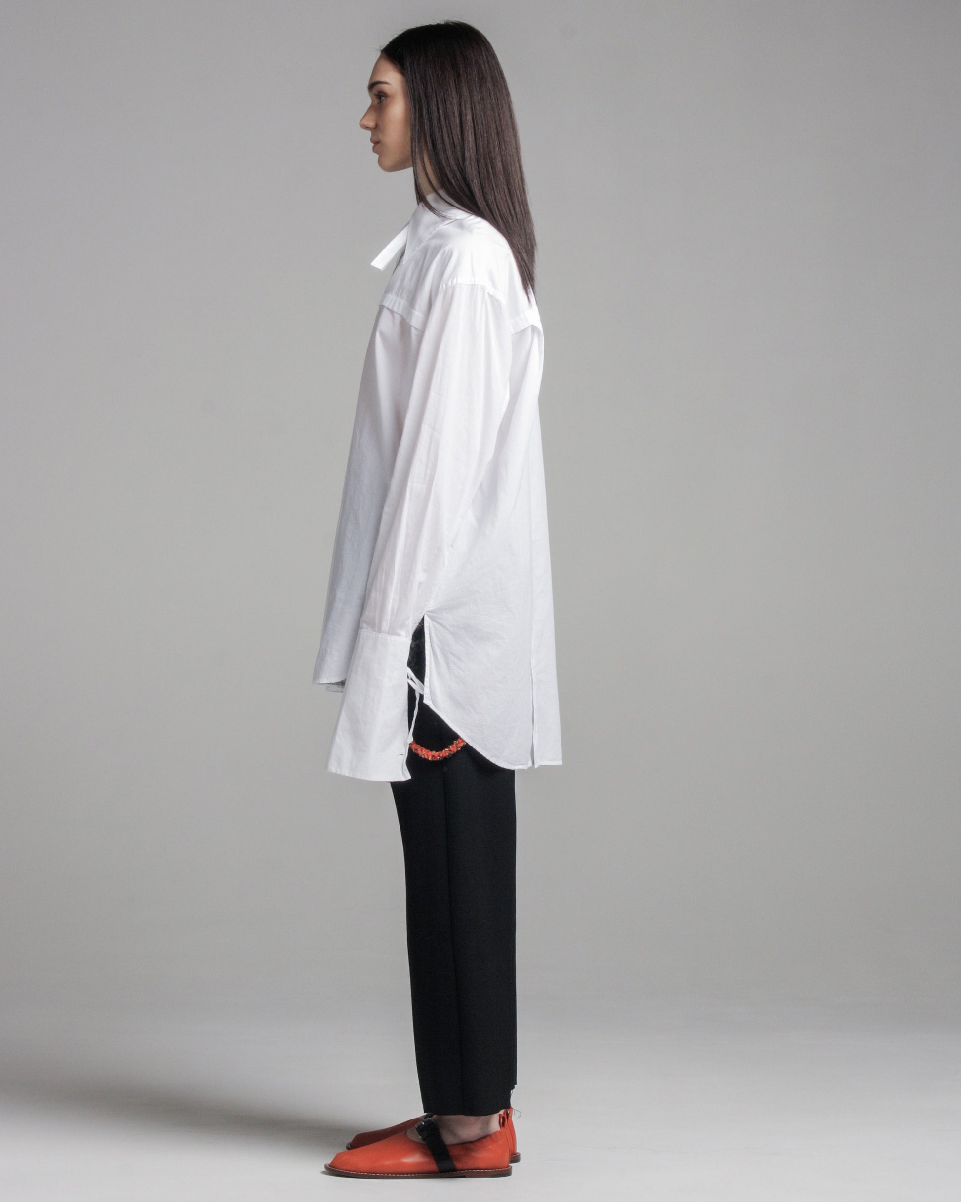 Oversized white cotton shirt by Ann Demeulemeester. Features intriguing design details such discontinued button-stands in the front and back, classic collar with tie detail and exagerrated cuffs with ties.