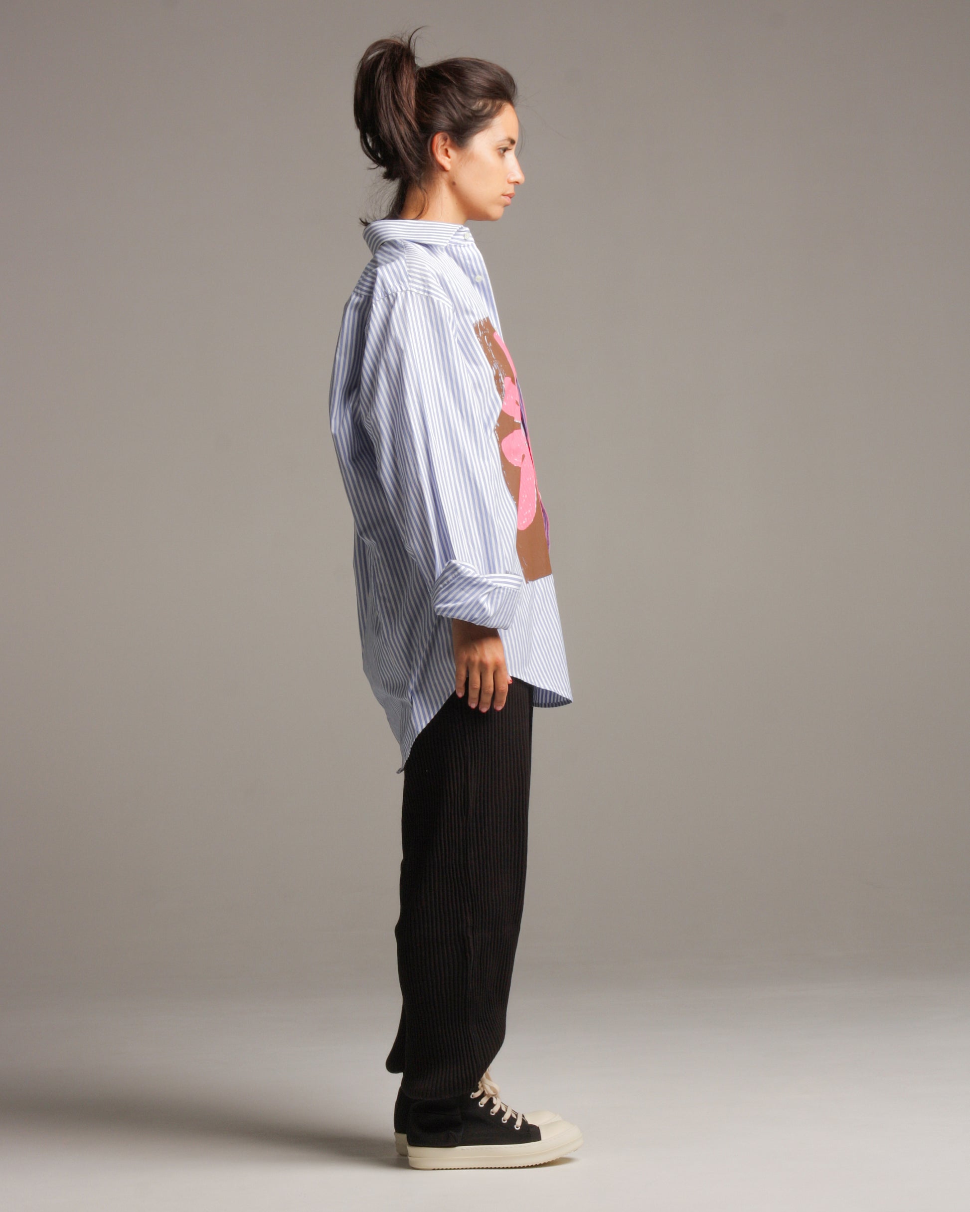 "William" shirt by Mariaan Pugh in light blue stripe with brown and pink flower screen print.