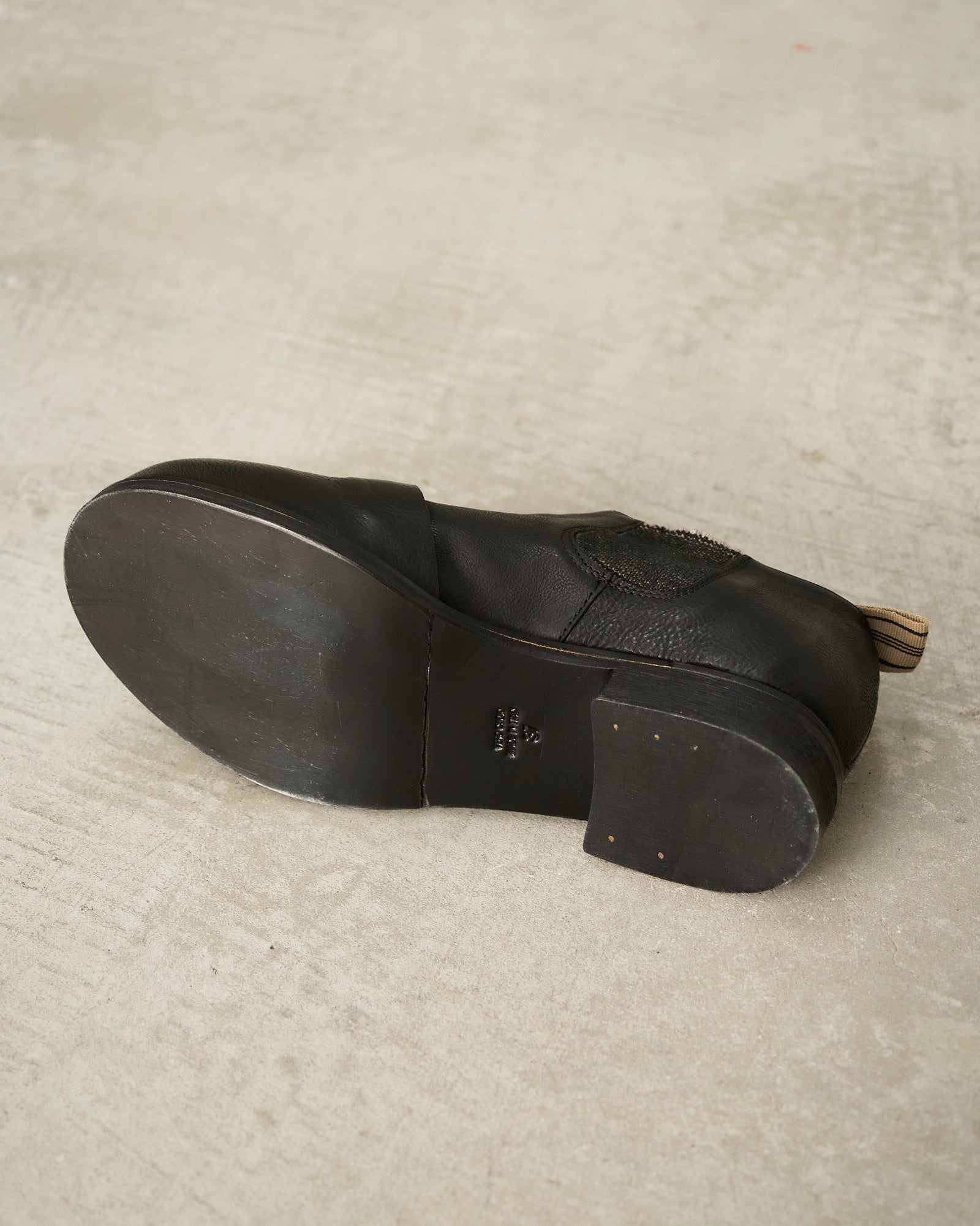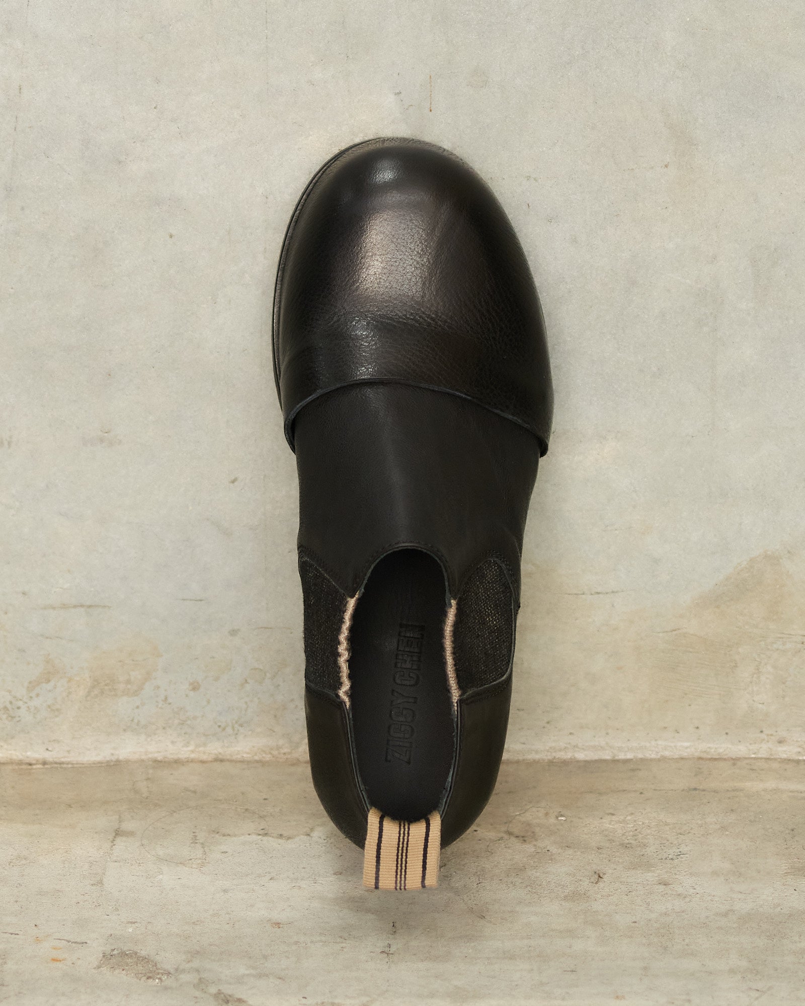 Half boots by Ziggy Chen in black leather. Low-cut boots crafted from richly grained leather with a distinctive half-cut vamp. Elastic gussets at both sides ensure a snug fit, finished with the designer’s signature striped grosgrain pull tab at the heel.